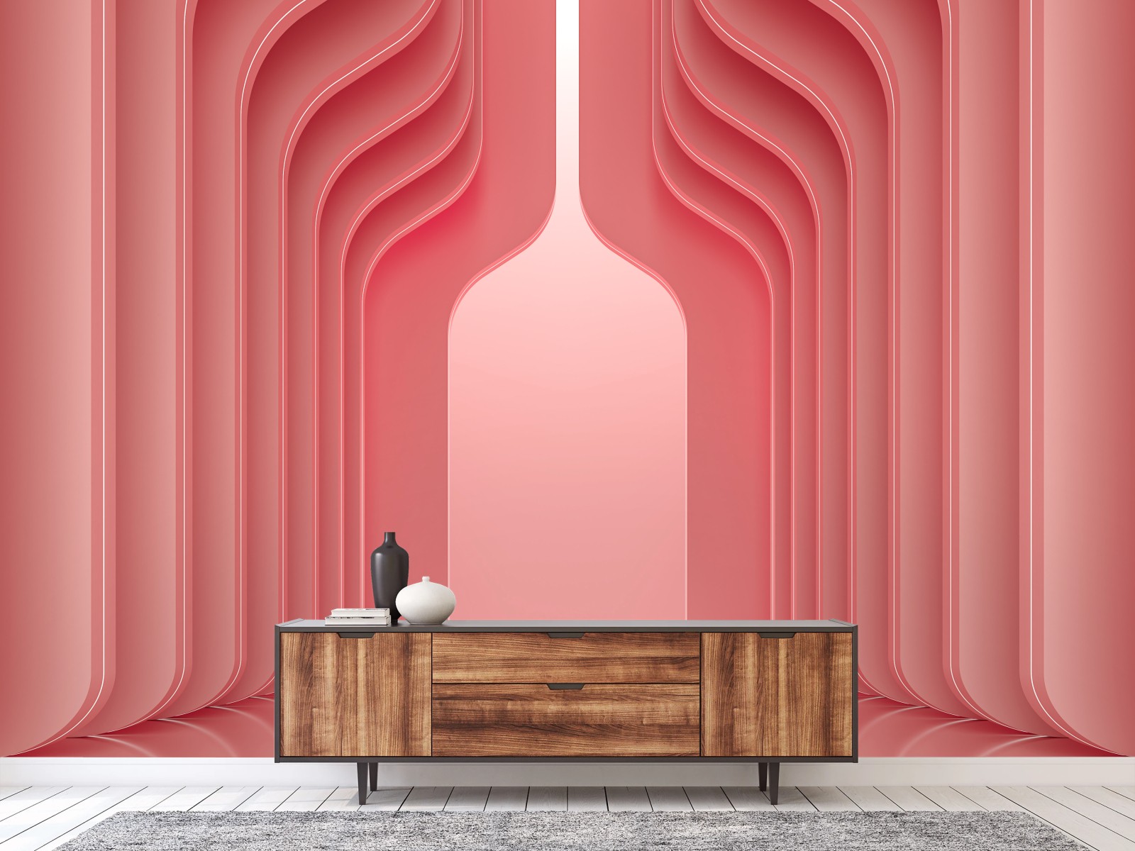 - minimalistyczny design, geometryczny wzór, pastelowa paleta, koralowy różowy, 3d wnętrze, nowoczesna abstrakcja, architektoniczne łuki, luksusowa dekoracja, tapeta koncepcja, miękkie kształty