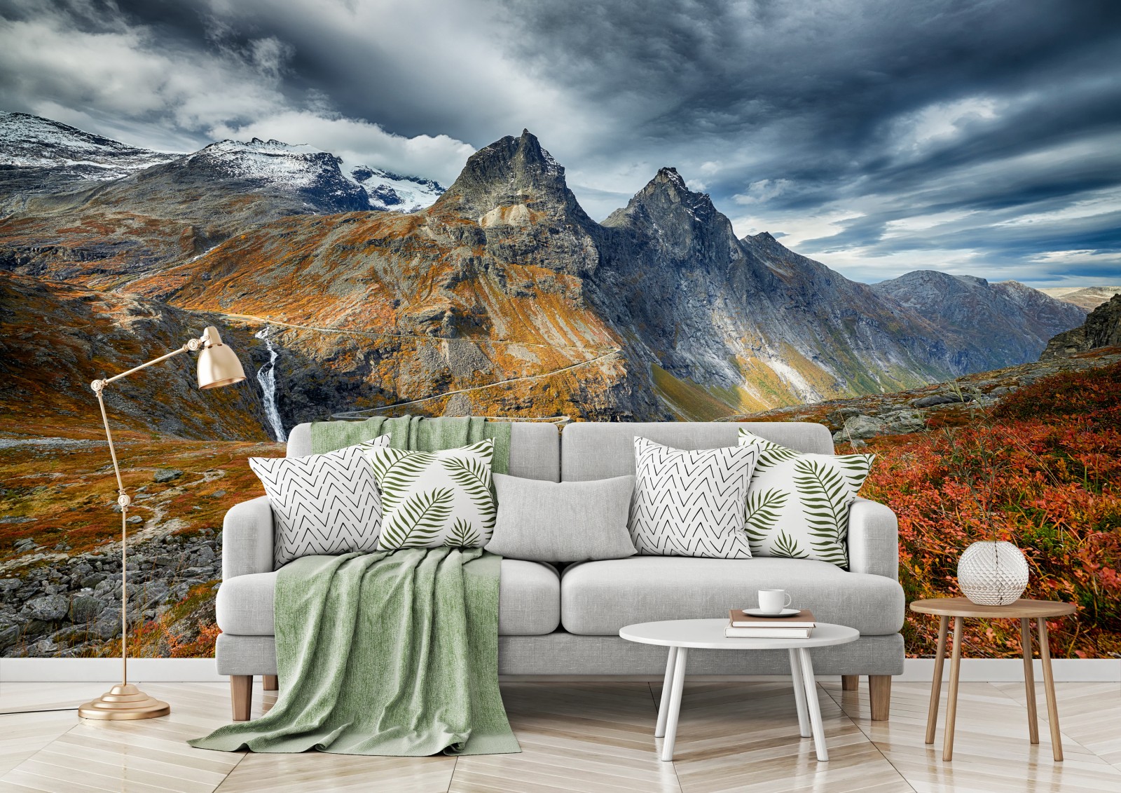 Fototapeta Jesienny krajobraz górski z wodospadem i wijącą się drogą