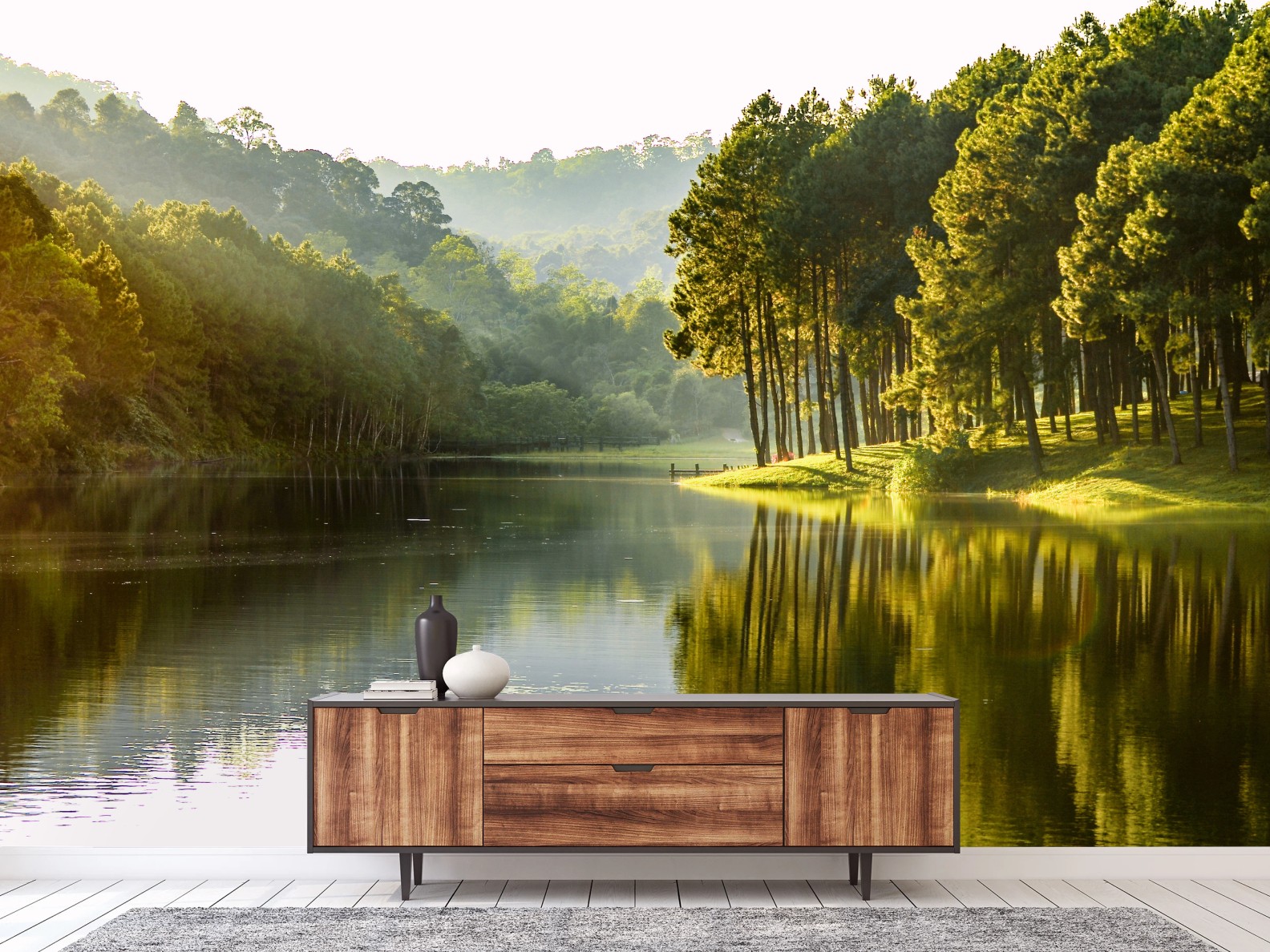 Fototapeta Spokojny las sosnowy nad cichym jeziorem