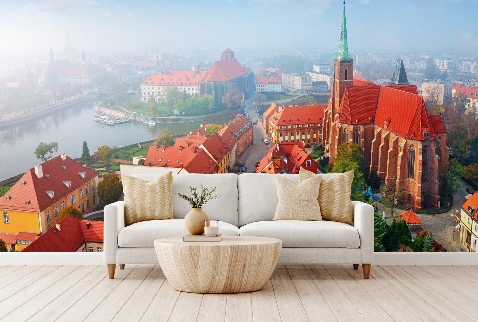 Fototapeta Mglista panorama europejskiego miasta z czerwonymi dachami