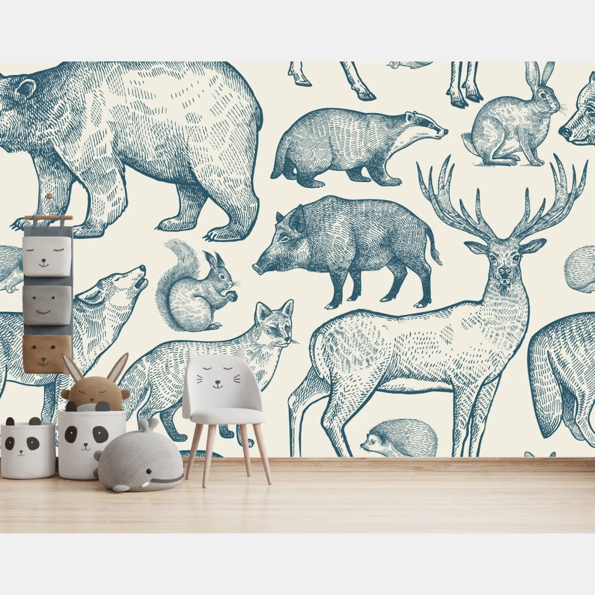 - wzór bezszwowy, jeleń, niedźwiedź, wiewiórka, zwierzęta leśne, jeż, wzór leśny, wzór vintage, grafika rytowana, lisa
