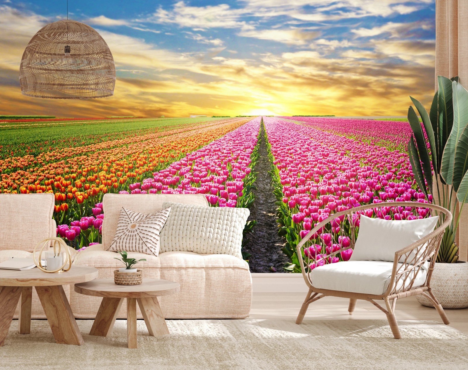 Fototapeta Wschód słońca nad polami tulipanów w Holandii