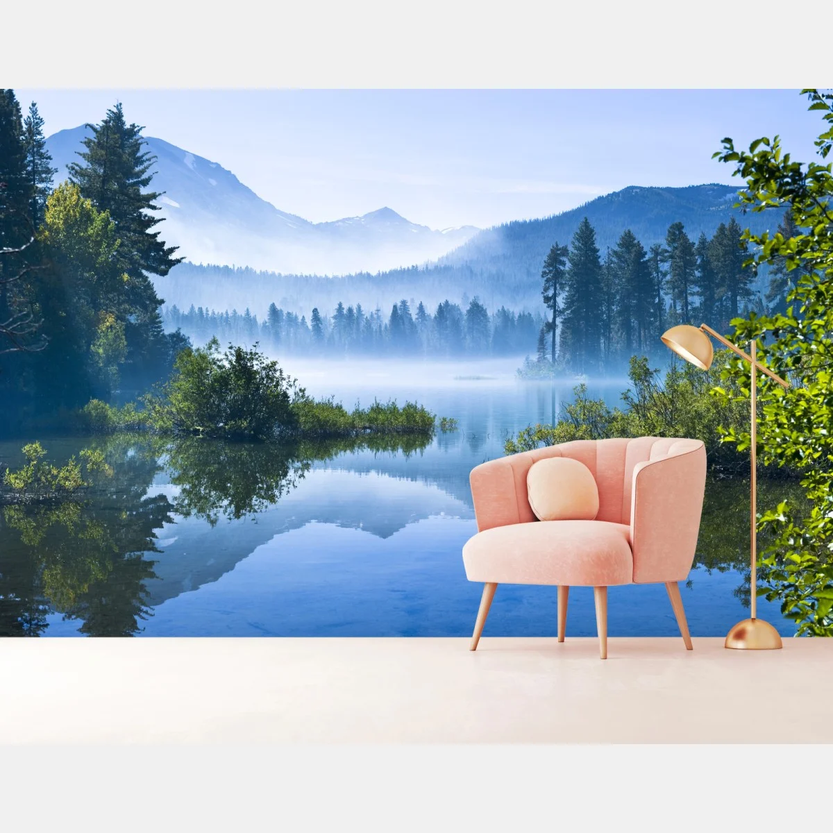 Fototapeta Mglista górska tafla jeziora z odbiciem
