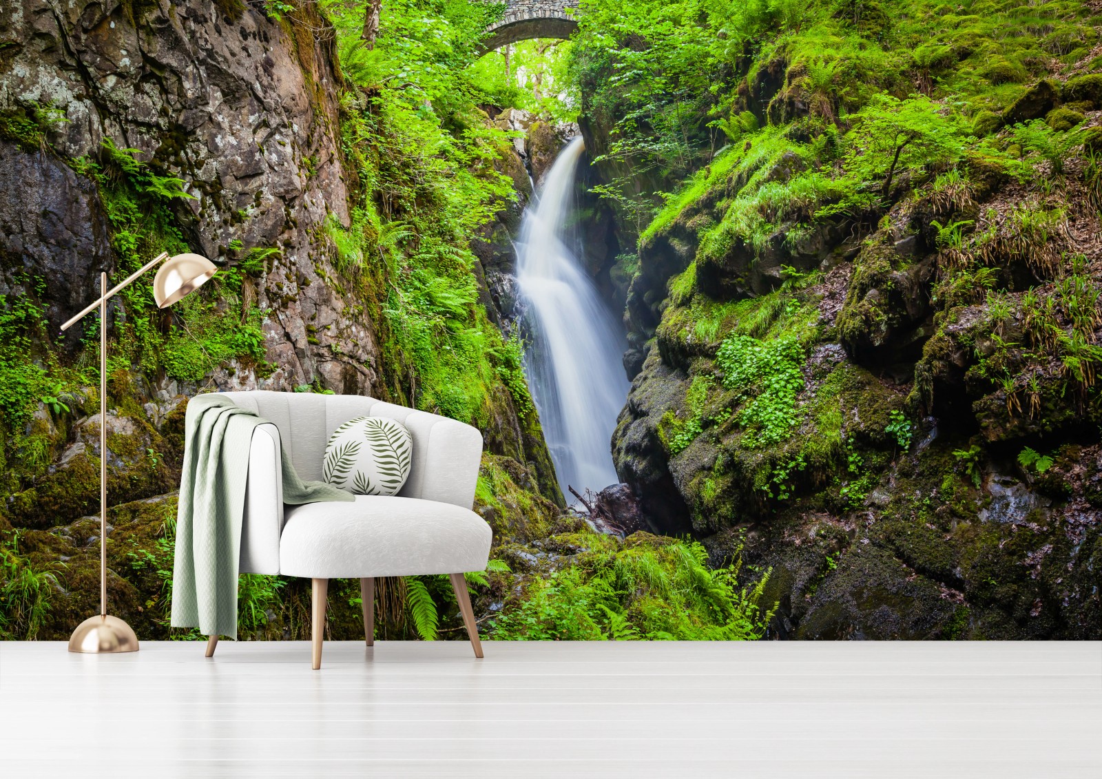 Fototapeta Wodospad w mchem porośniętym wąwozie z kamiennym mostem