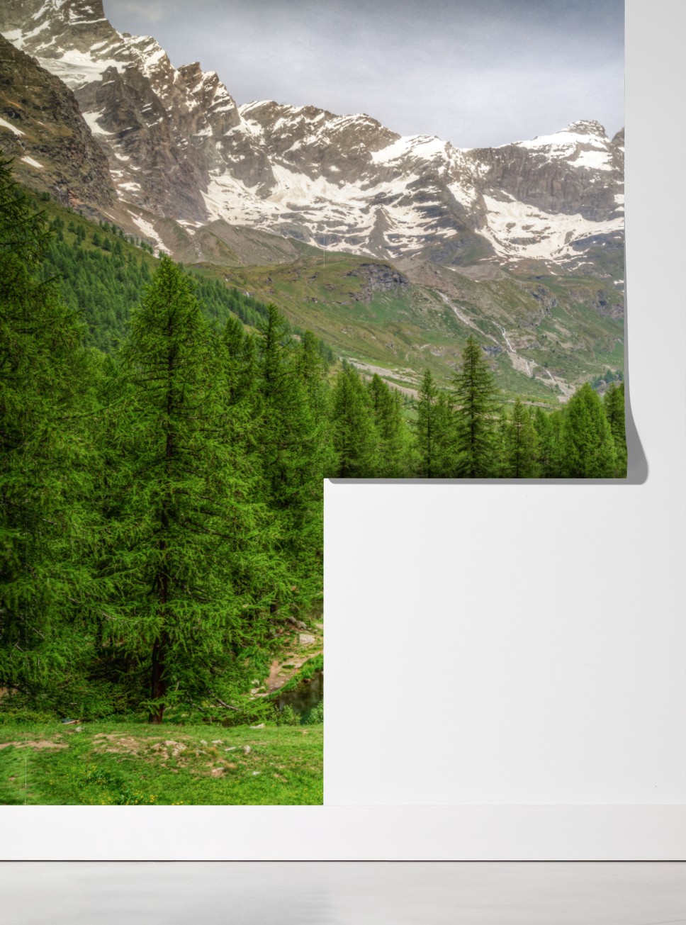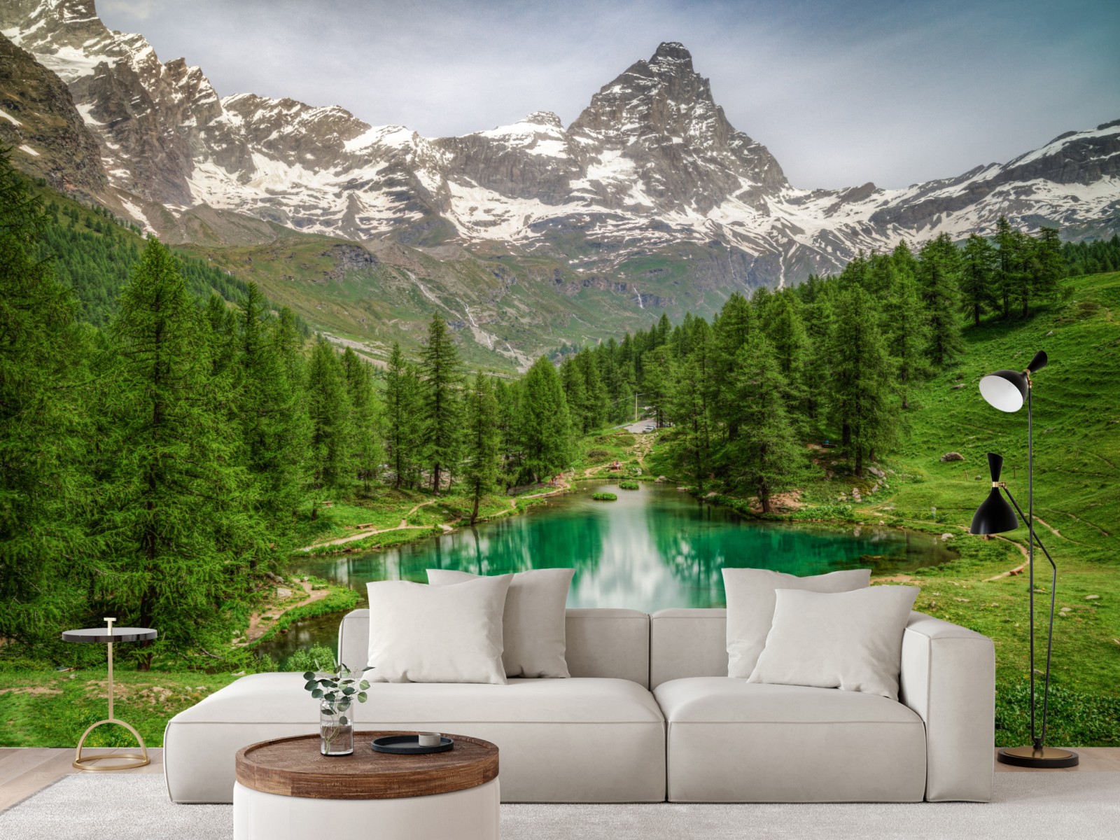 Wprowadź spokój alpejskiego krajobrazu do swojego wnętrza dzięki temu widokowi turkusowego jeziora otoczonego sosnowym lasem i ośnieżonymi szczytami.