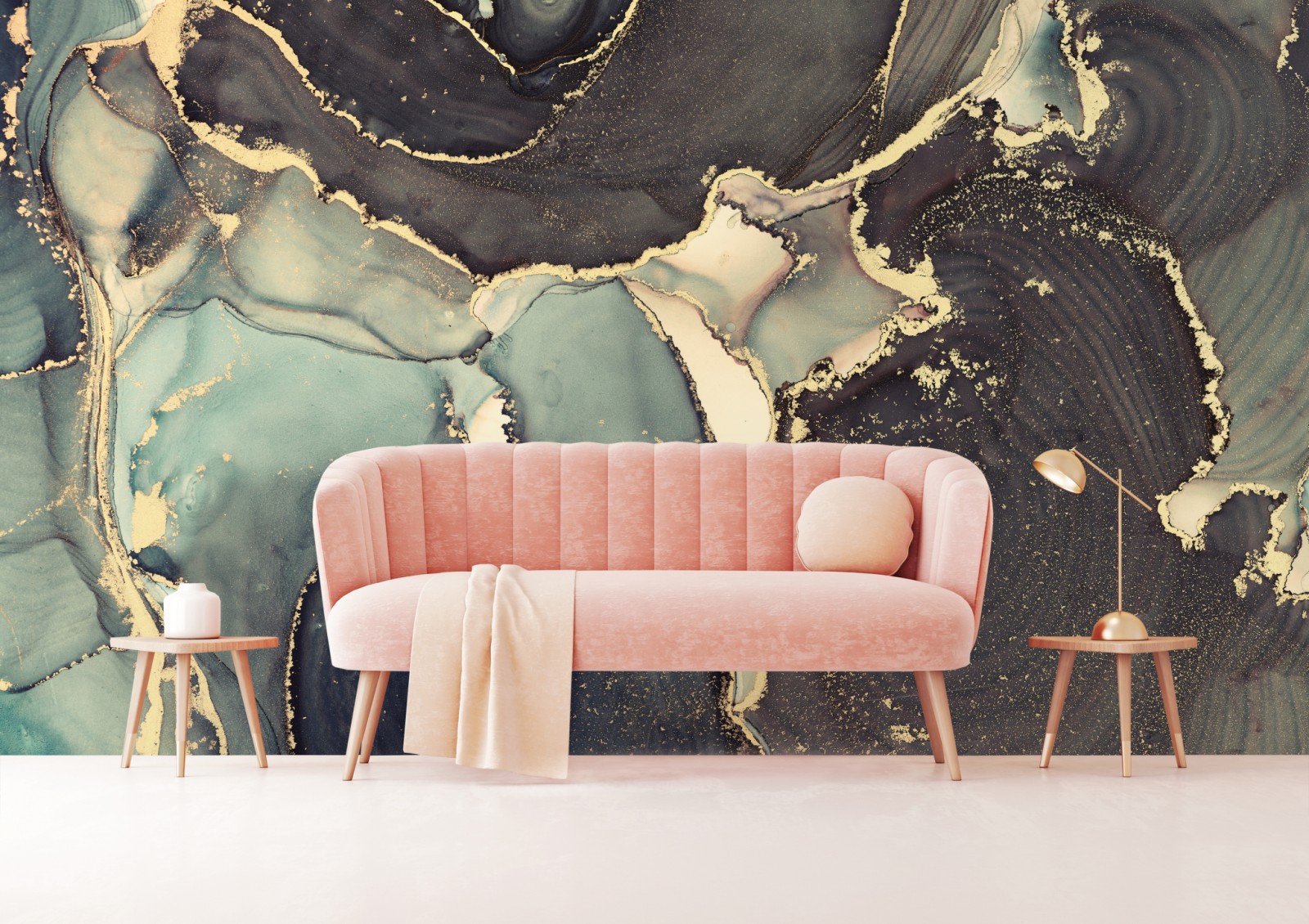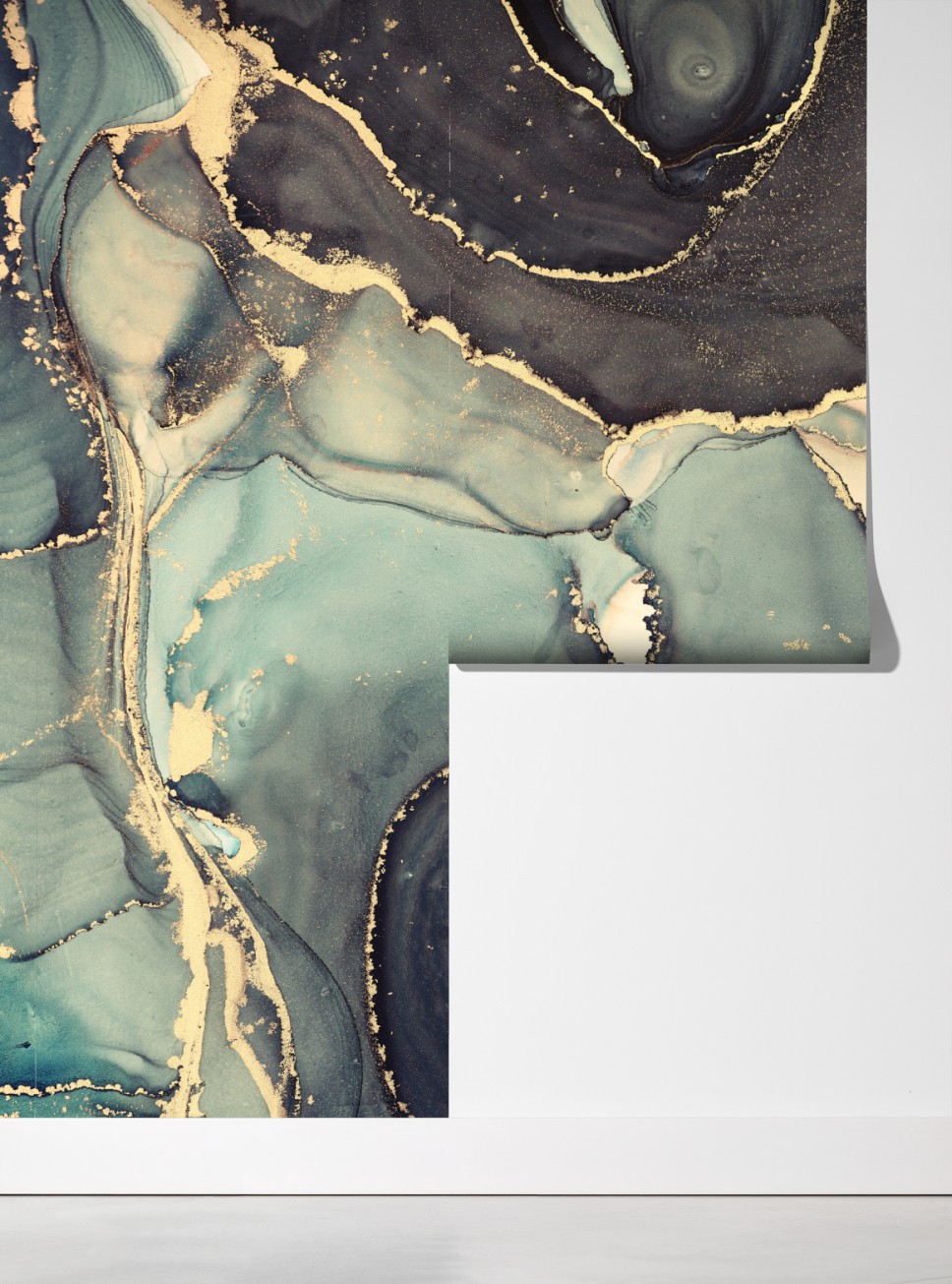 Elegancka turkusowo-złota abstrakcja wprowadza marzycielski, luksusowy nastrój do wnętrza.
