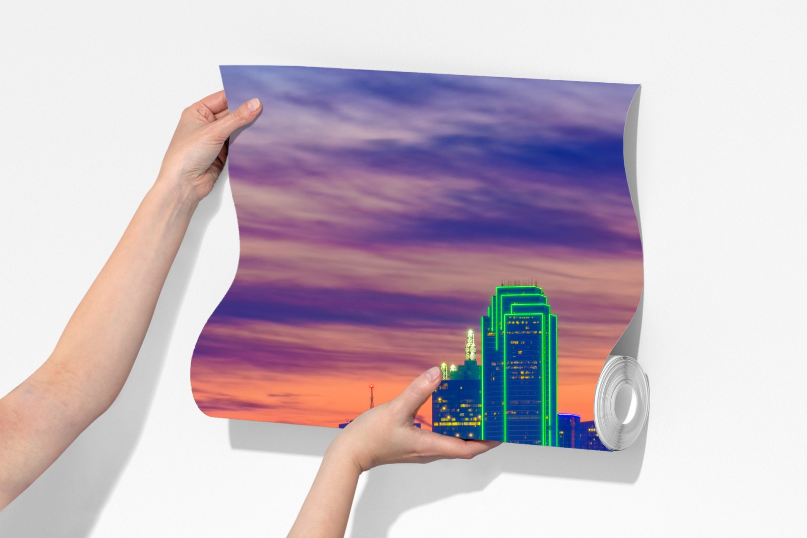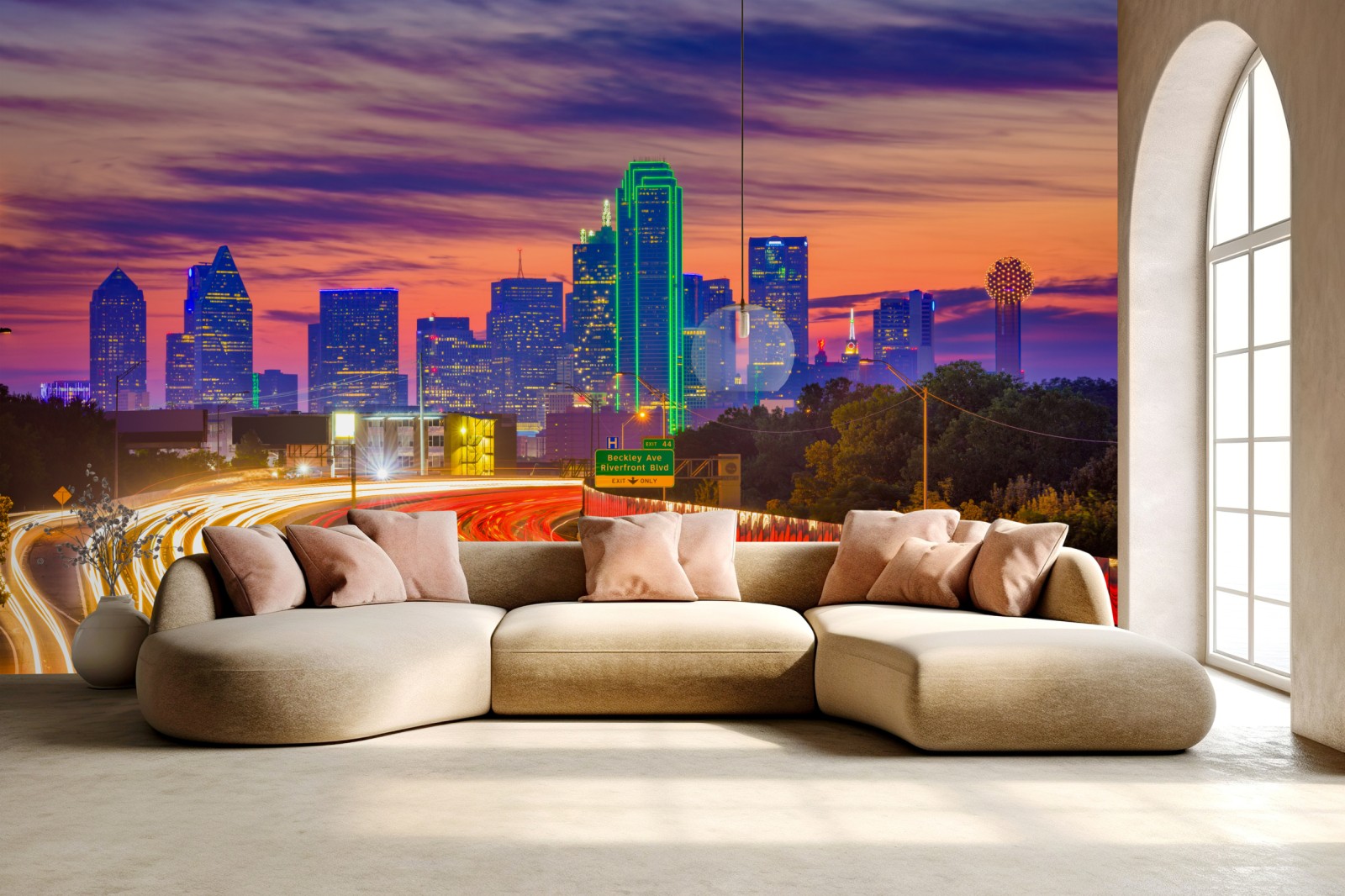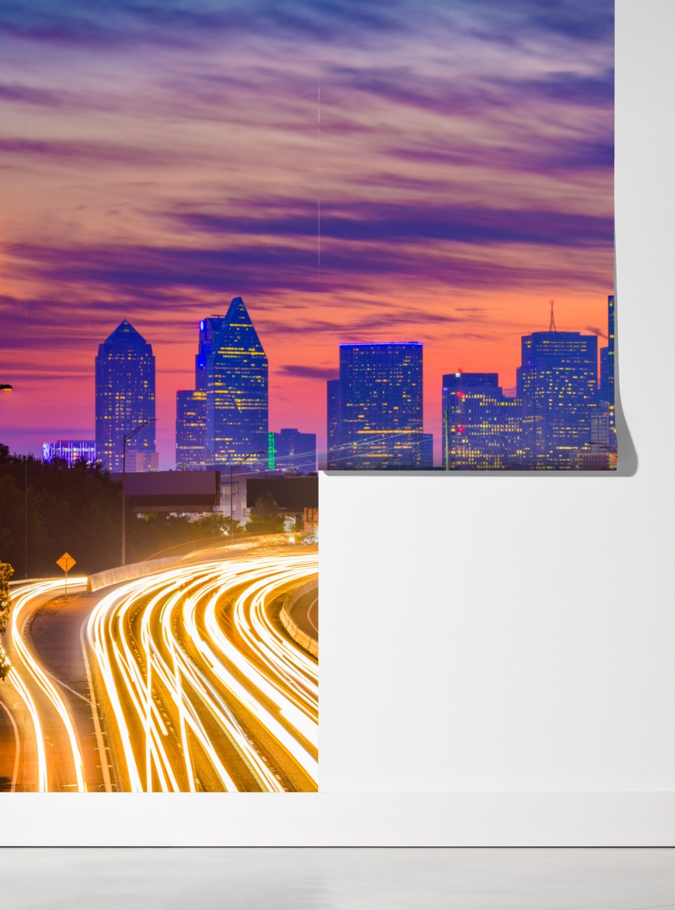 Poczuj tętno życia Dallas o zmierzchu dzięki rozciągającym się świetlnym smużkom na autostradzie i rozświetlonym wieżowcom, idealne do wnętrz o miejskim charakterze.