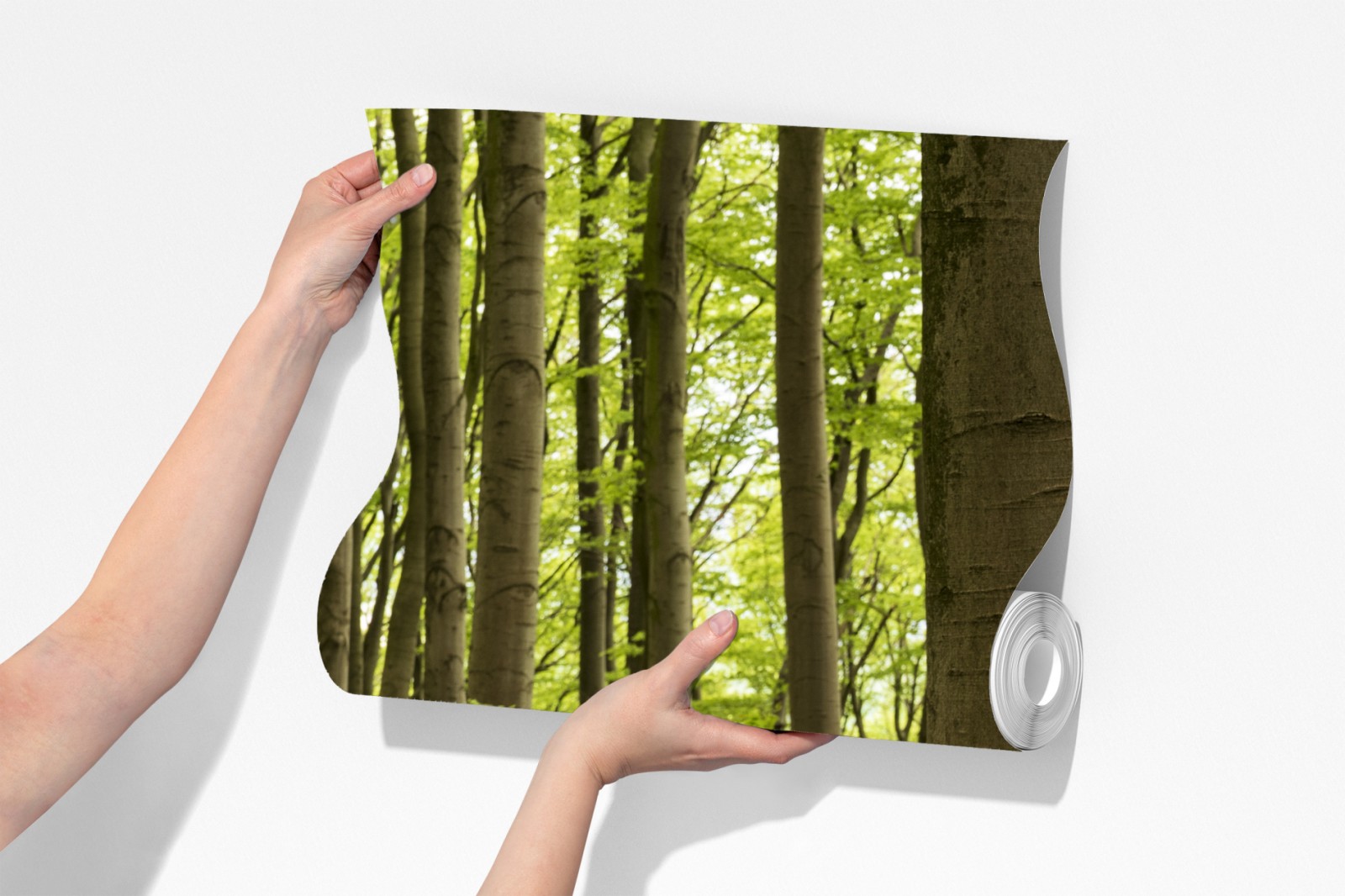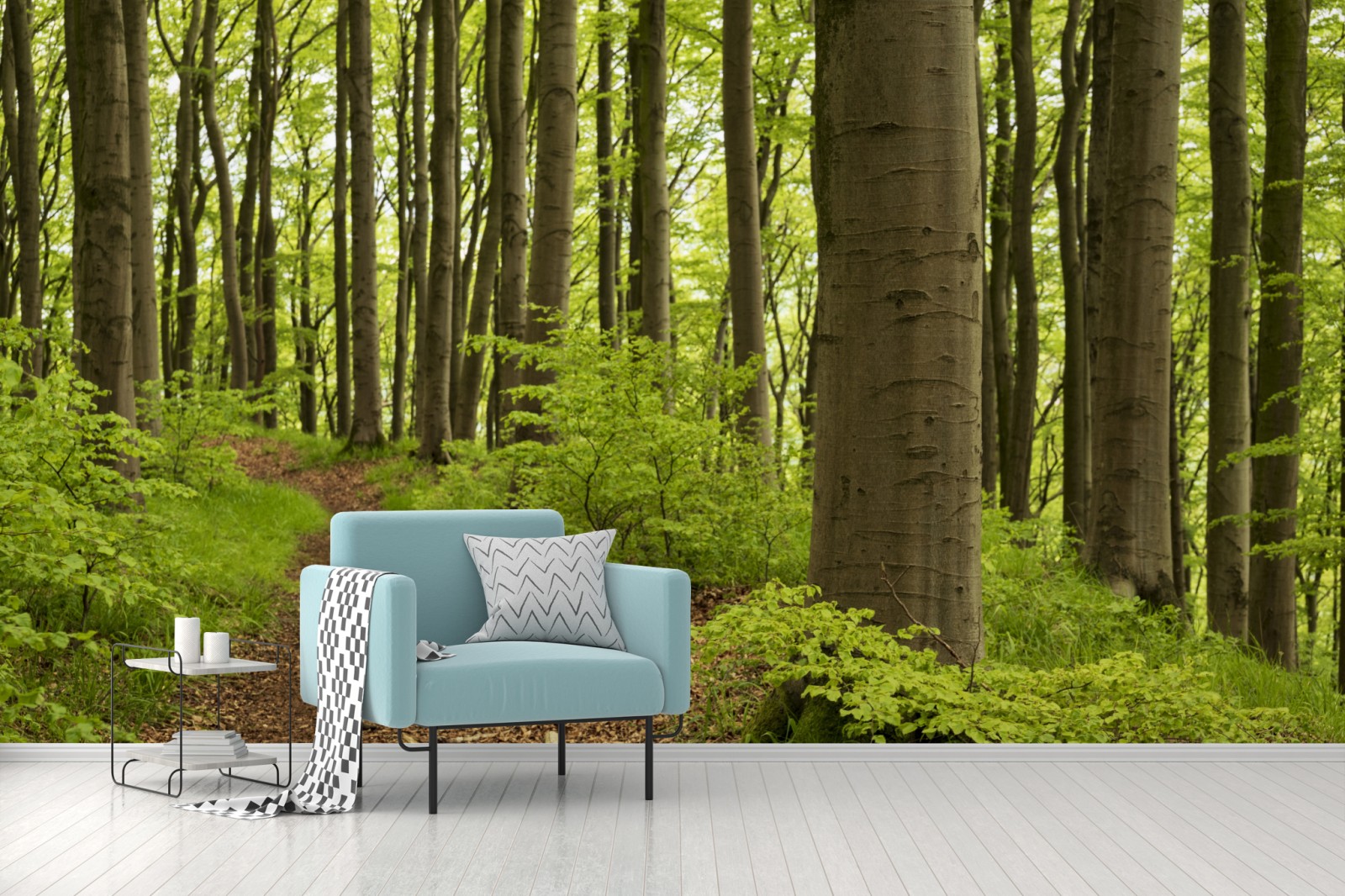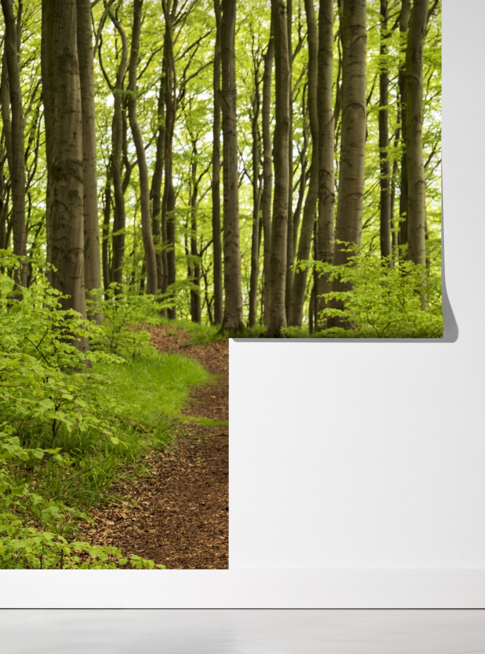 Wprowadź uspokajającą energię buczyny do swojego wnętrza dzięki temu żywemu zdjęciu przyrody. Kręta ścieżka i wysokie drzewa tworzą głębię i relaksującą atmosferę, idealną jako centralny element dekoracji.