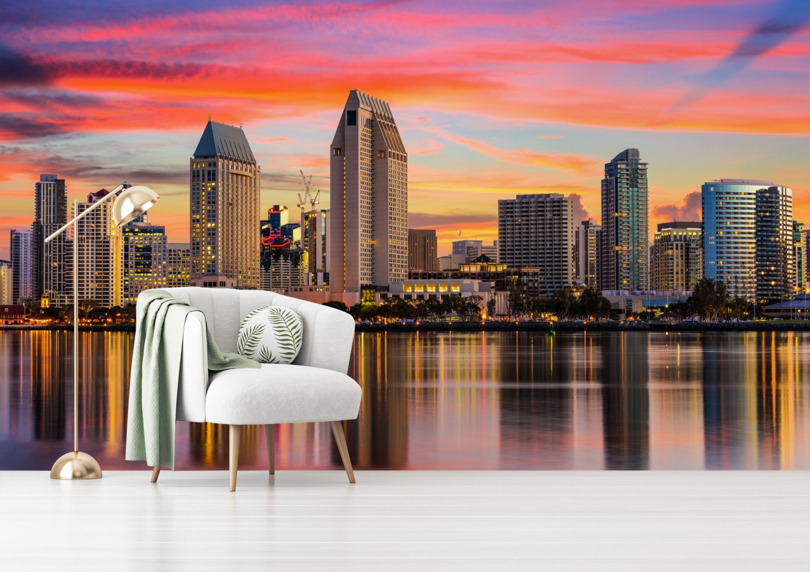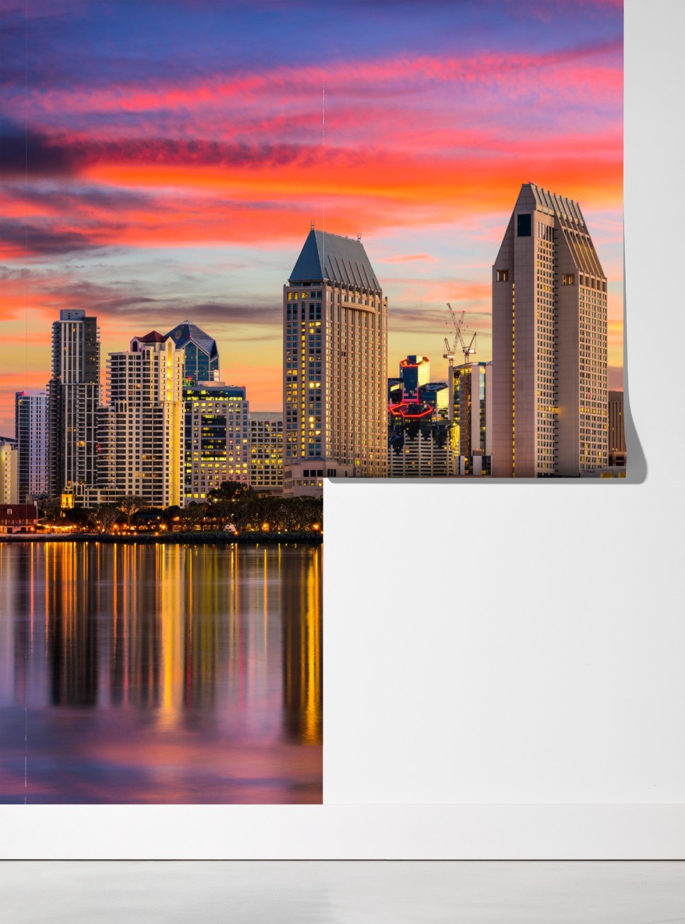 Ożyw swoje wnętrze tą kolorową panoramą centrum San Diego o zachodzie słońca, która doda miejskiego charakteru i pięknych odbić każdemu pomieszczeniu.