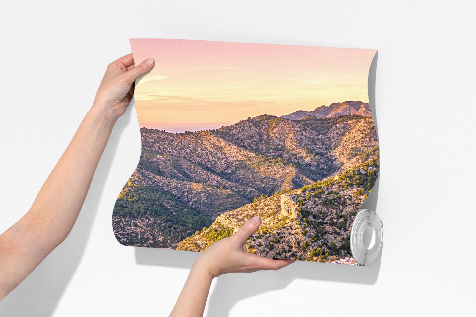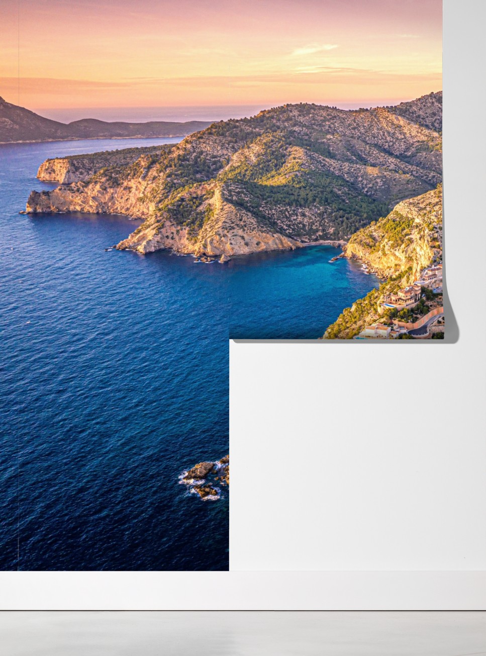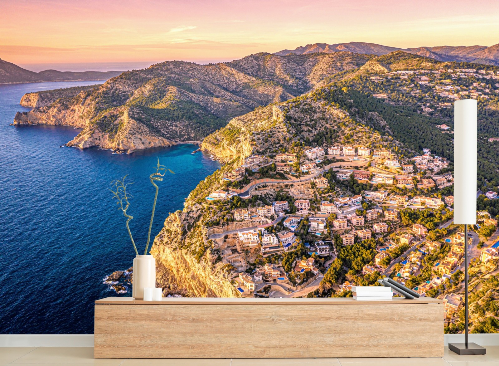 Wprowadź spokój śródziemnomorskiego zachodu słońca do wnętrza dzięki temu lotniczemu widokowi na wioskę na słonecznych klifach.