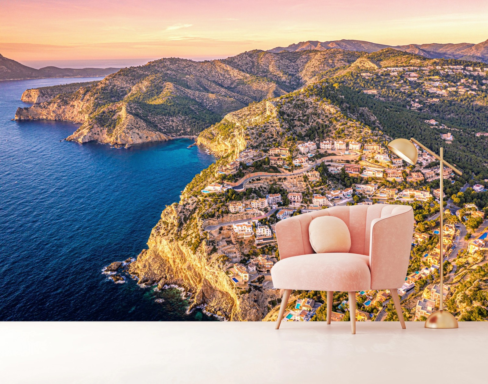 Fototapeta Zachód słońca nad klifem i nadmorską wioską