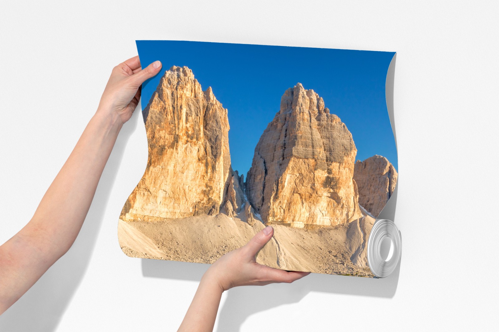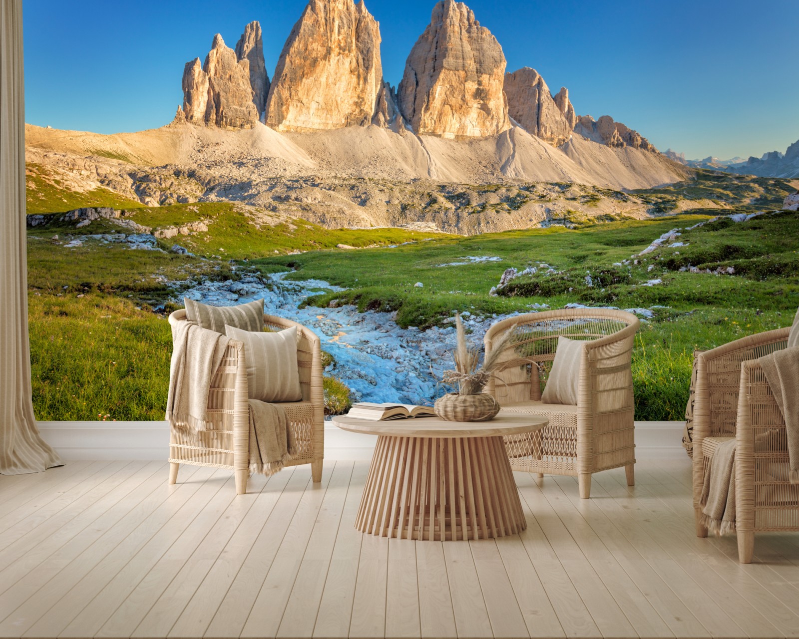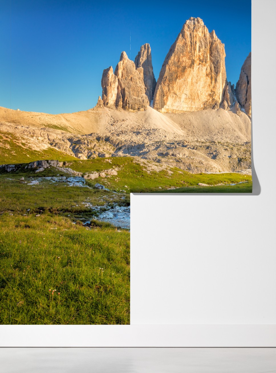 Wprowadź dramatyczne piękno Dolomitów do wnętrza dzięki tej barwnej panoramie Tre Cime di Lavaredo, z złocistymi szczytami, zielonymi łąkami i czystym niebem.