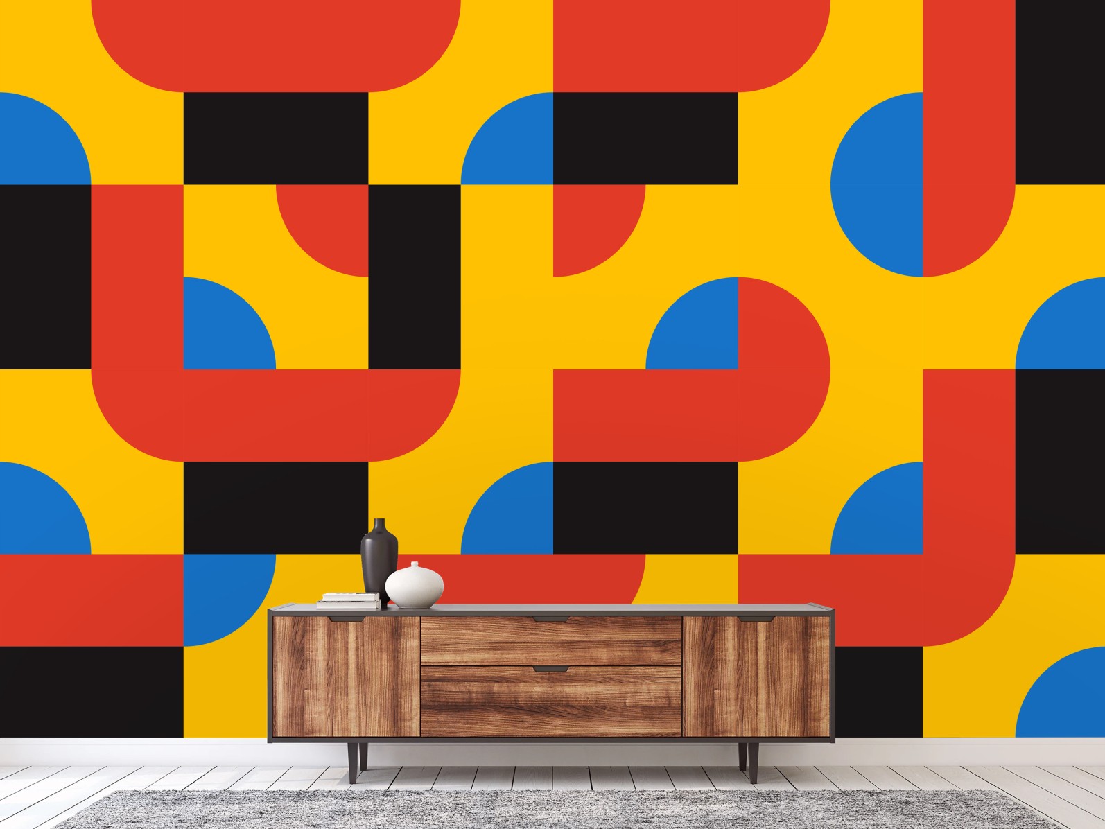 - retro, abstrakcja, bezszwowy wzór, ozdoba ścienna, nowoczesna sztuka, wzór geometryczny, jaskrawe kolory, styl mid-century, odważne kształty, styl wektorowy