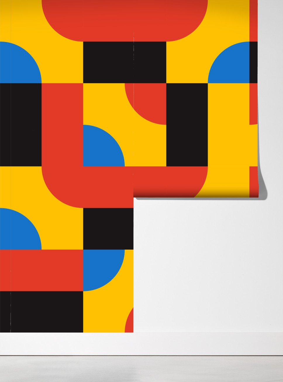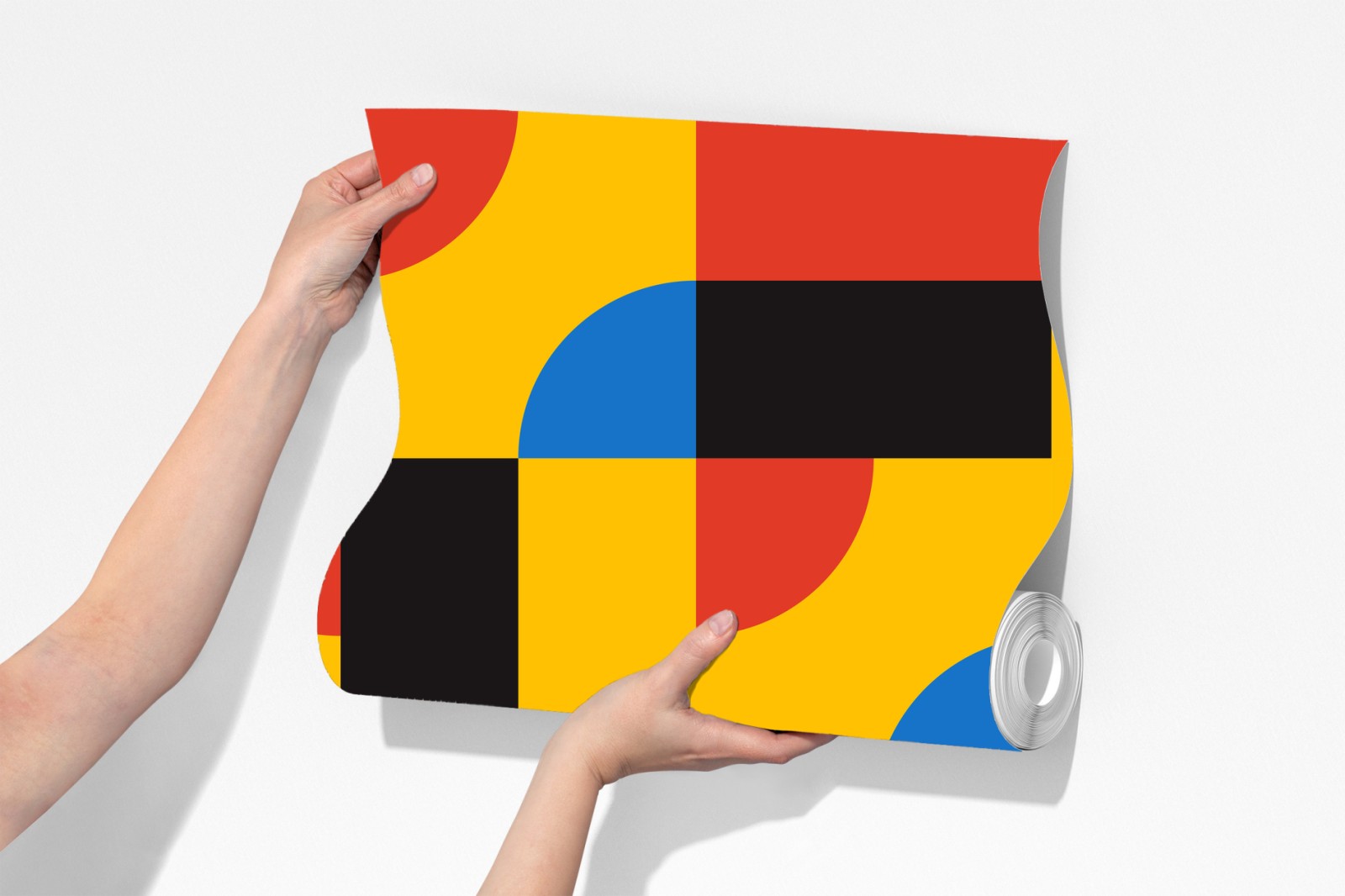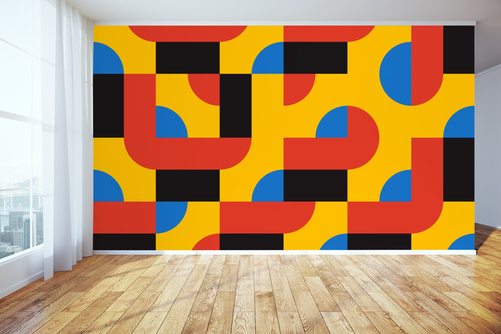 Dodaj energii do wnętrza dzięki odważnemu geometrycznemu wzorowi w intensywnych odcieniach czerwieni, niebieskiego i żółci, idealnemu do nowoczesnych wnętrz.