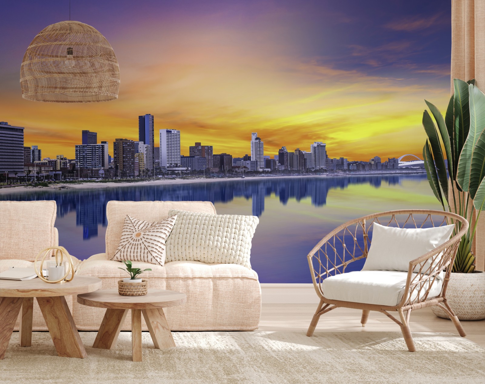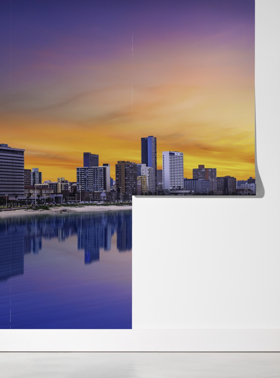 Odkryj spokojny urok wybrzeża Durban podczas zmierzchu uchwycony w żywych kolorach i perfekcyjnych odbiciach, idealny do ozdobienia wnętrza.