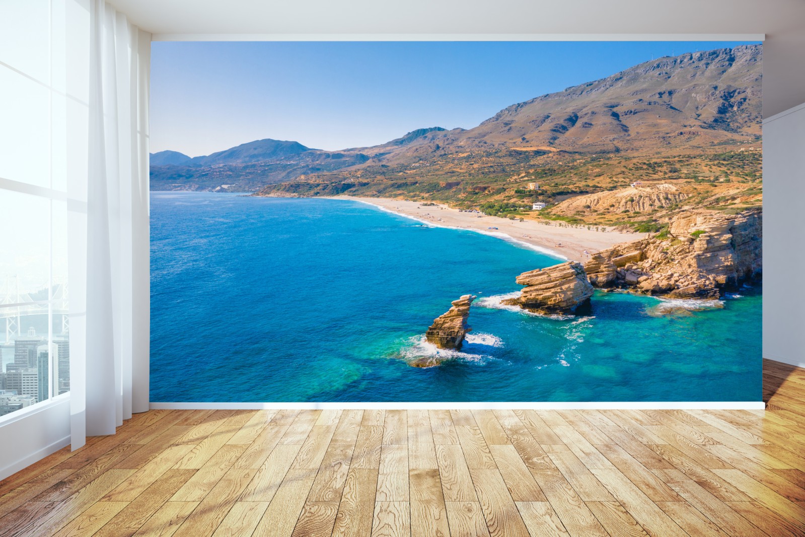 Wprowadź do wnętrza uspokajającą energię słonecznego turkusowego wybrzeża dzięki tej rozległej panoramie plaży, idealnej do dodania naturalnego i relaksującego akcentu.