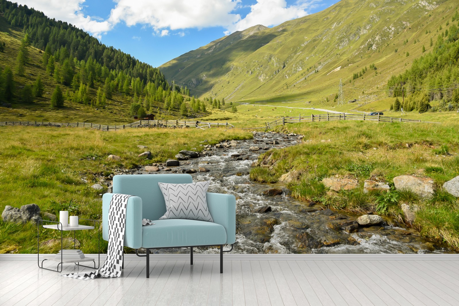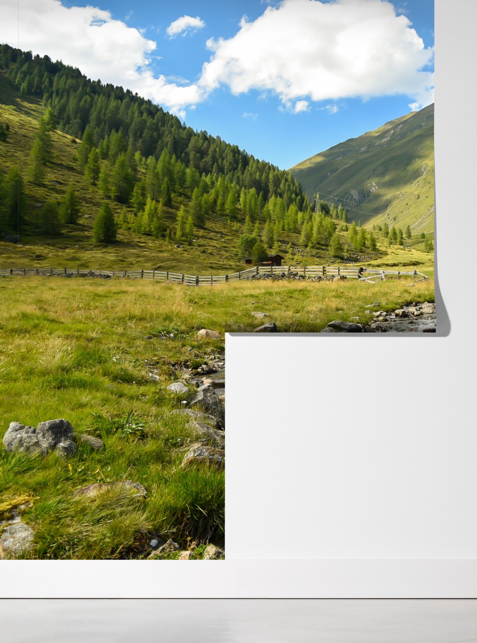 Wprowadź spokojne alpejskie piękno do wnętrza dzięki tej scenie strumienia w słonecznej dolinie. Idealny dodatek, który wprowadzi naturalny i uspokajający akcent do każdego pomieszczenia.