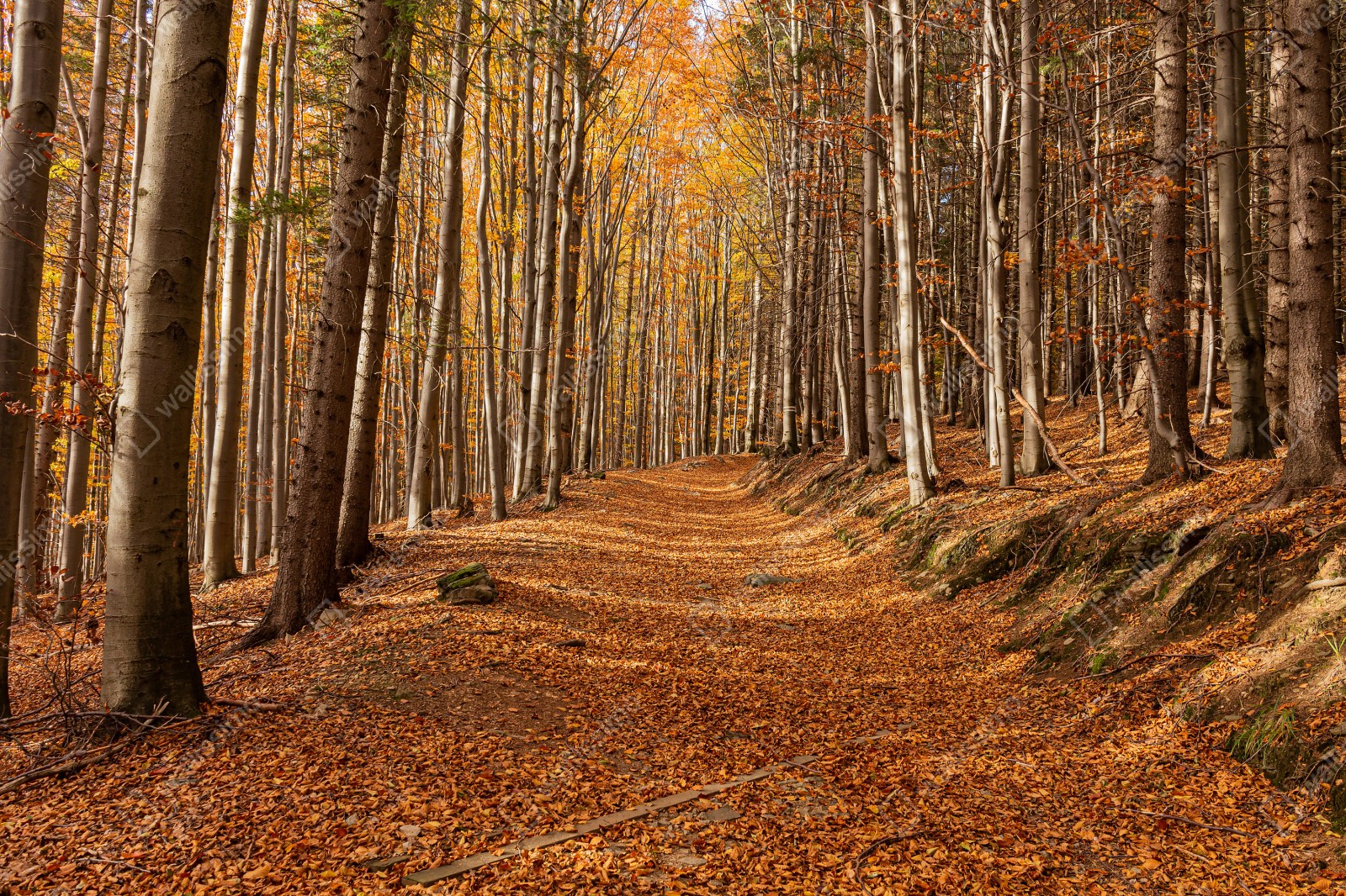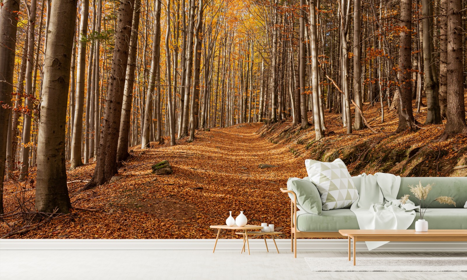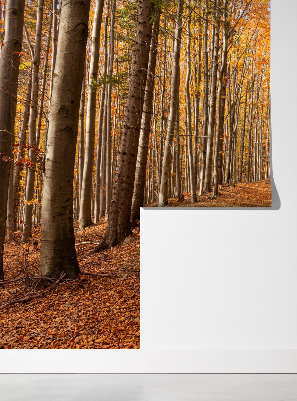 Wprowadź ciepło jesieni do wnętrza dzięki tej spokojnej fotografii leśnej, która doda naturalnej głębi i relaksującej atmosfery.