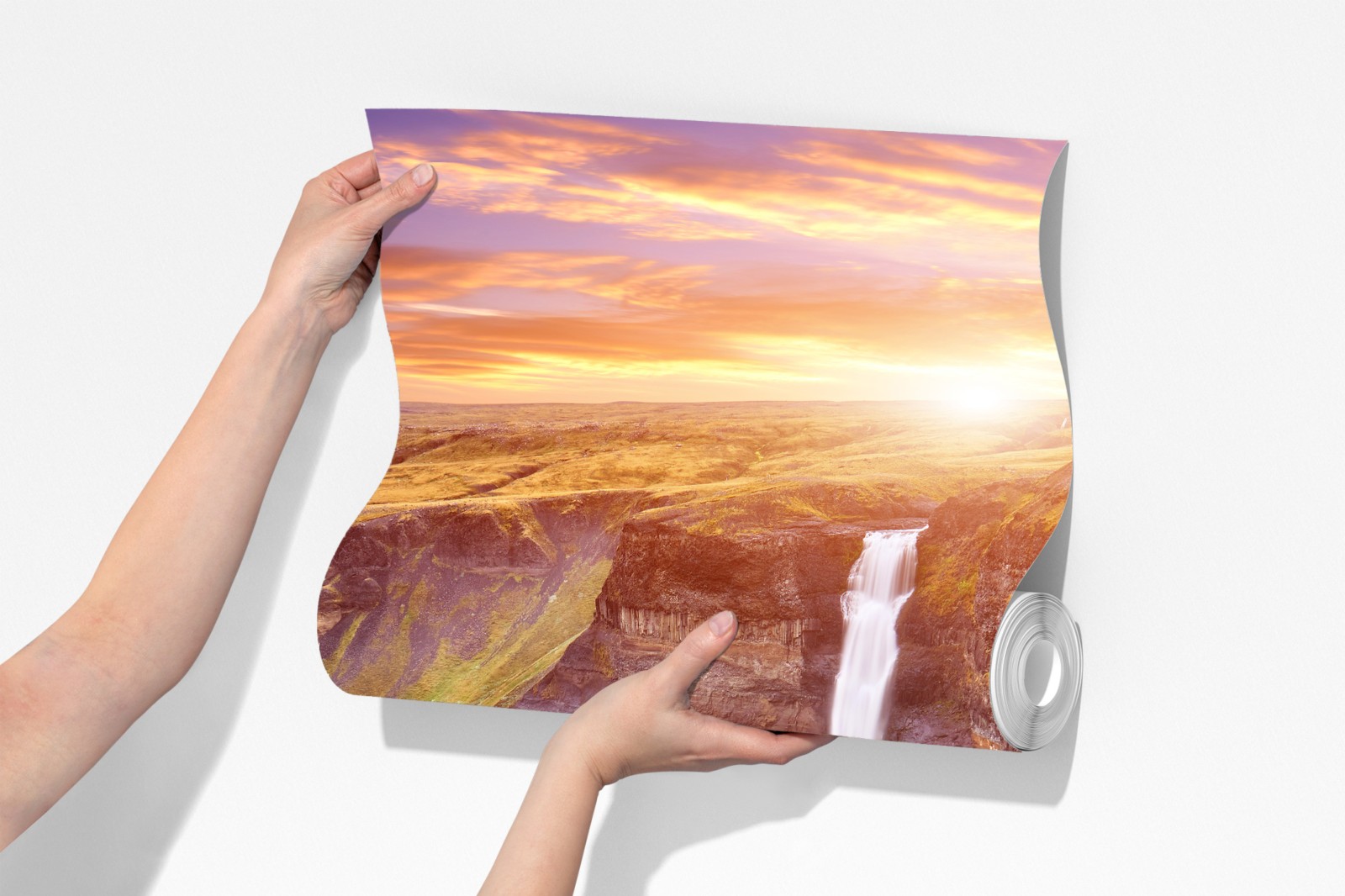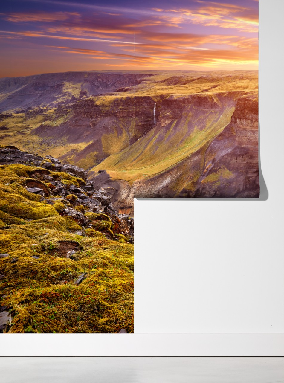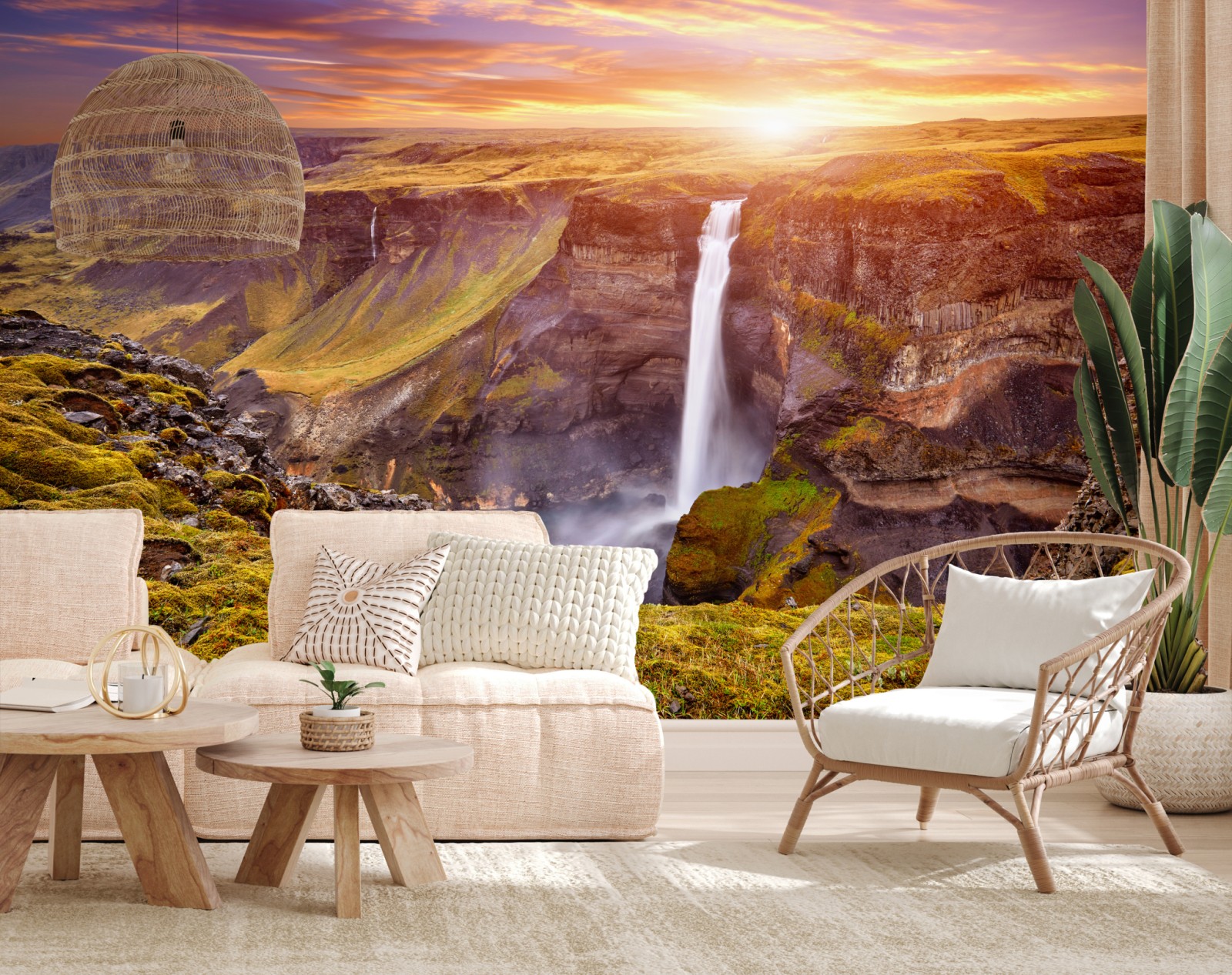 Wprowadź dramatyczne piękno Haifoss uchwycone w złotej godzinie do swojego wnętrza, z kaskadą wody, surowymi klifami i bujnym mchem tworzącymi oszałamiający punkt centralny.
