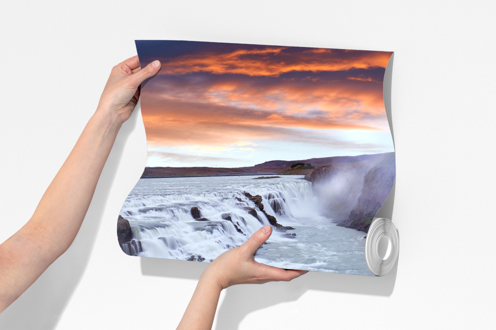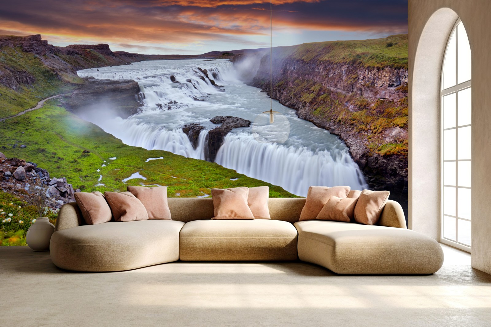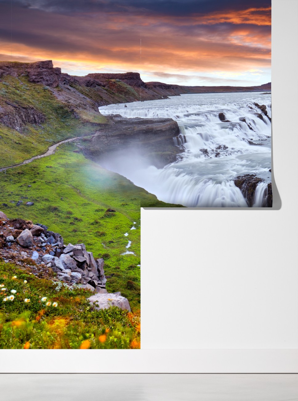 Dodaj do wnętrza dramatyzm wodospadu Gullfoss dzięki tej wyrazistej panoramicznej grafice ukazującej spadające kaskady, zielone klify i rozświetlone niebo.