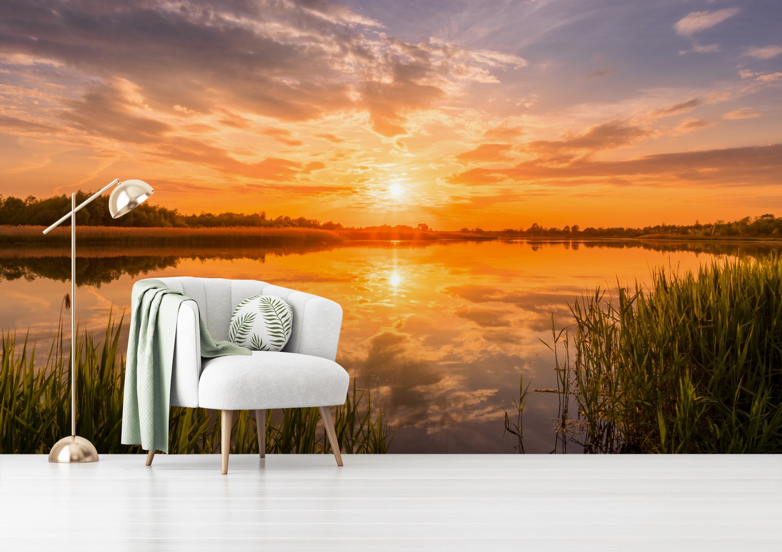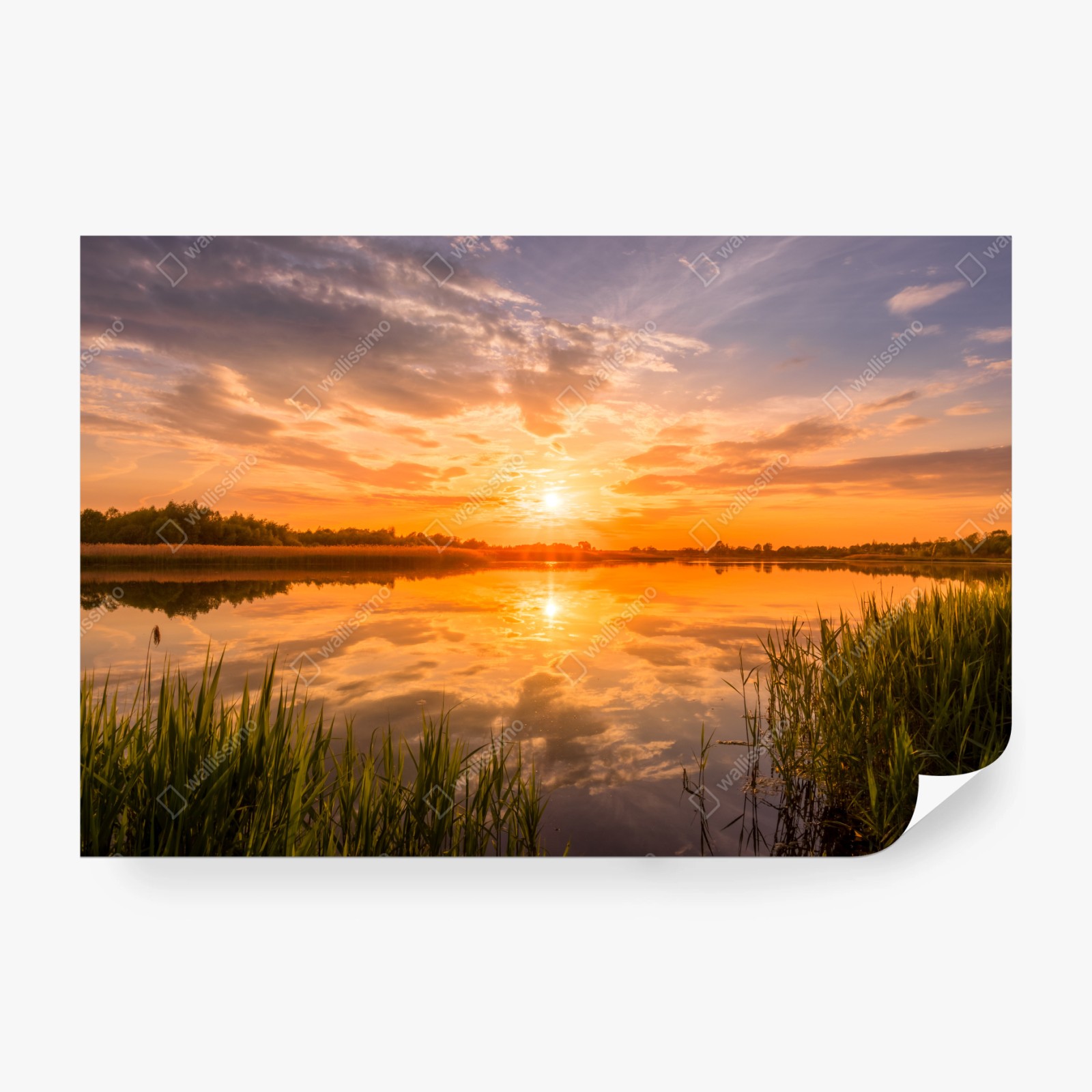 Fototapeta Złoty zachód słońca nad spokojnym jeziorem