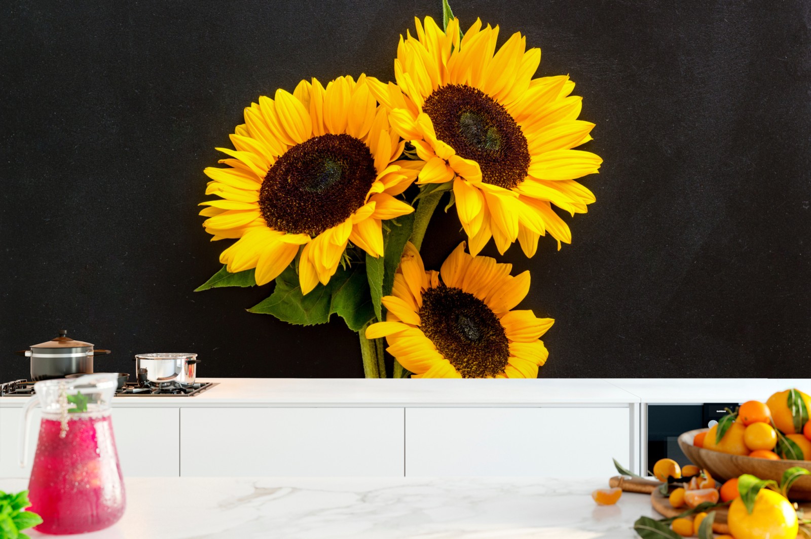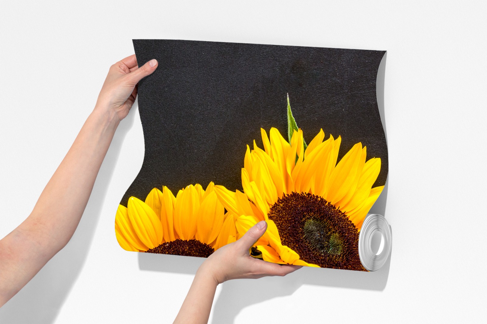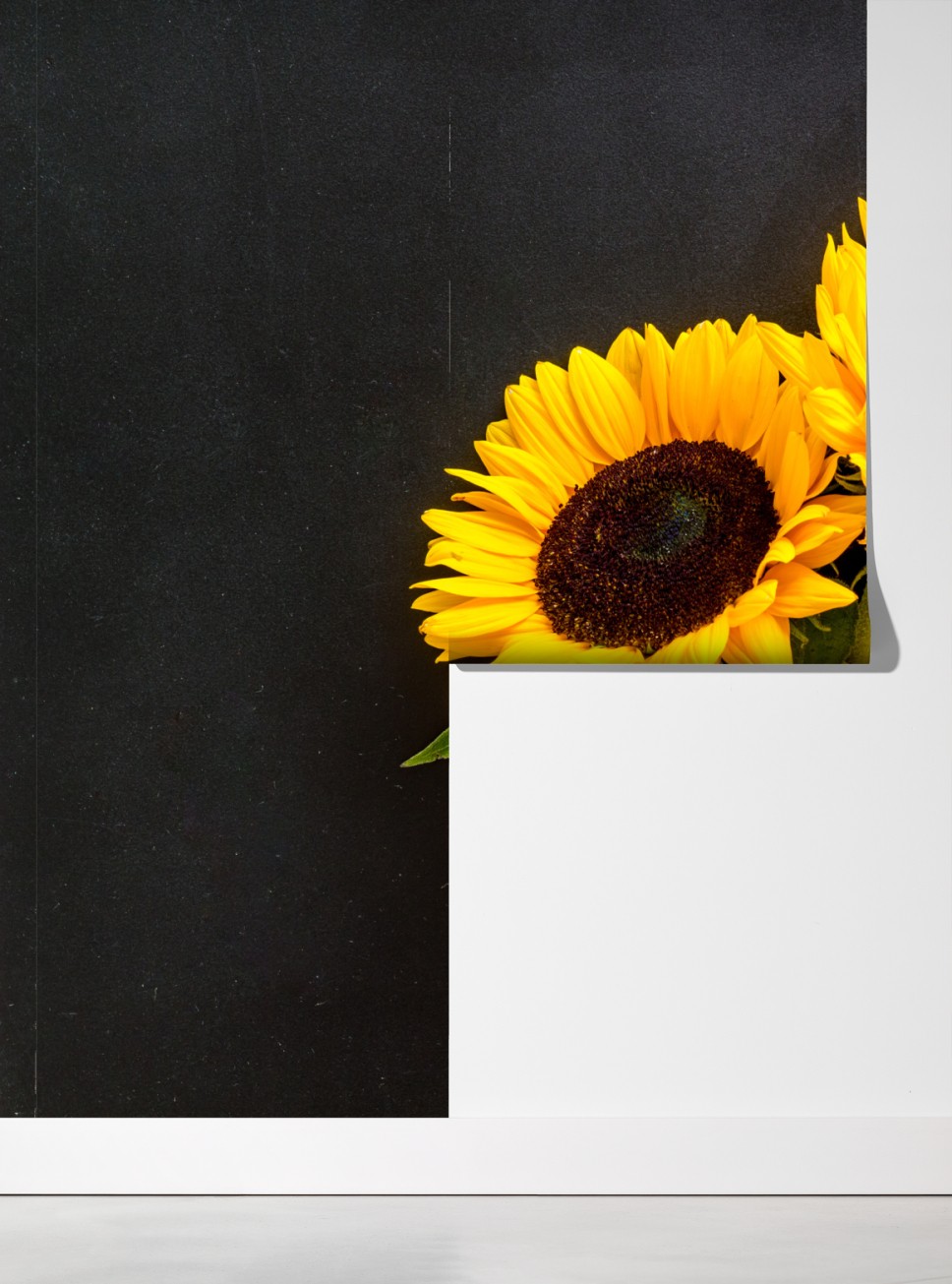 Dodaj ciepła i radości do wnętrza dzięki żywym słonecznikom na kontrastowym czarnym tle, idealne jako dekoracyjny akcent.
