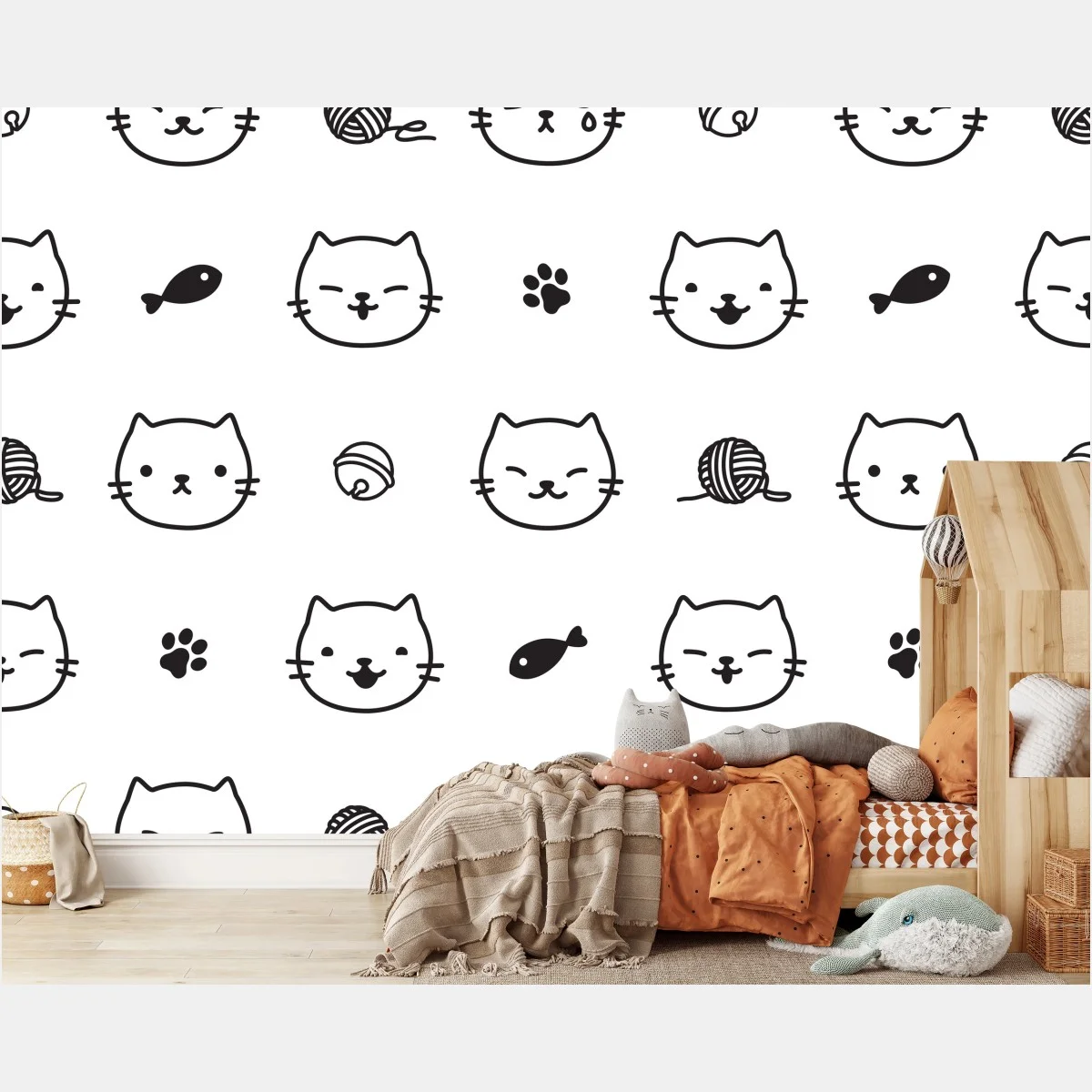- czarno-biały, kot, wzór, minimalistyczny, uroczy, bezszwowy, kotek, ikonki, kłębek, łapa