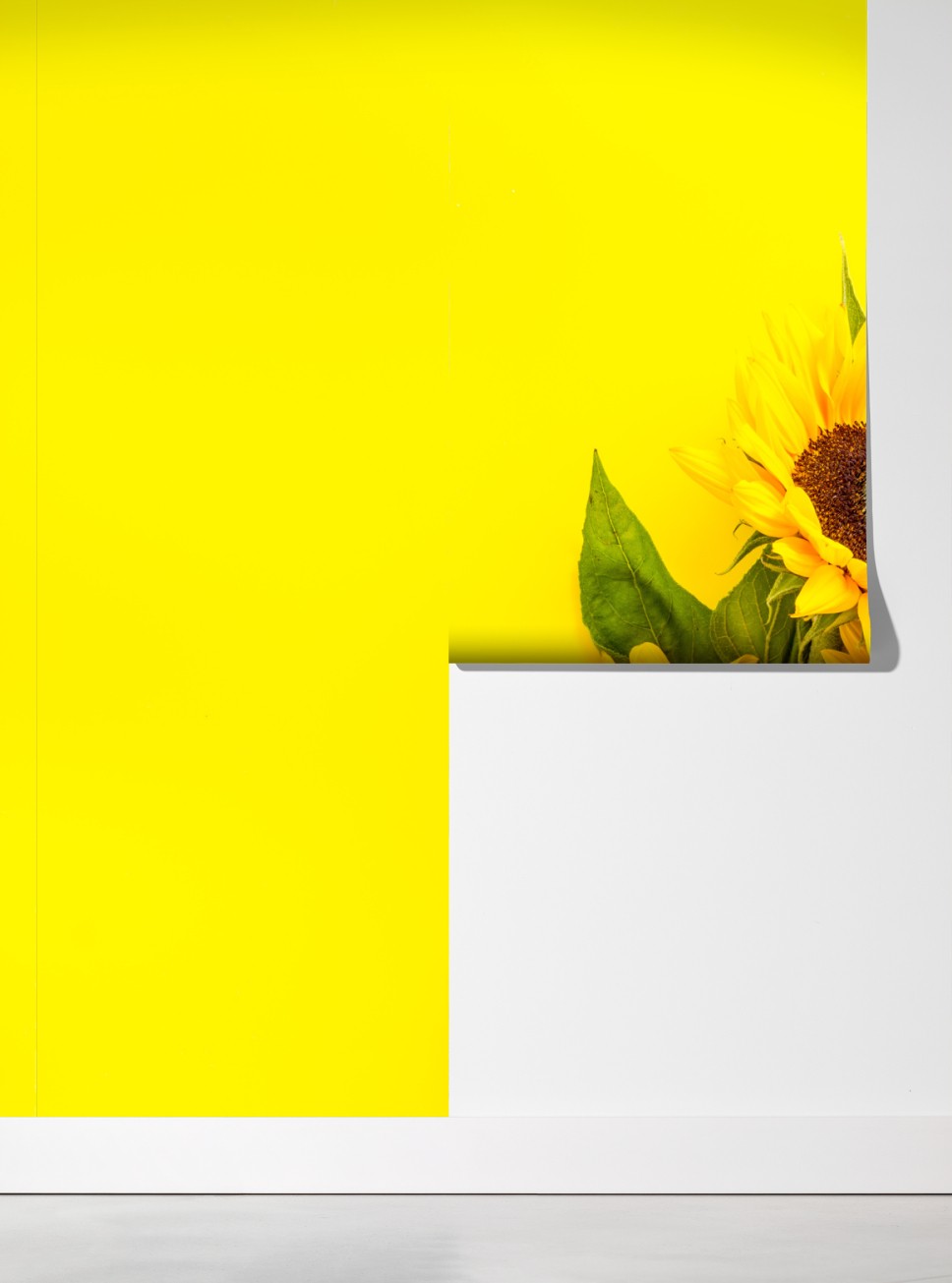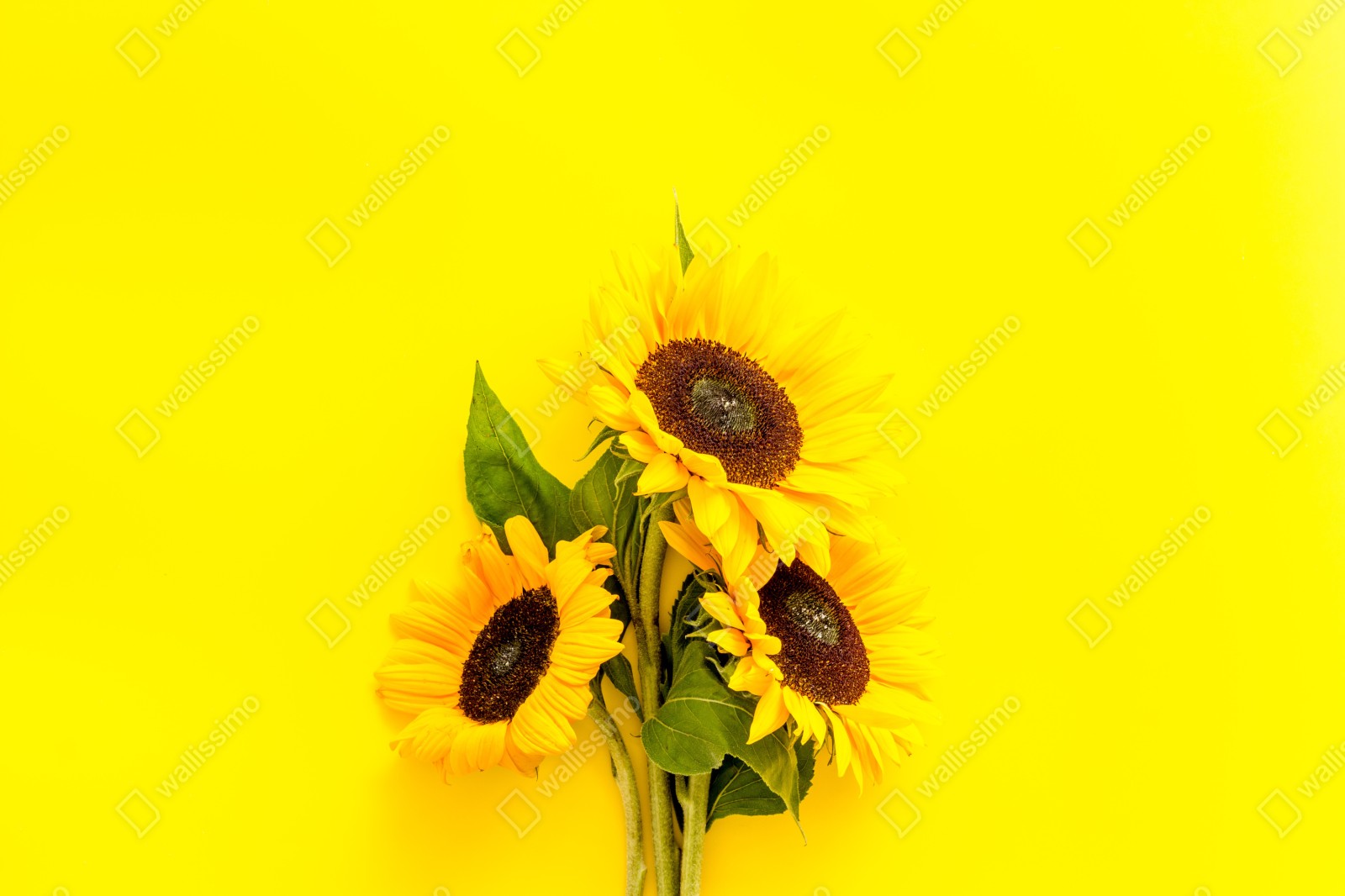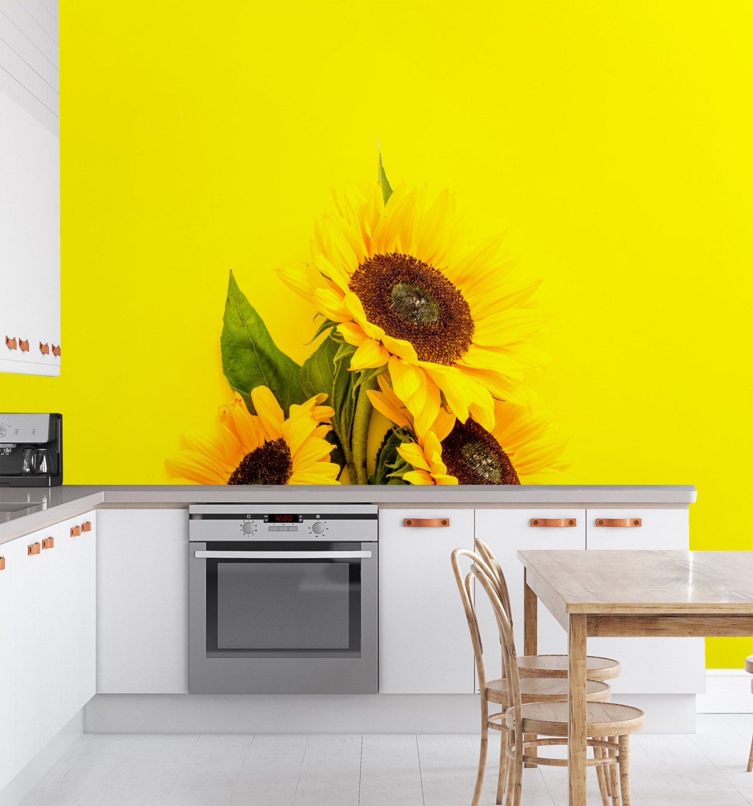 Wprowadź letnią energię do wnętrza dzięki wesołemu bukietowi słoneczników na intensywnym żółtym tle.