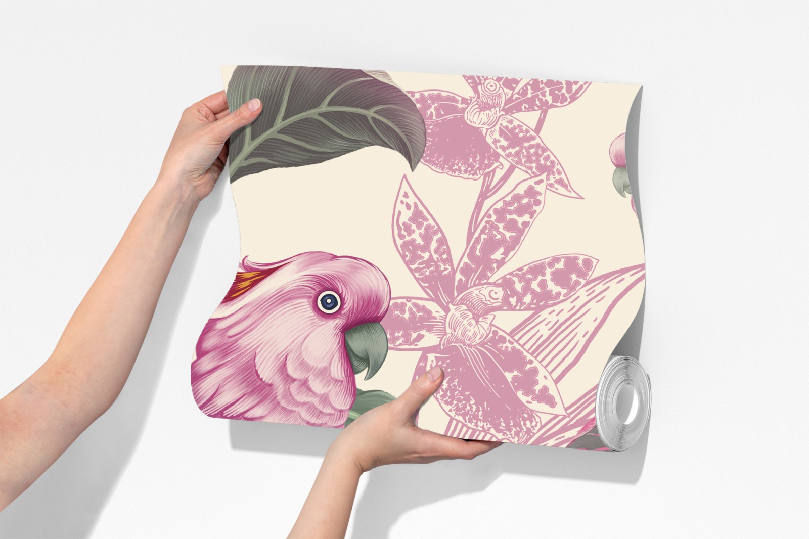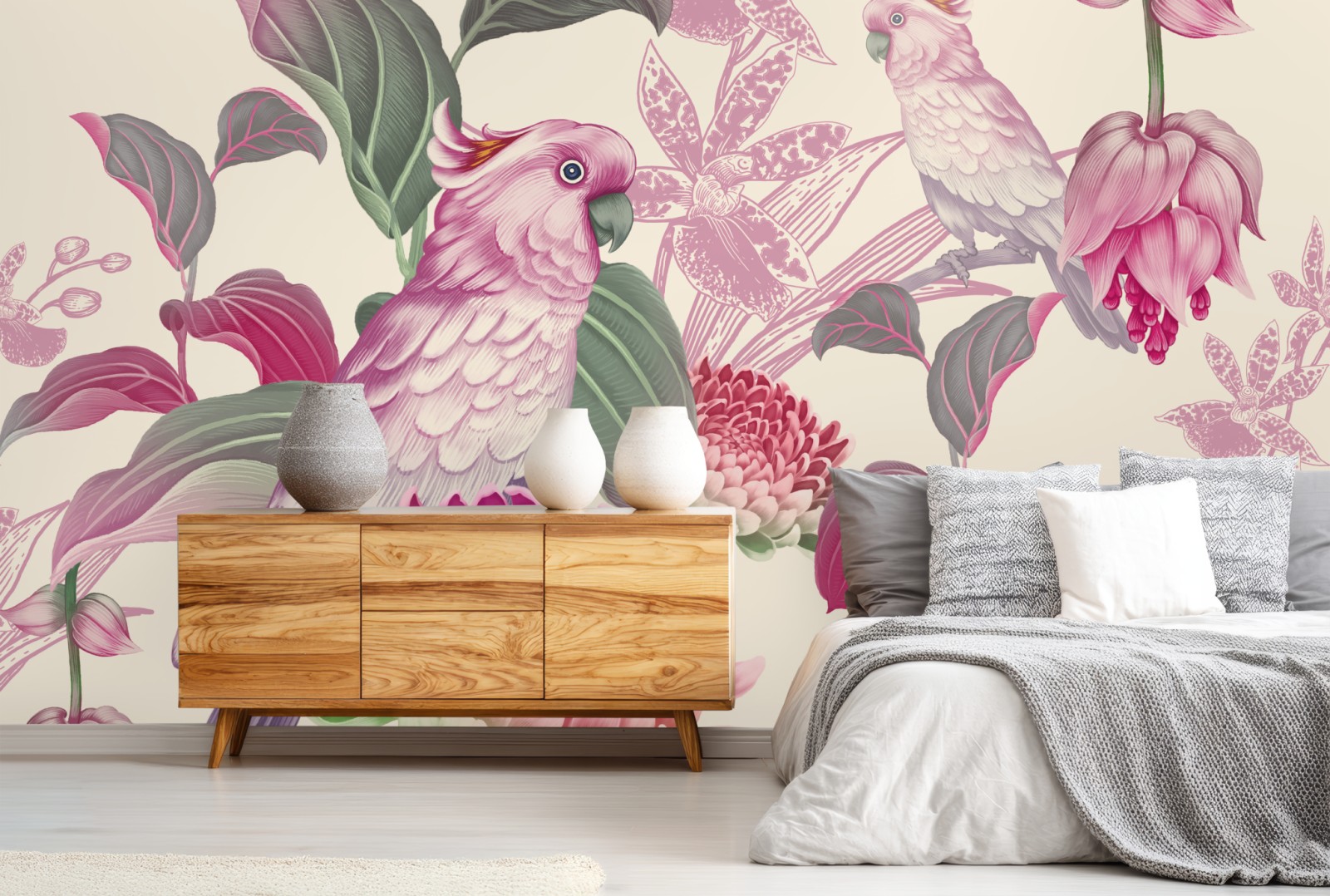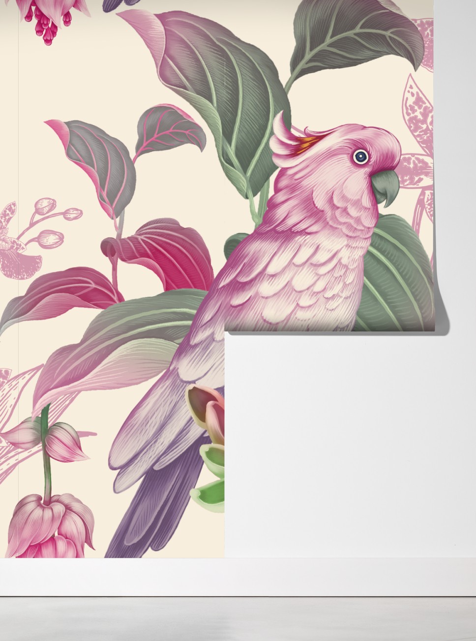 Wprowadź delikatny botaniczny urok do wnętrza dzięki pastelowej ilustracji różowych papug i kwitnących kwiatów, idealnej do stworzenia spokojnego akcentu ściennego.