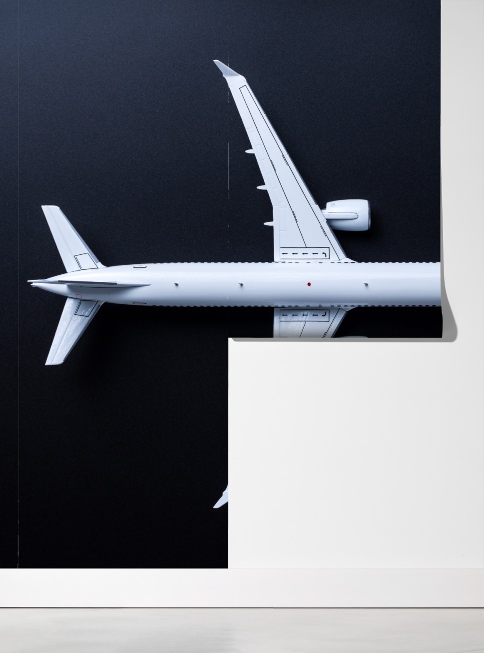 Wzbogać wnętrze minimalistycznym zdjęciem przedstawiającym biały samolot w widoku z góry na głębokim czarnym tle.