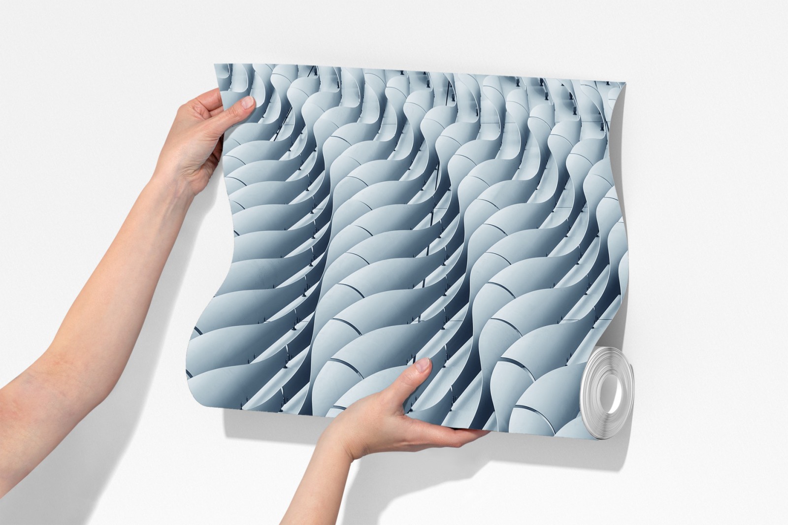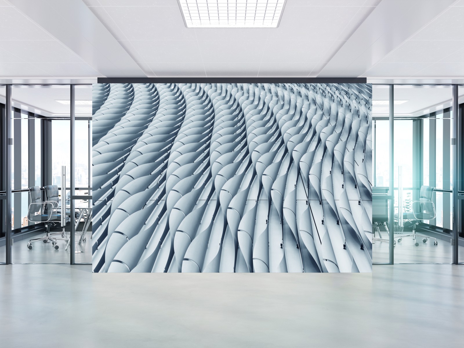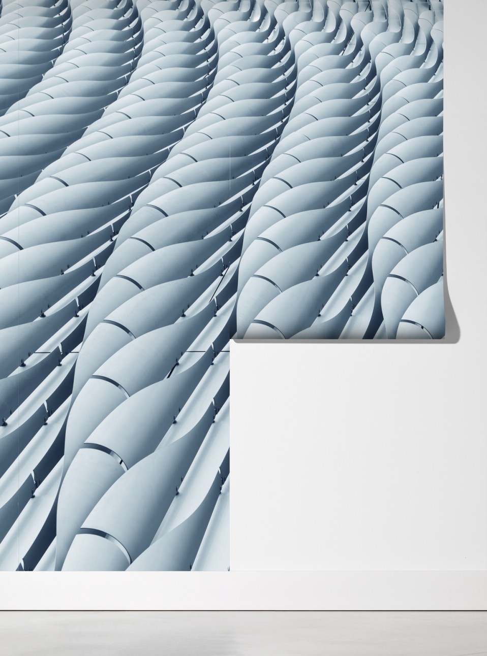 Wprowadź nowoczesny minimalizm do wnętrza dzięki abstrakcyjnemu wzorowi fasady architektonicznej z powtarzającymi się falistymi panelami i subtelną monochromatyczną paletą.