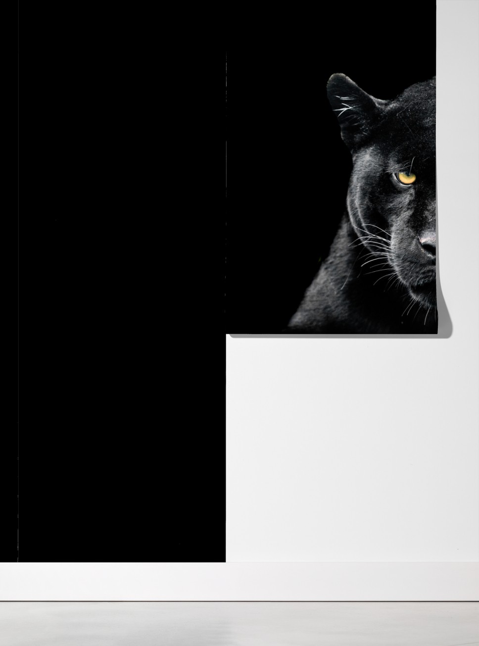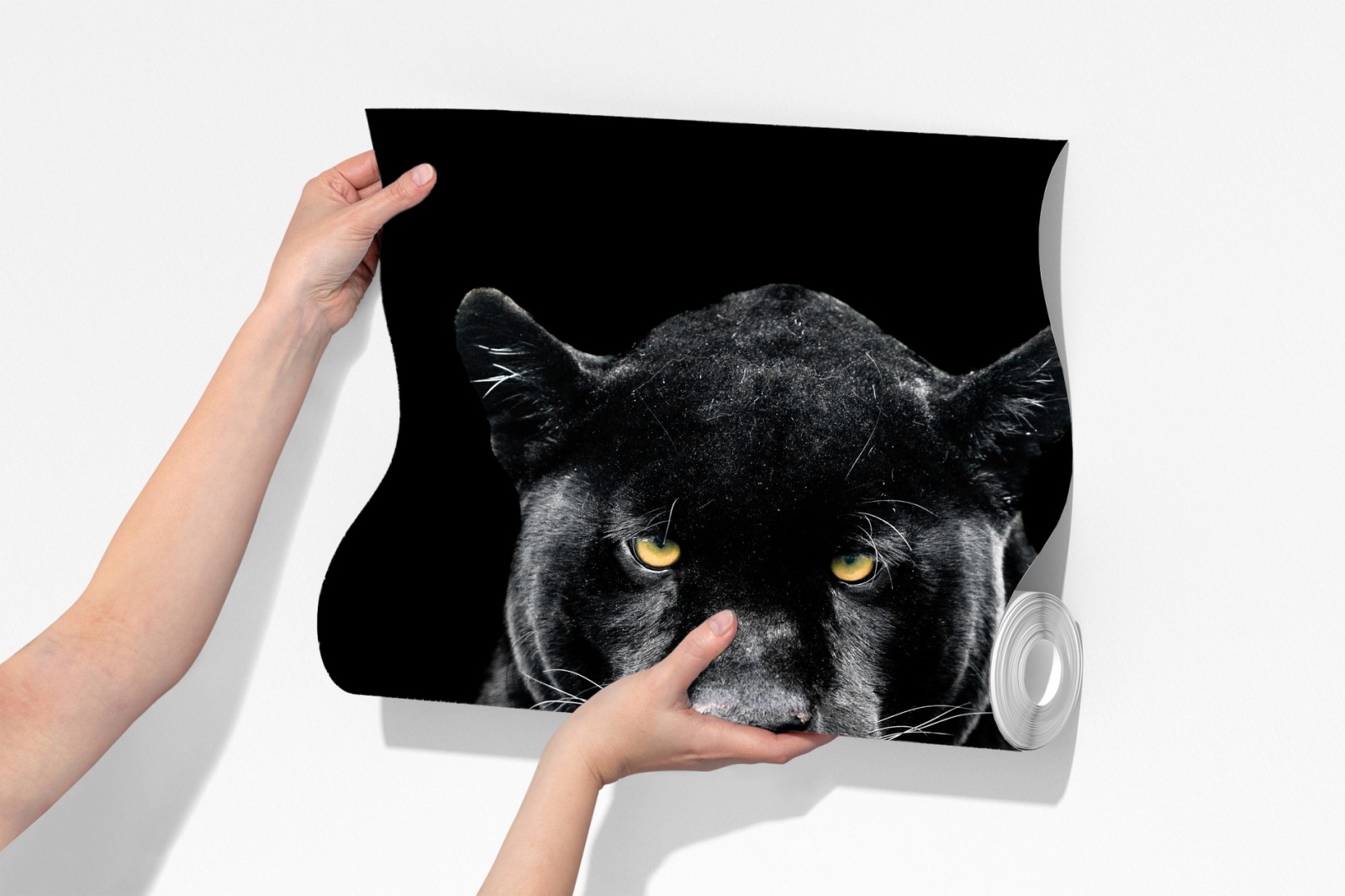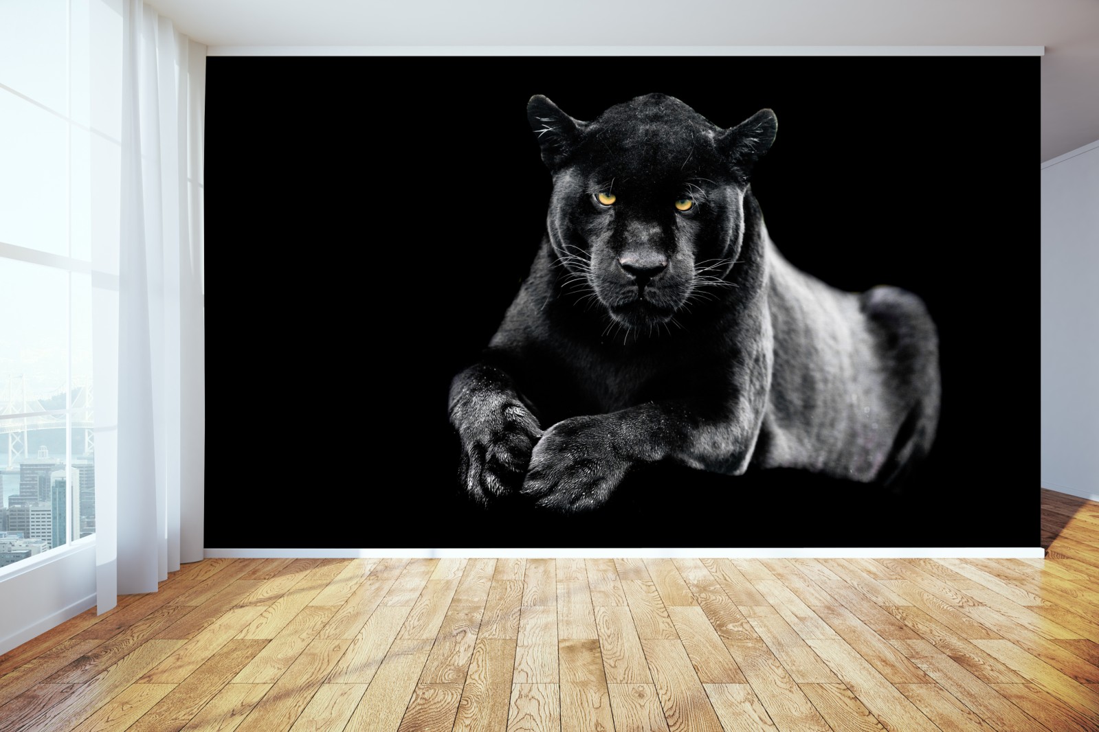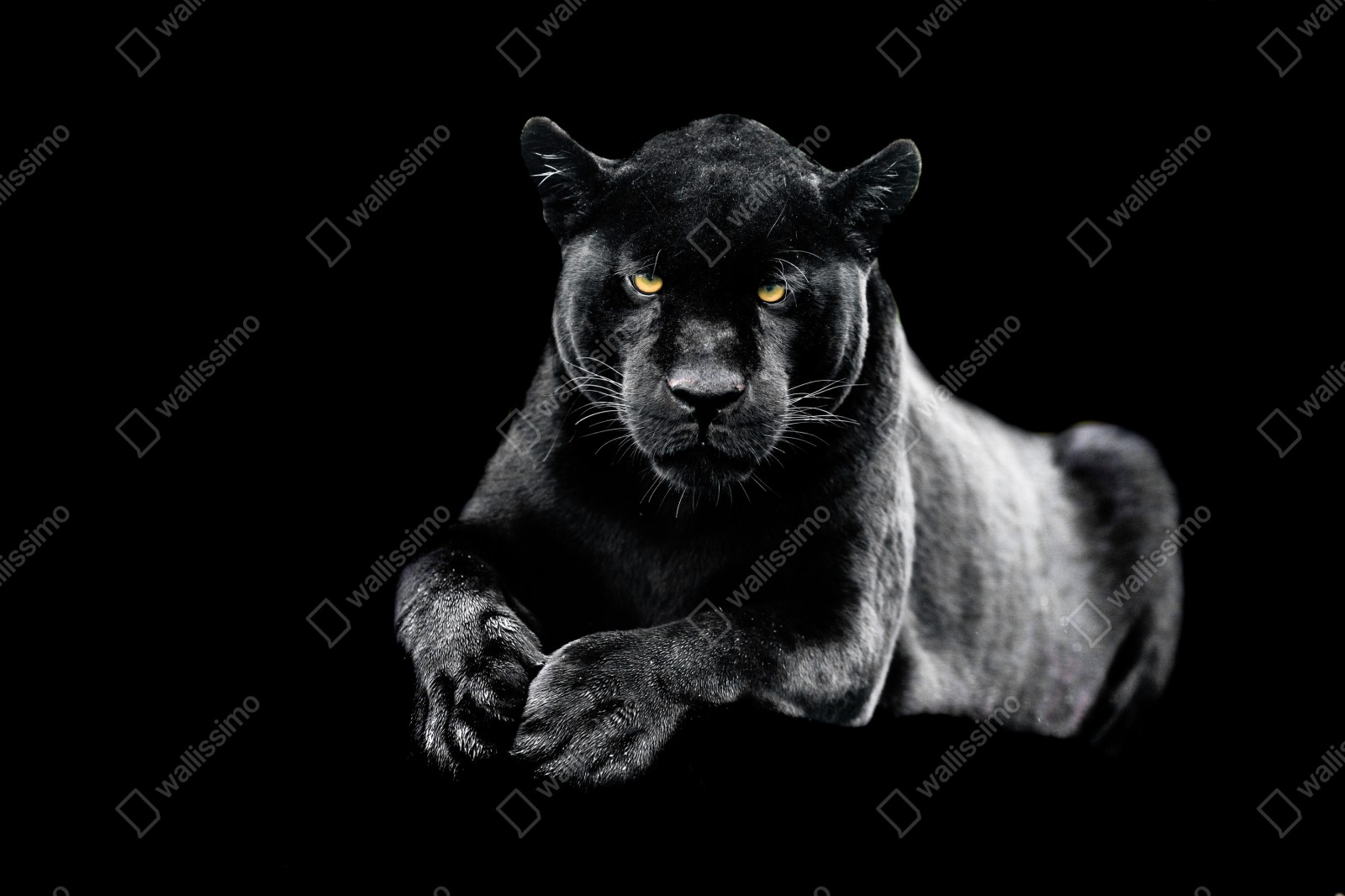 Wyrazisty portret czarnej pantery z przenikliwymi żółtymi oczami, idealny do wnętrz dodających charakteru.