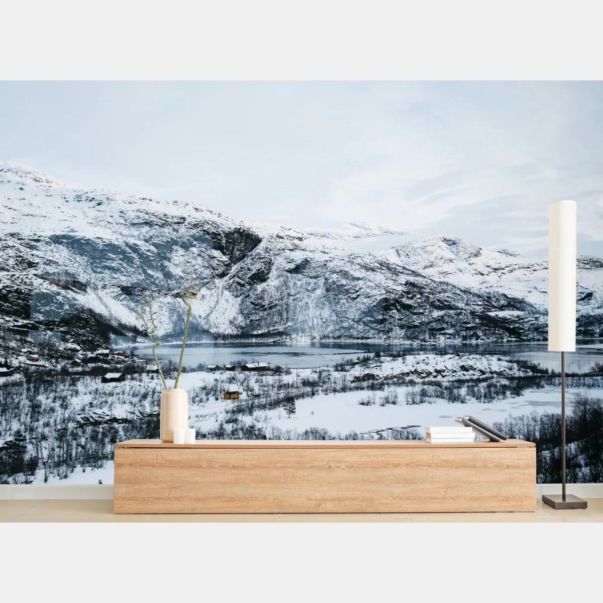 Fototapeta Spokojny zimowy pejzaż górski nad zamarzniętym jeziorem