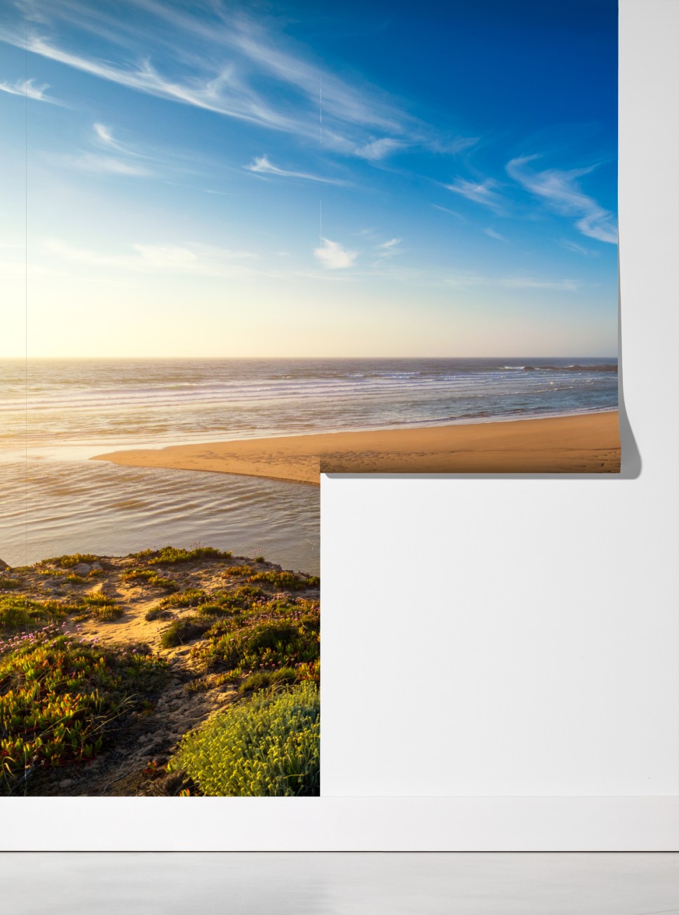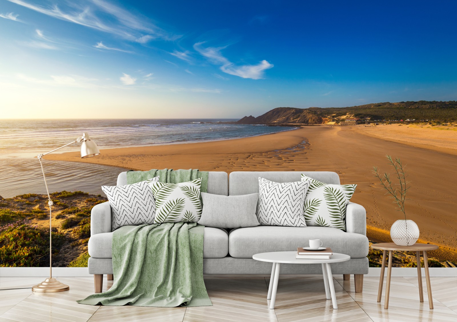 Wprowadź do wnętrza spokój wybrzeża dzięki panoramicznemu widokowi na Praia da Amoreira z złotym piaskiem i szerokim niebem.