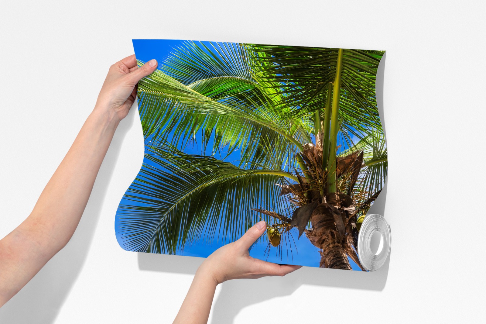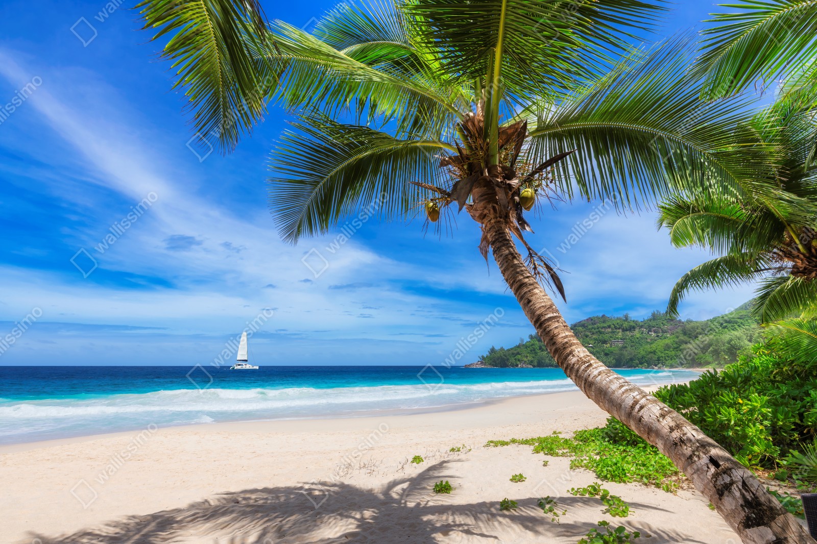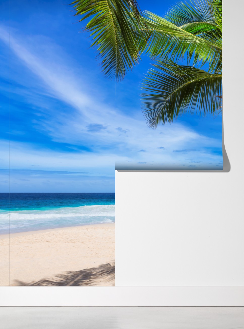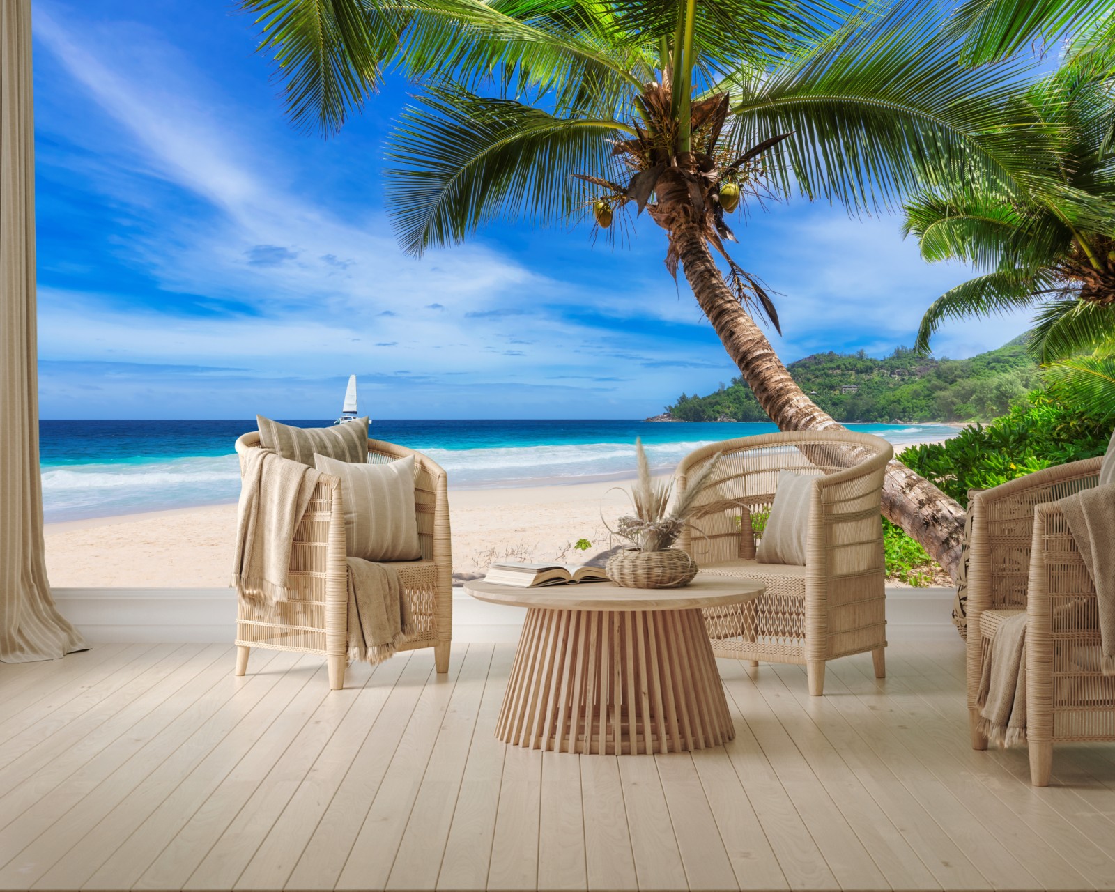 Wprowadź do wnętrza spokój tropikalnej plaży z widokiem na palmy i żaglówkę na horyzoncie.