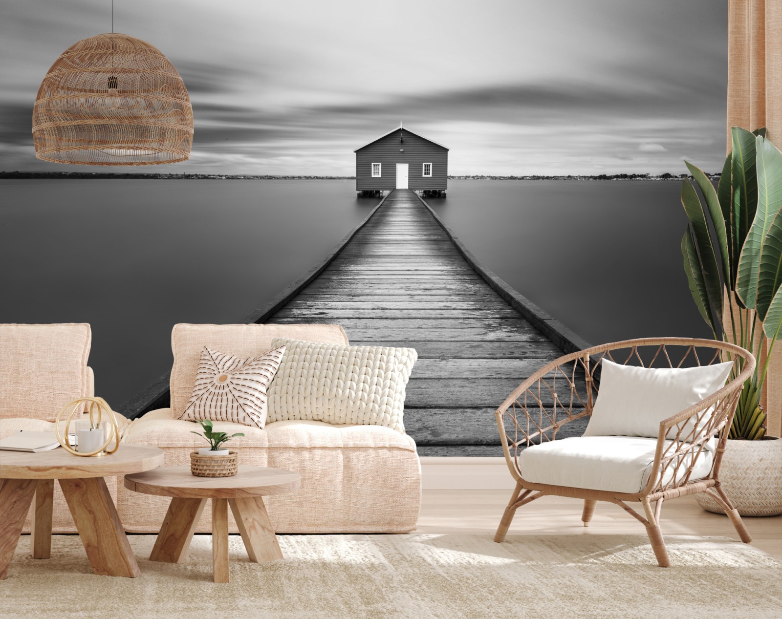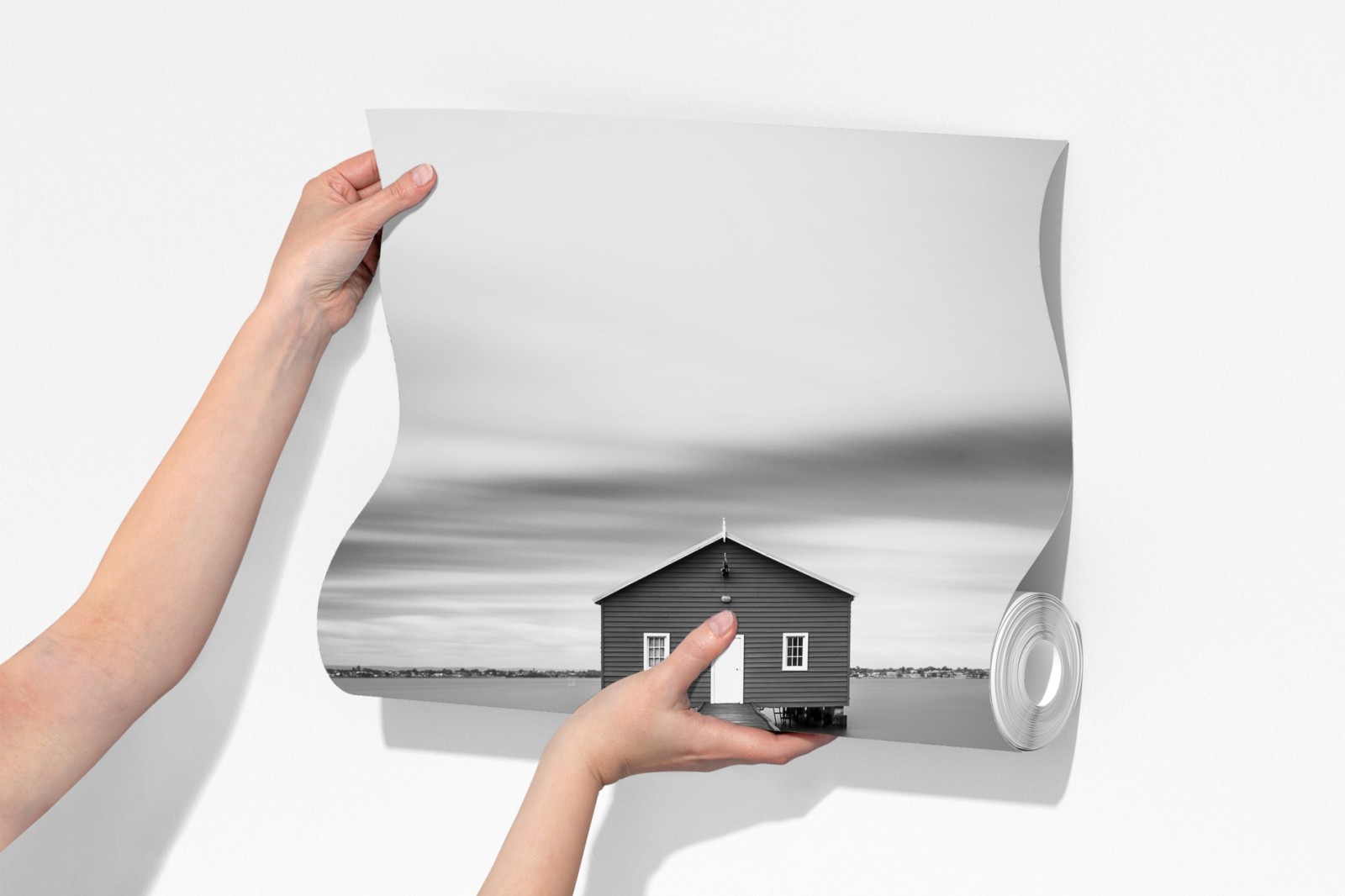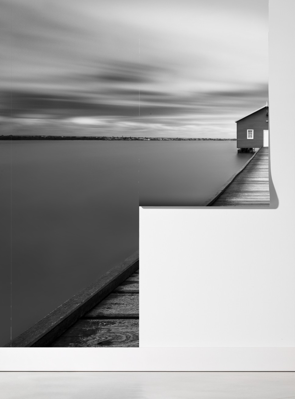 Wprowadź do wnętrza spokojną minimalistyczną atmosferę dzięki temu czarno-białemu zdjęciu samotnego domku na pomoście, idealnemu jako stonowany akcent dekoracyjny.