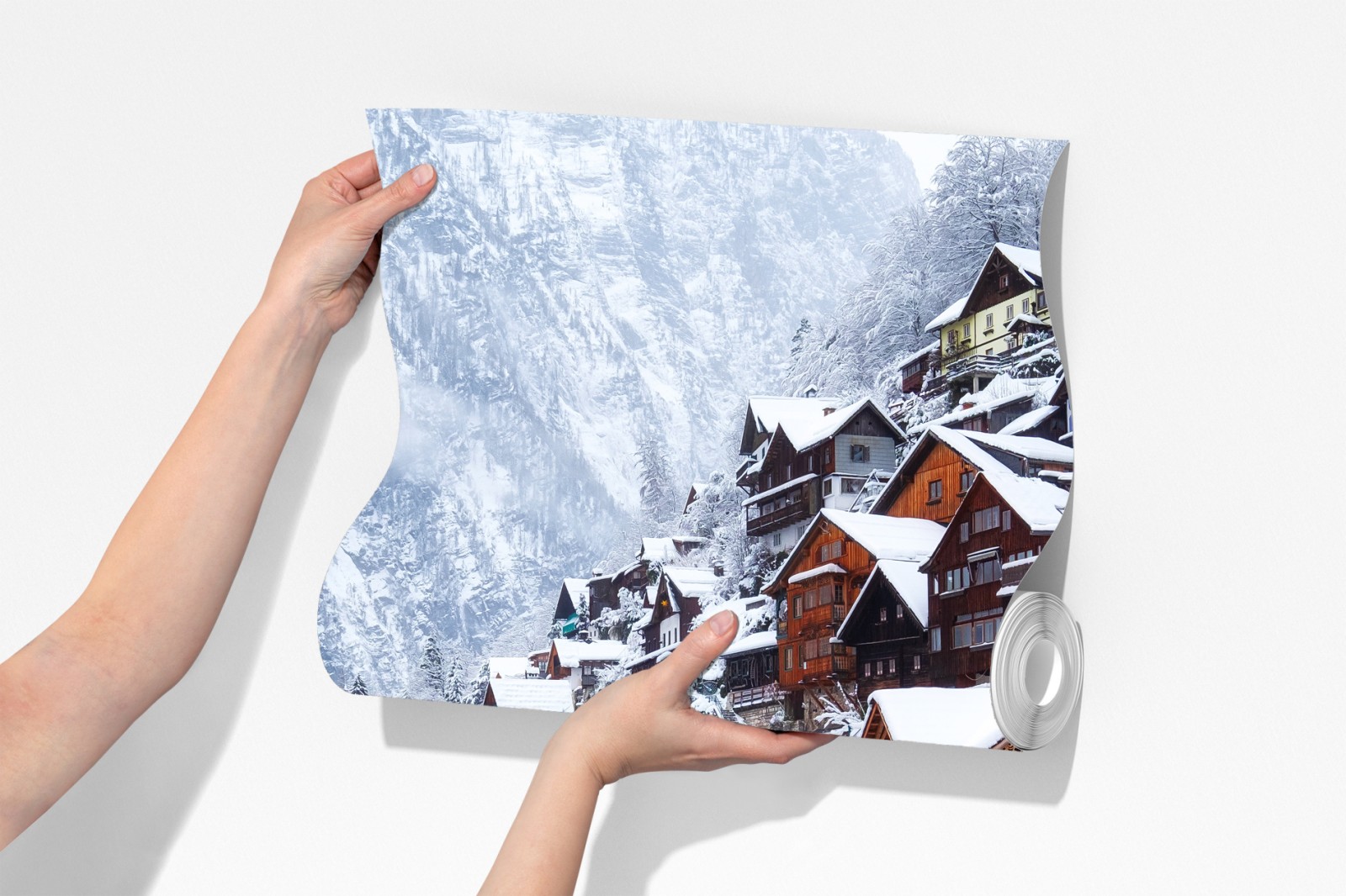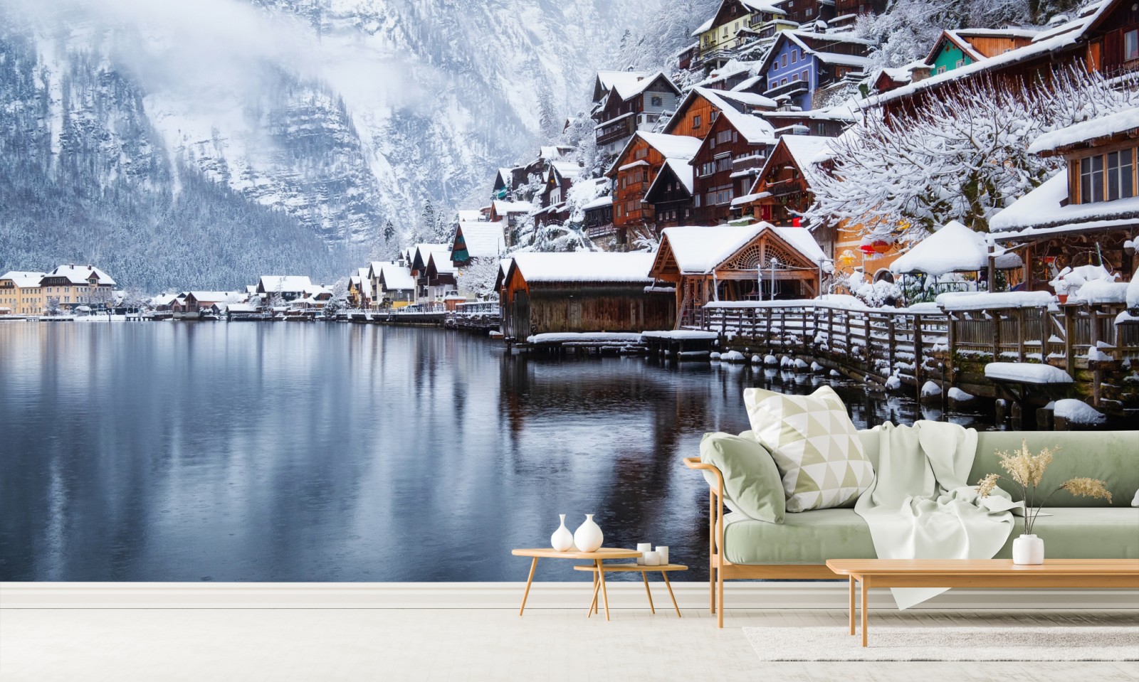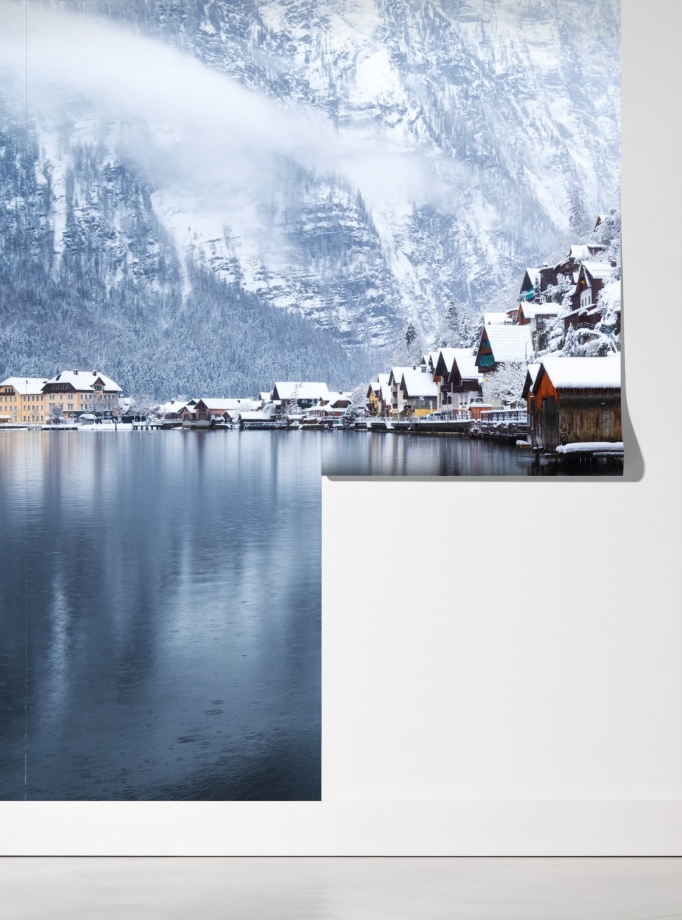 Poczuj spokój śnieżnego Hallstatt odbijającego się w alpejskim jeziorze, idealne do ocieplenia wnętrza.