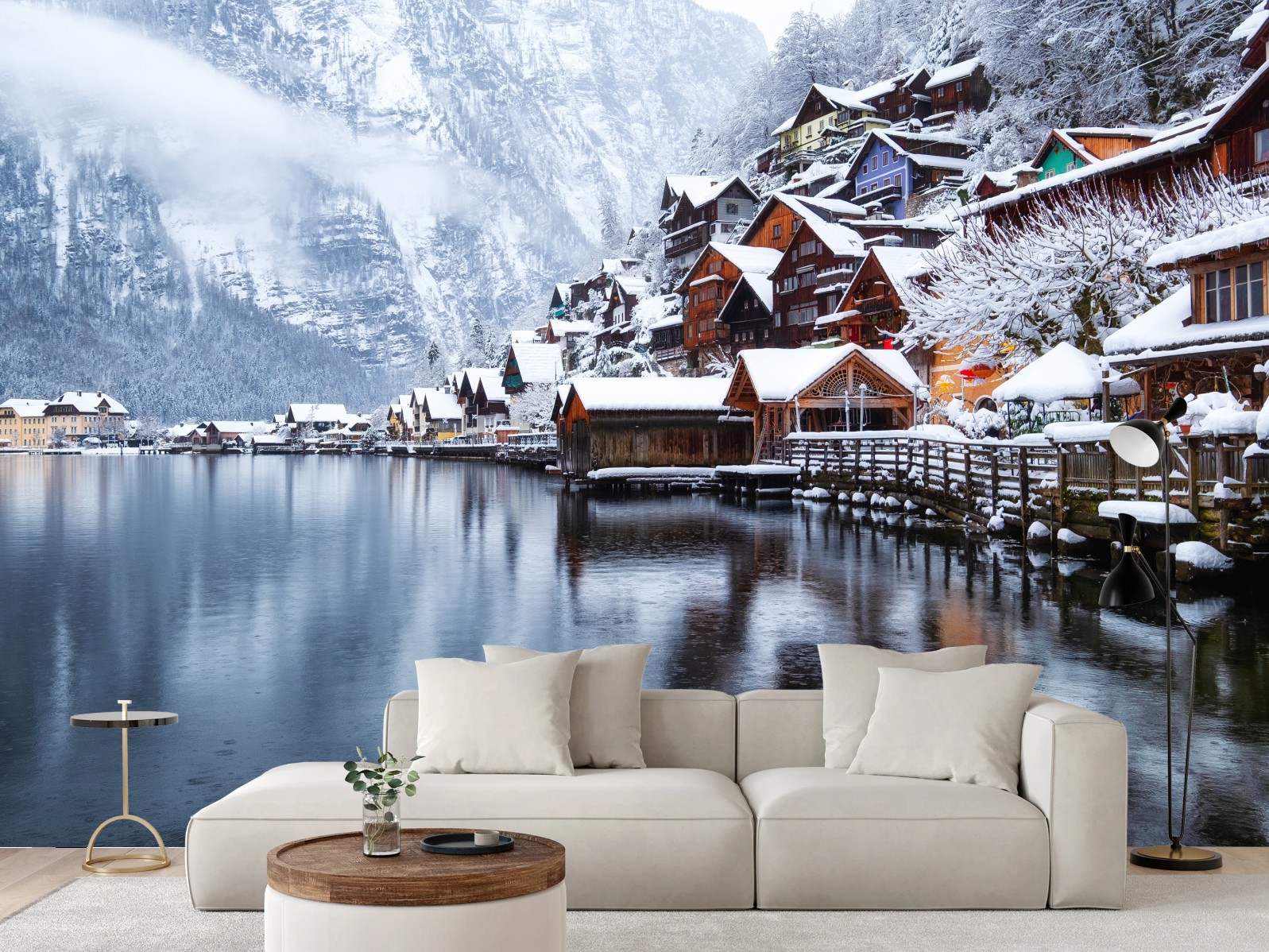 Fototapeta Śnieżna wieś Hallstatt nad jeziorem