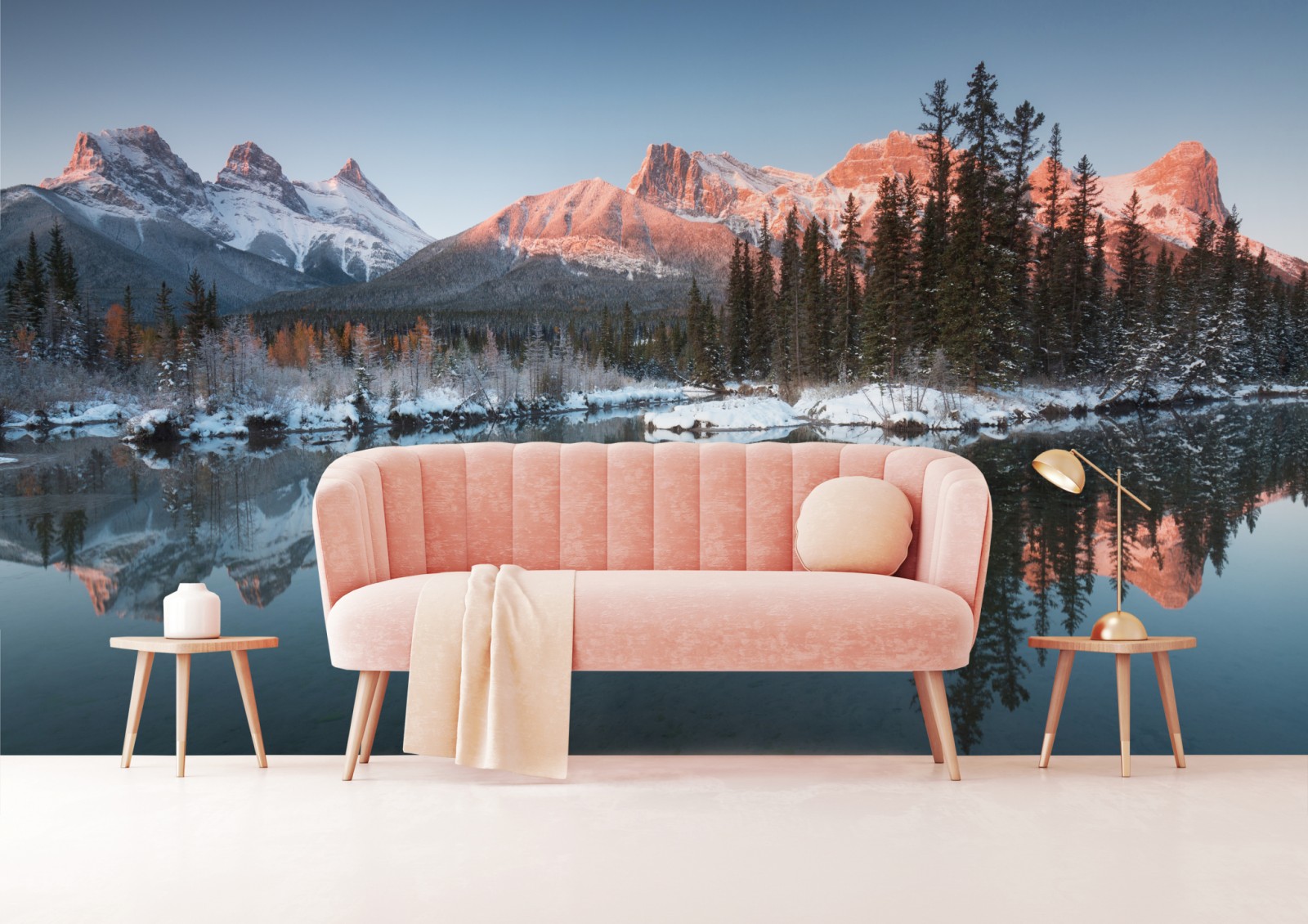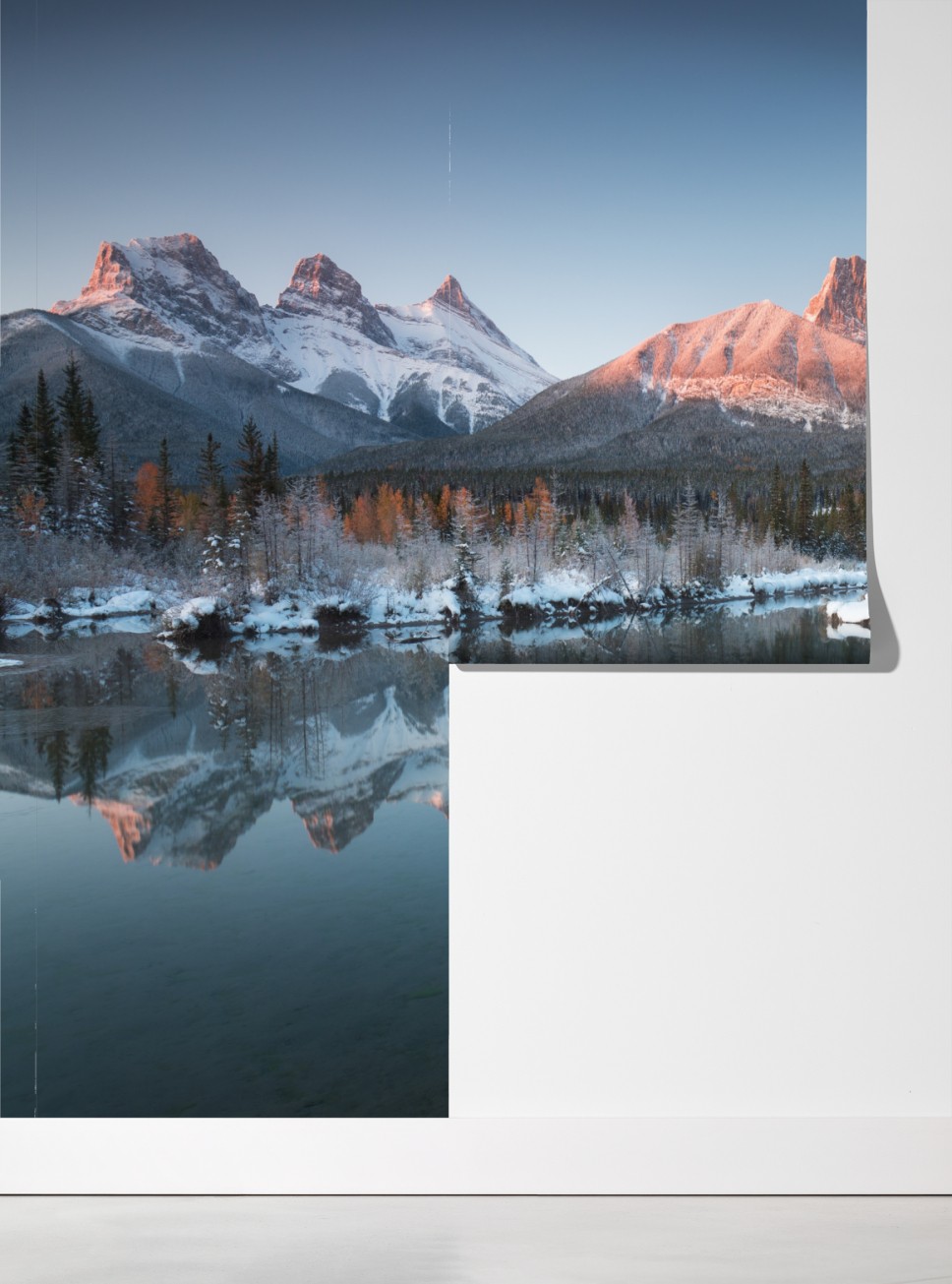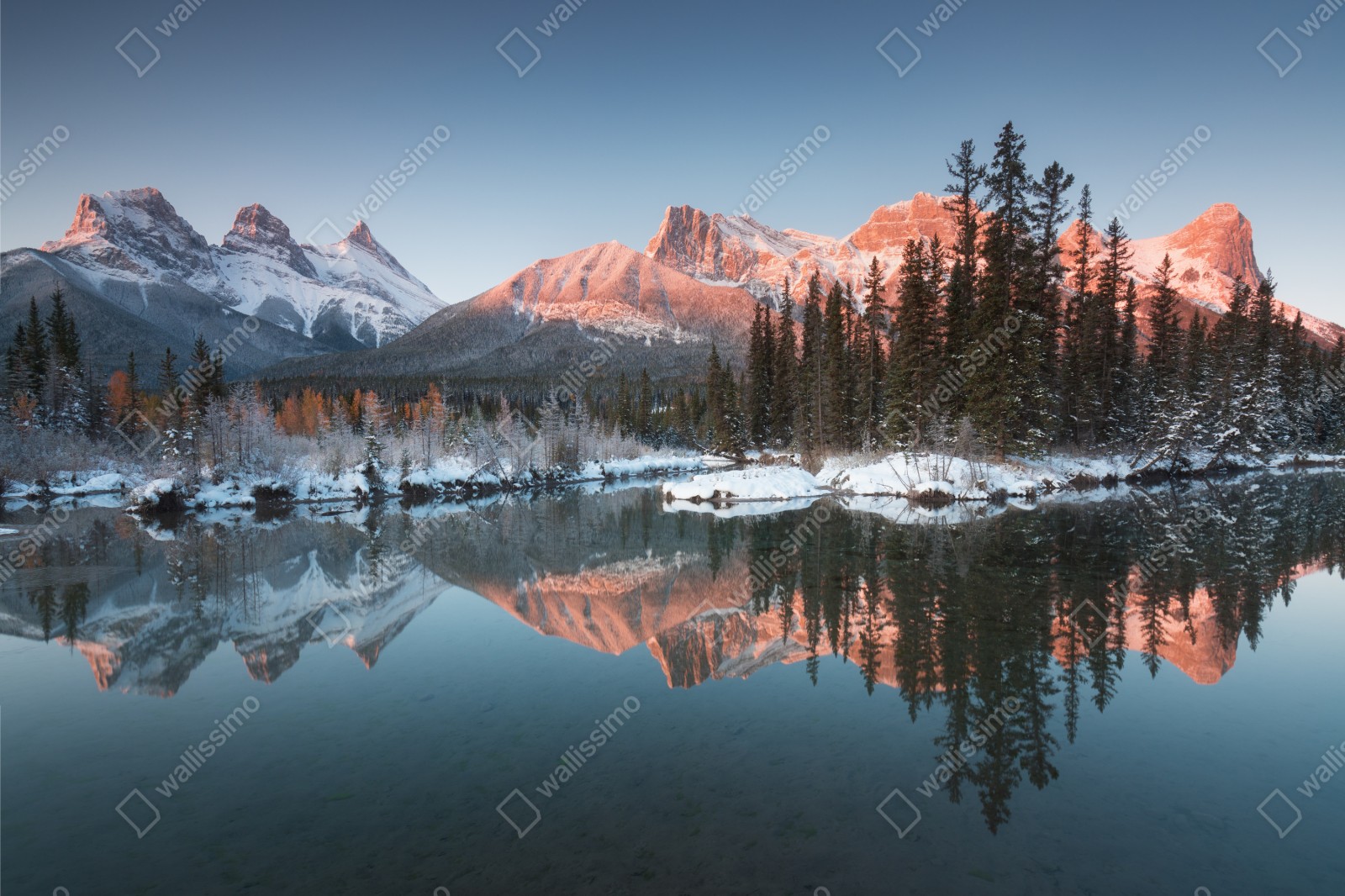 Poczuj spokój górskiego krajobrazu z odbiciem w lustrze jeziora i ciepłym porannym światłem.