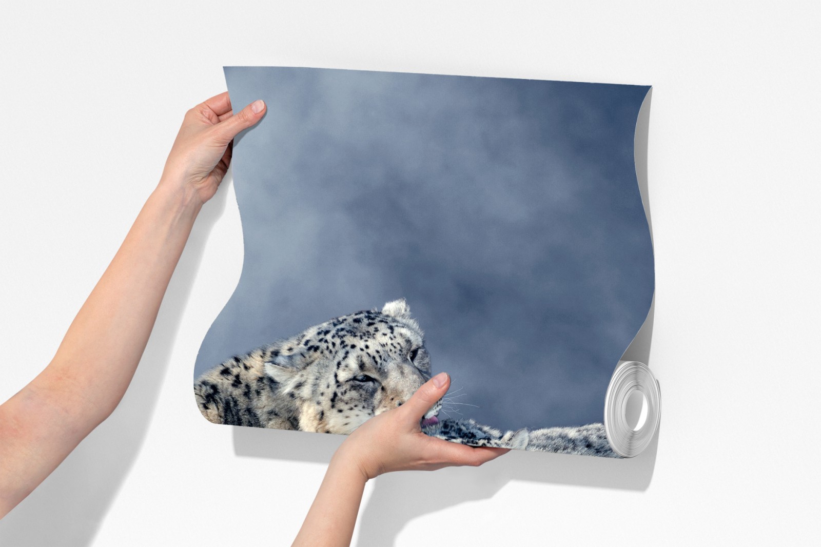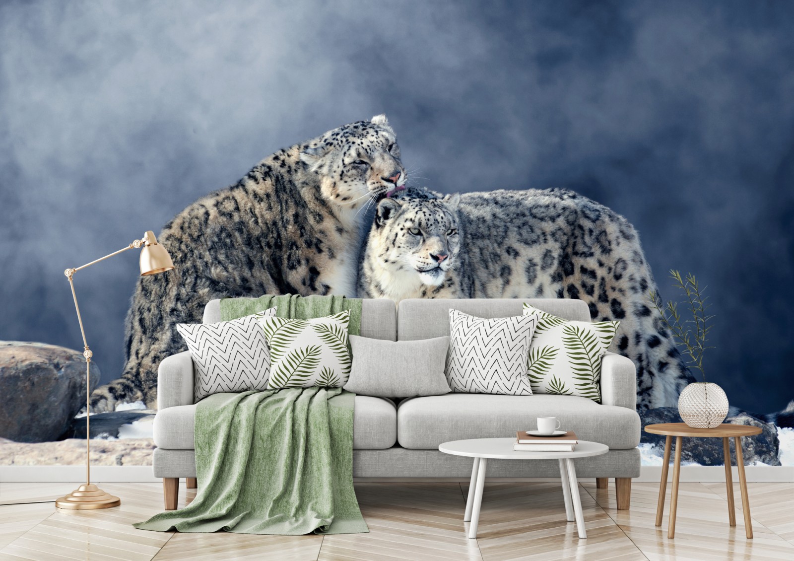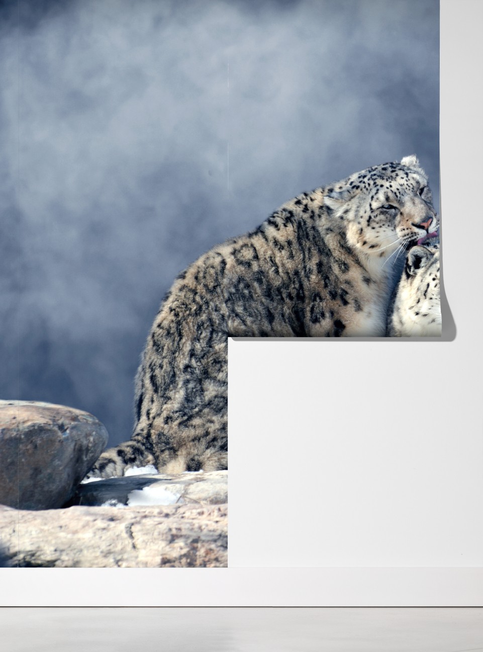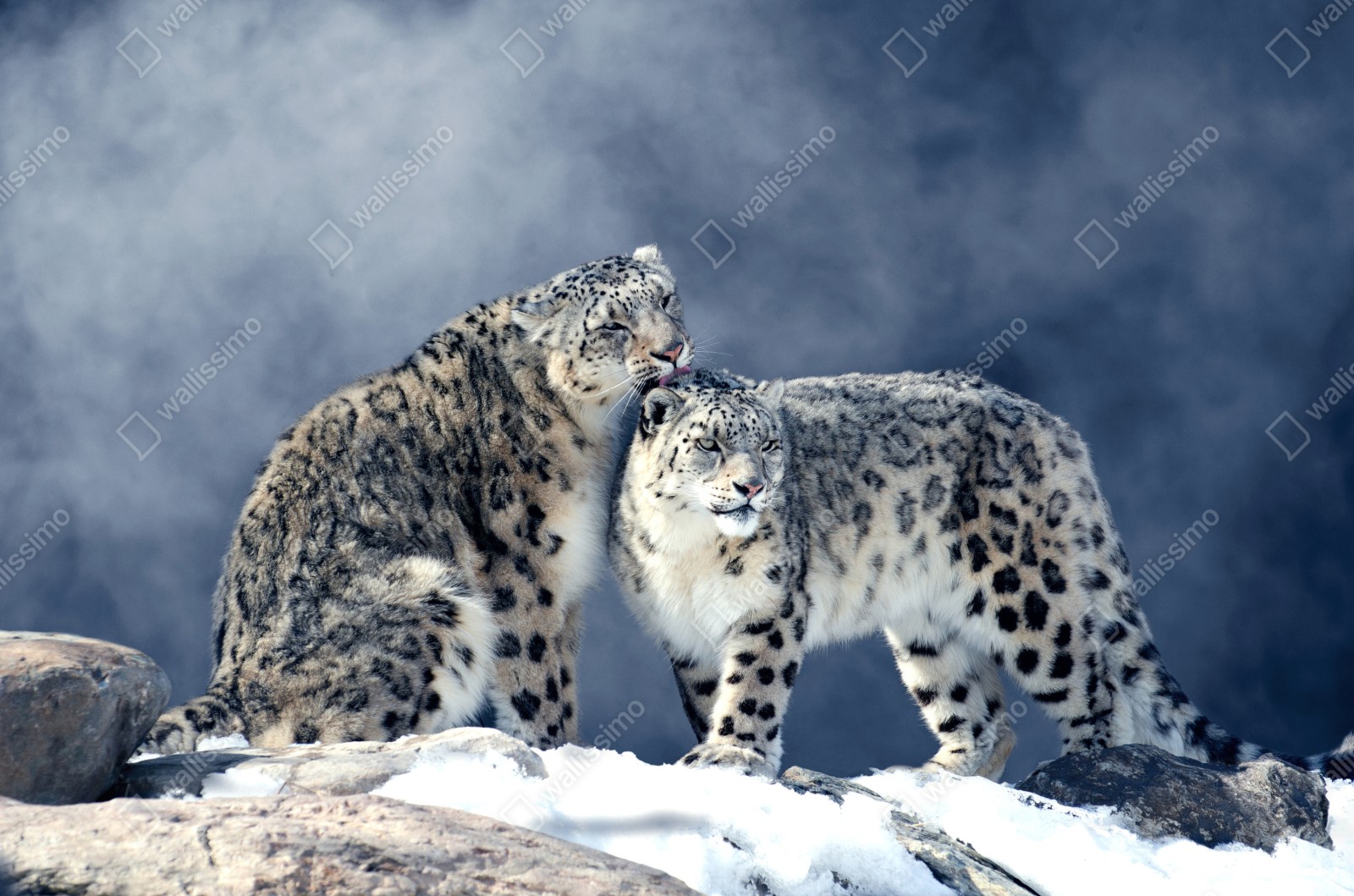 Wprowadź spokój i siłę gór do swojego wnętrza dzięki zdjęciu dwóch panter śnieżnych na śnieżnym tle.