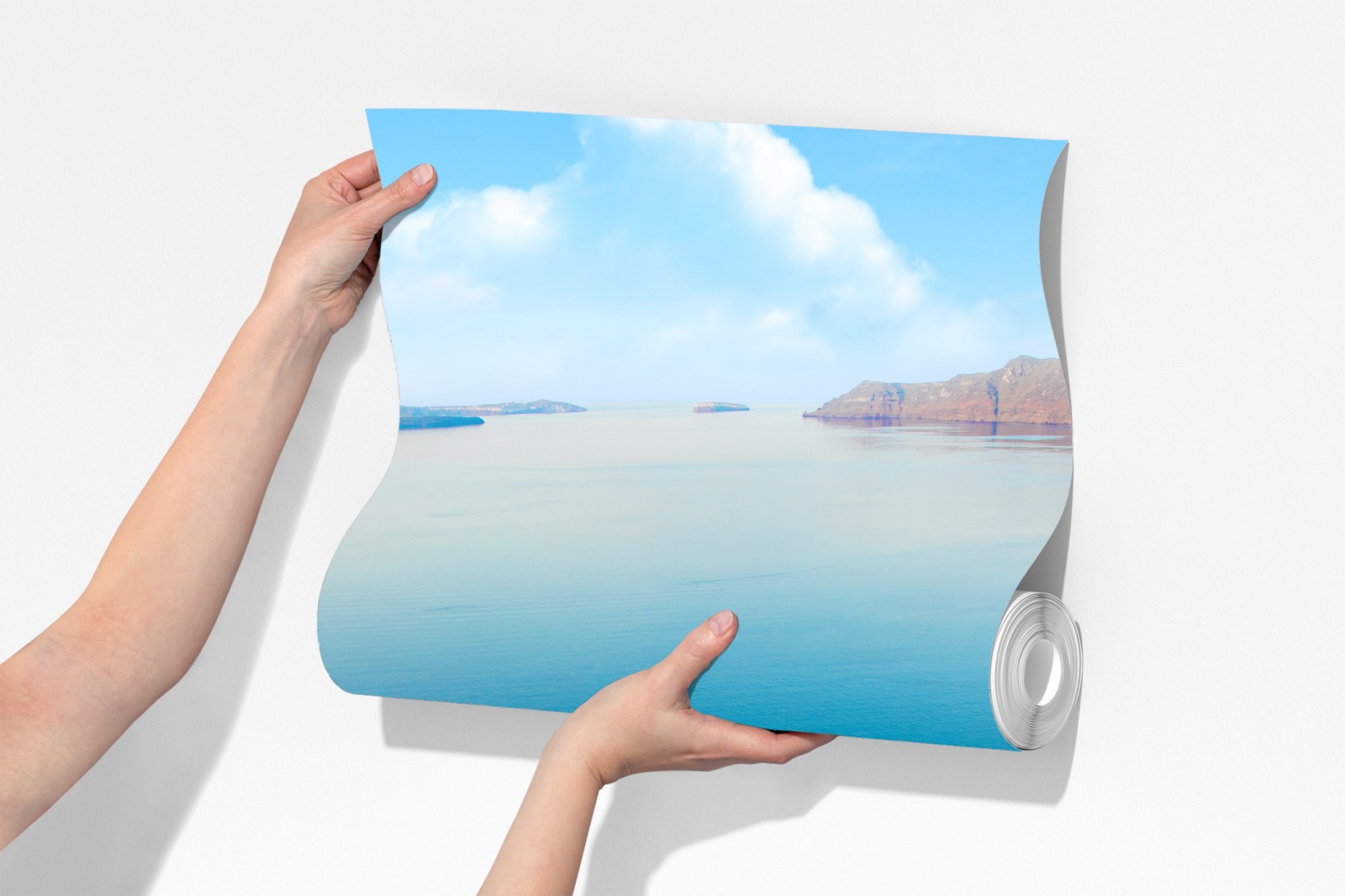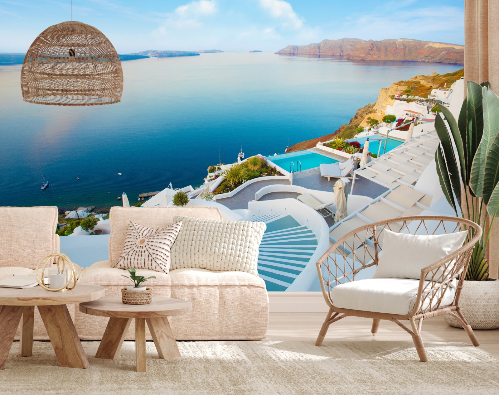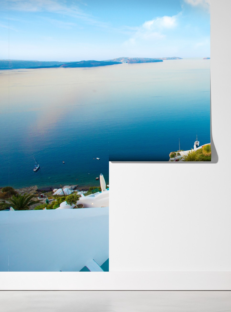 Odmień wnętrze dzięki spokojnemu panoramicznemu widokowi na morze z białą architekturą i turkusowymi wodami, idealnemu do wniesienia śródziemnomorskiego światła do każdego pokoju.