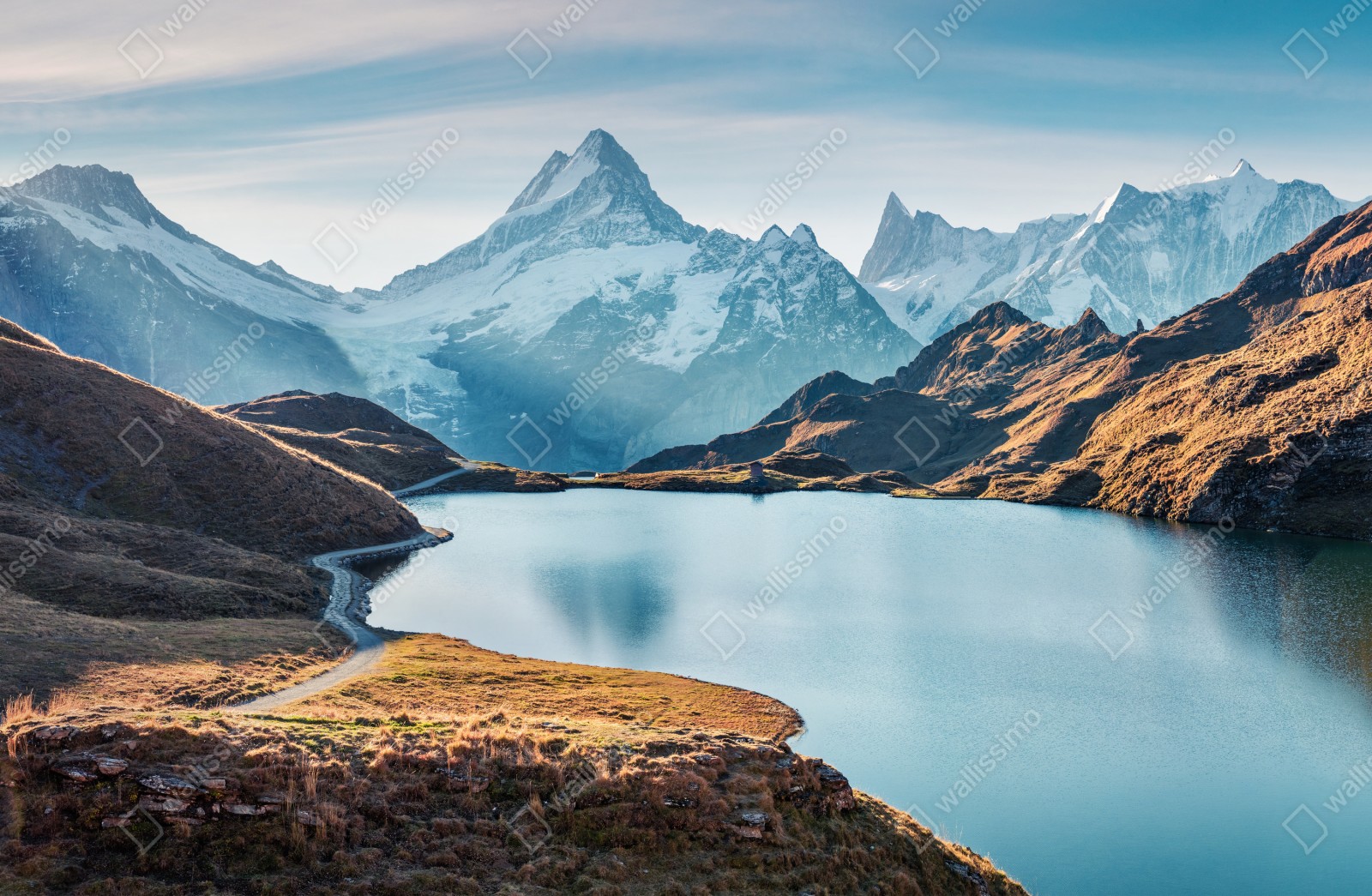 Wprowadź do wnętrza spokój Bachalpsee dzięki tej barwnej panoramie wschodu słońca w Alpach Szwajcarskich z turkusową taflą jeziora i surowymi szczytami.