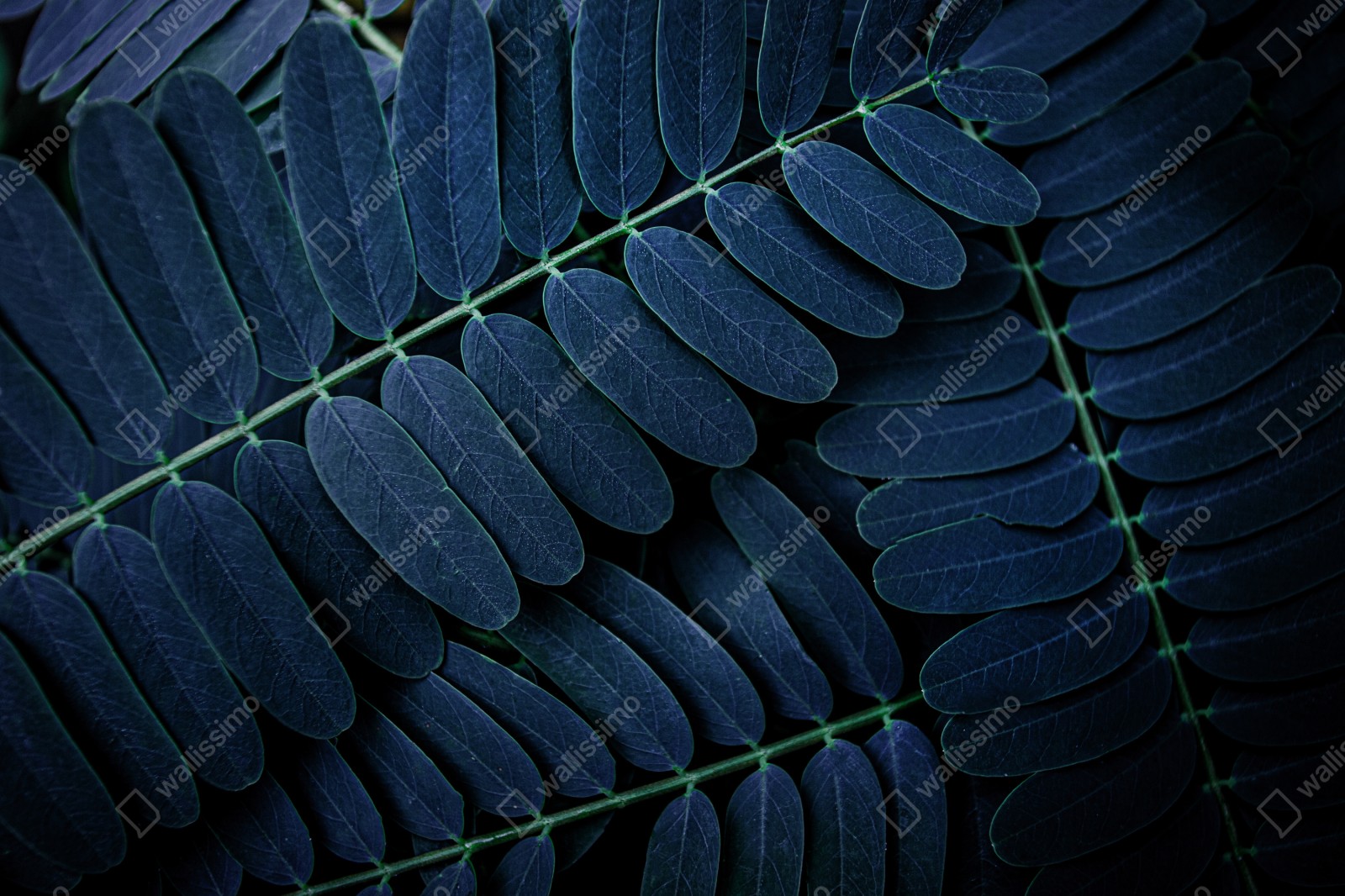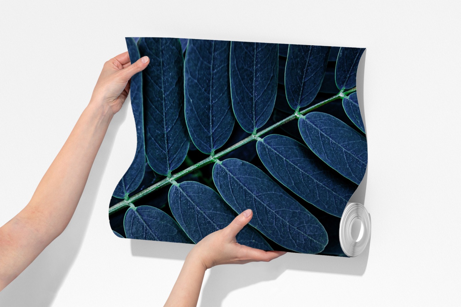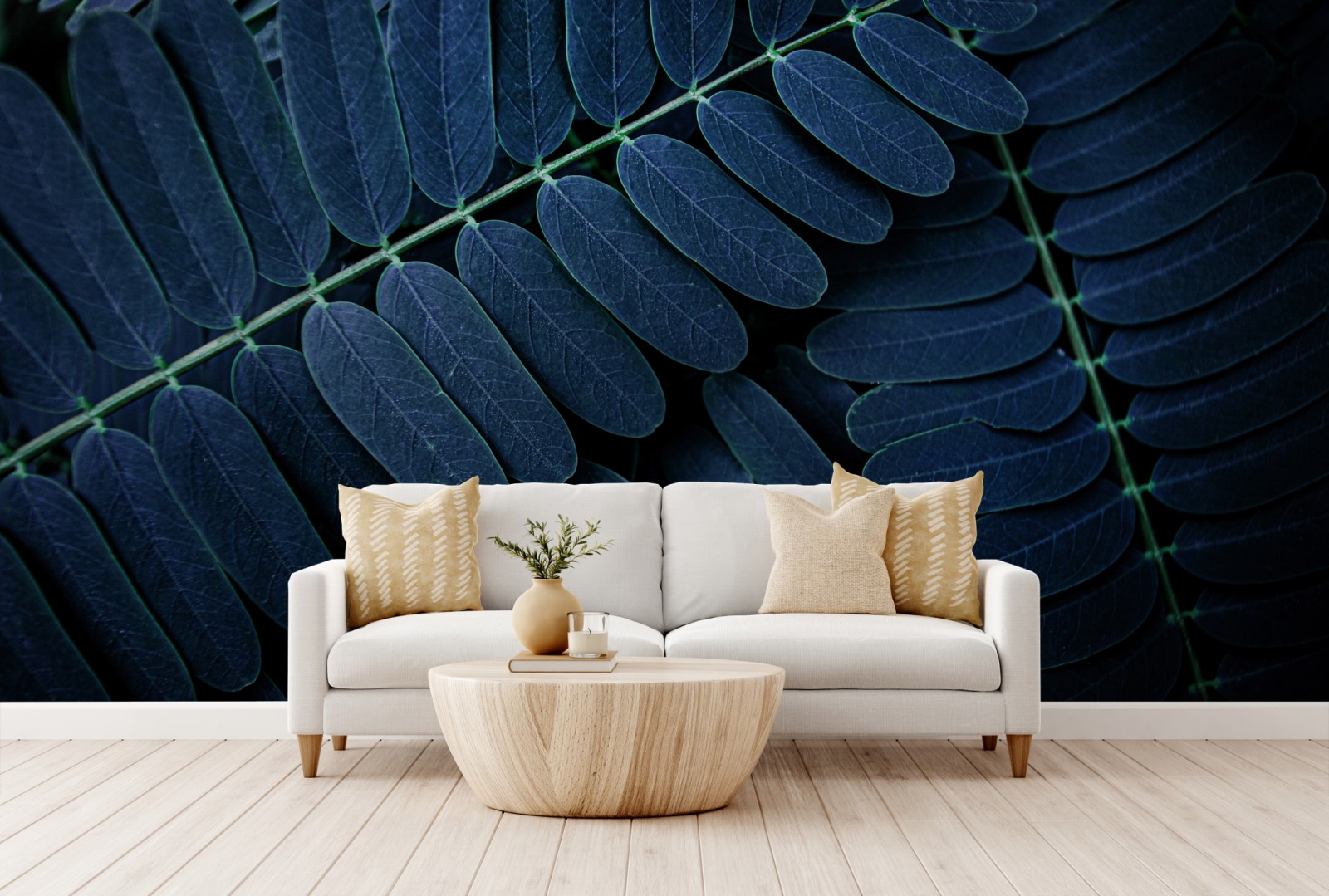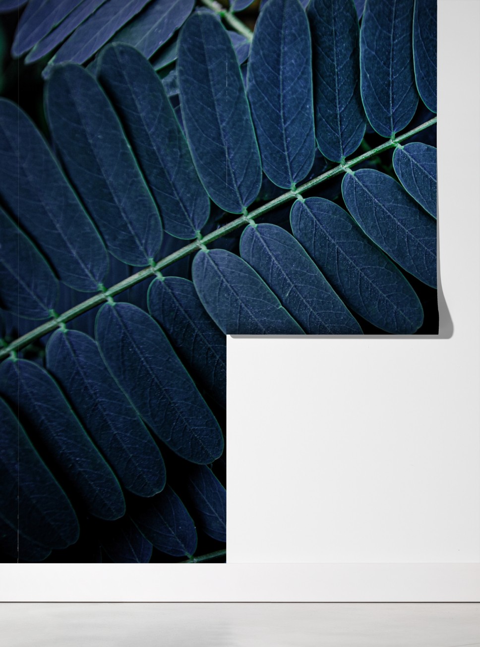Dodaj spokojnej, nowoczesnej roślinności do wnętrza dzięki temu zbliżeniu liści w głębokim niebieskim odcieniu, które podkreśla fakturę i symetrię.