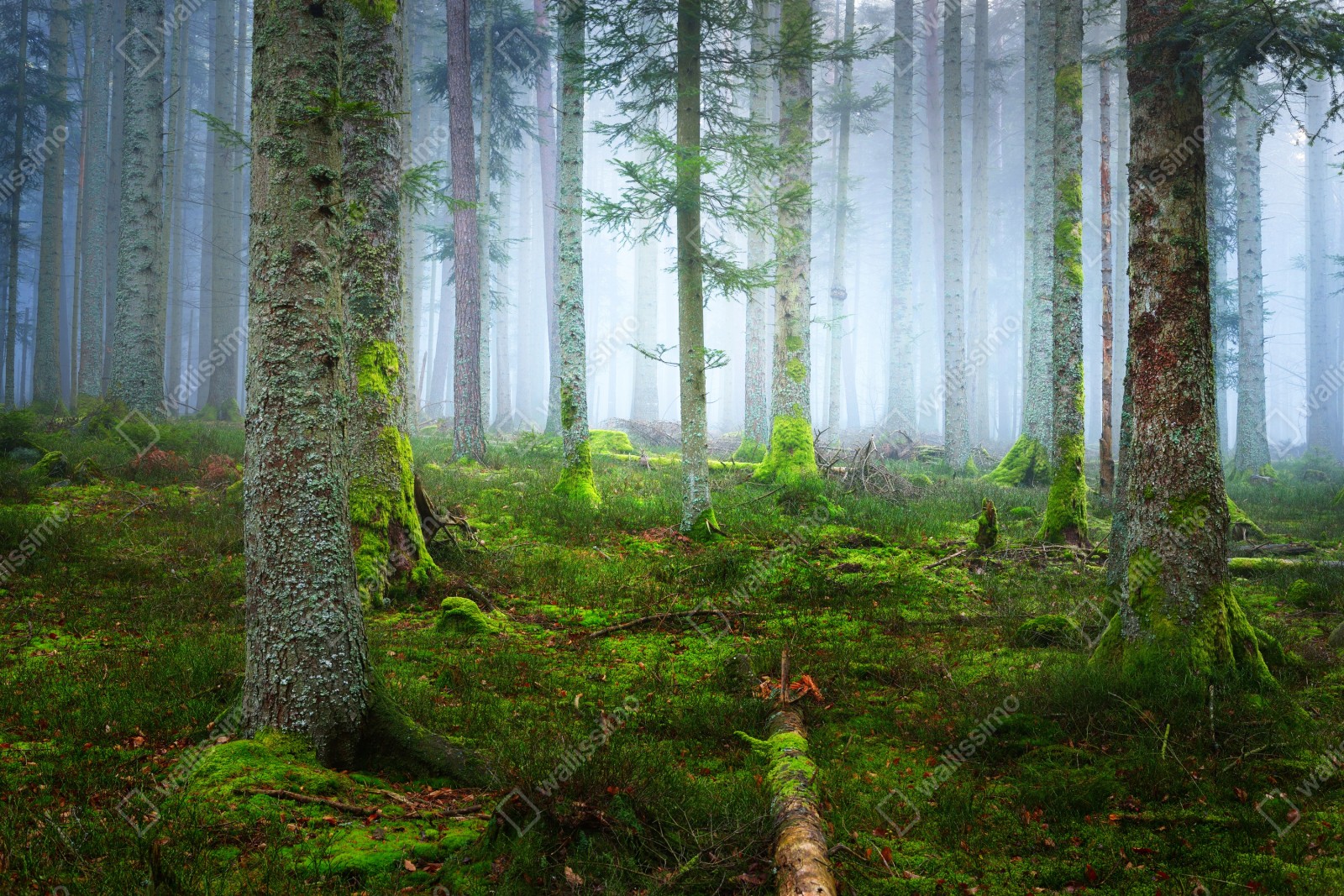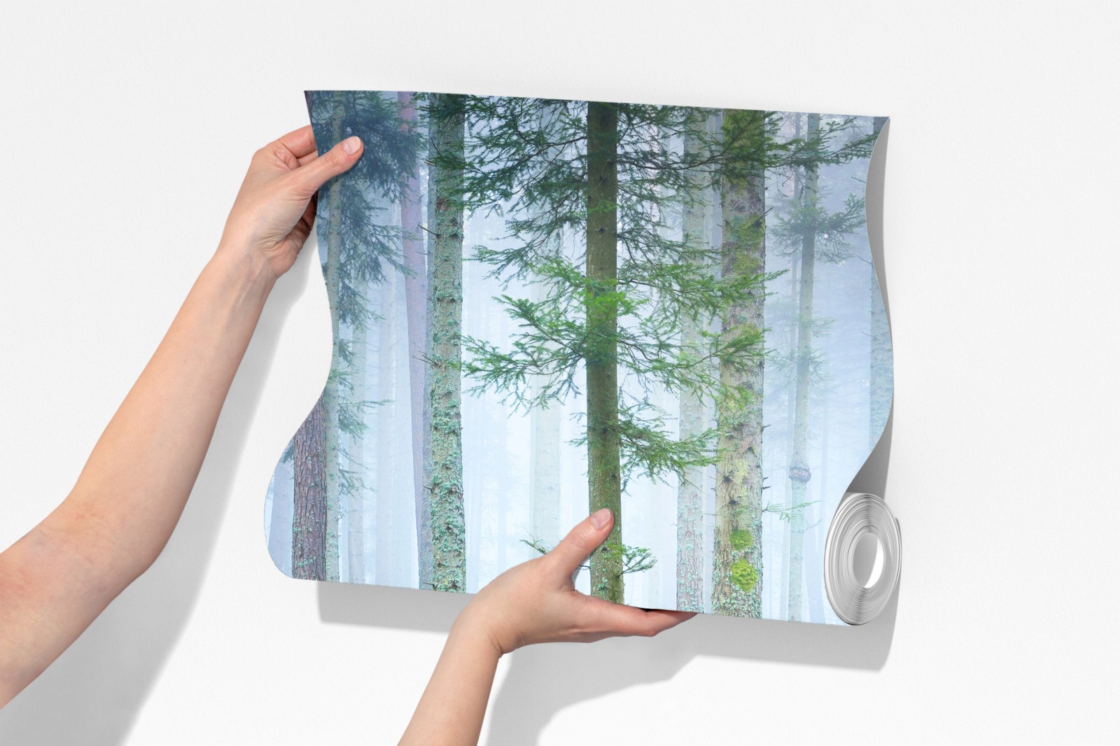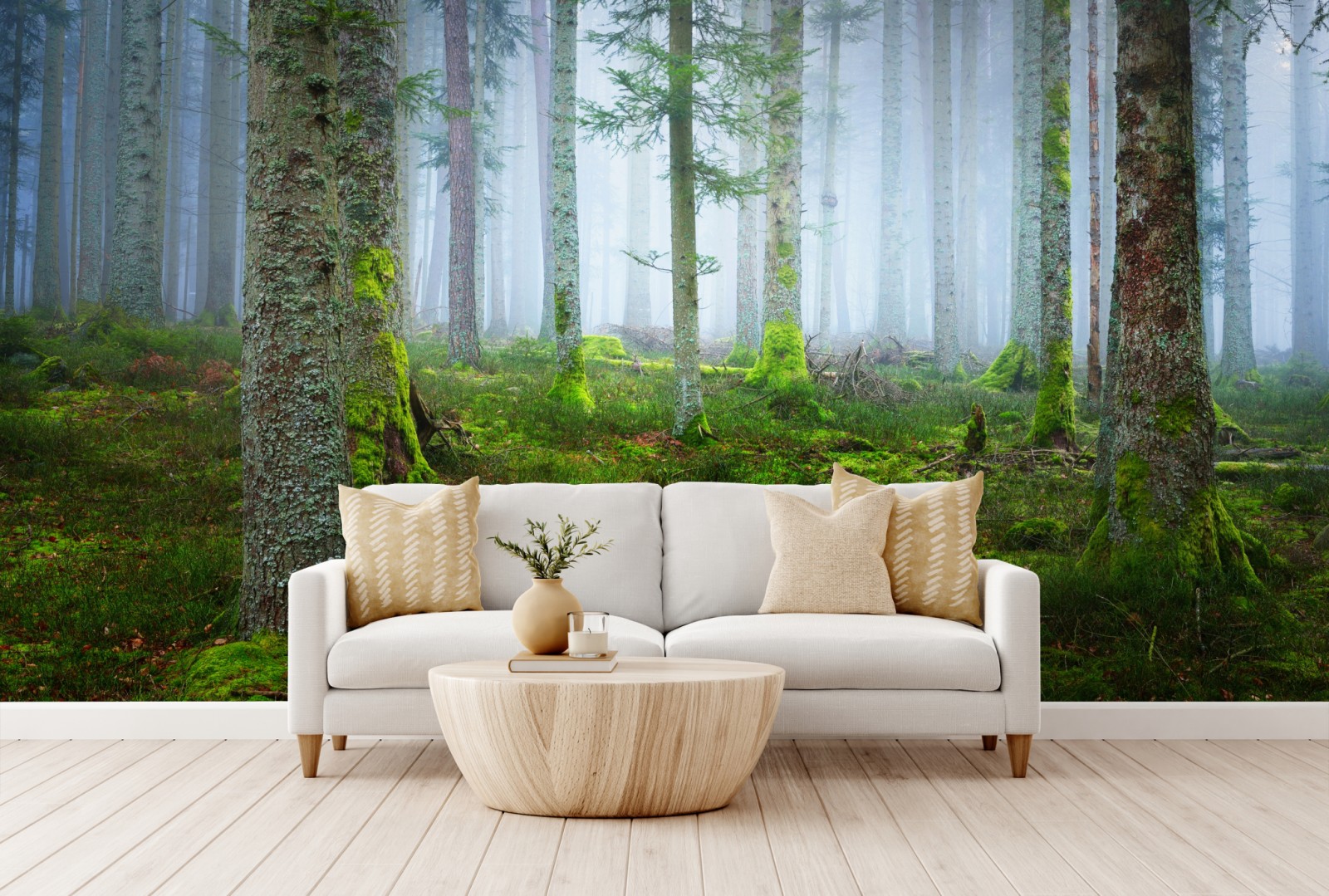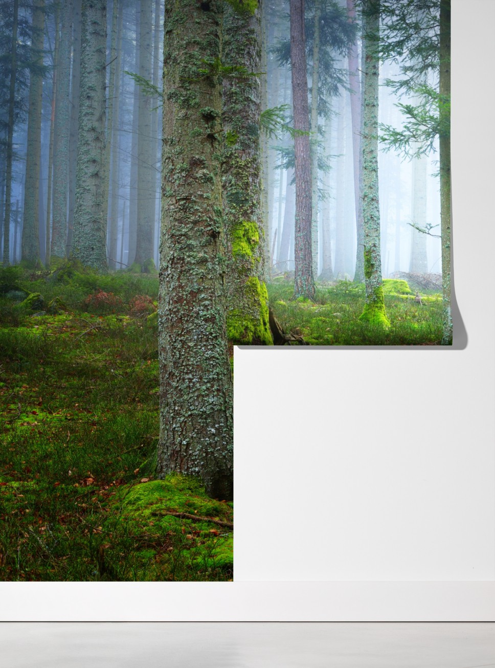Dodaj do wnętrza spokój i naturalne piękno dzięki temu mglistemu lasowi sosnowemu z Alzacji, z miękką mgłą i soczystą zielenią mchu.