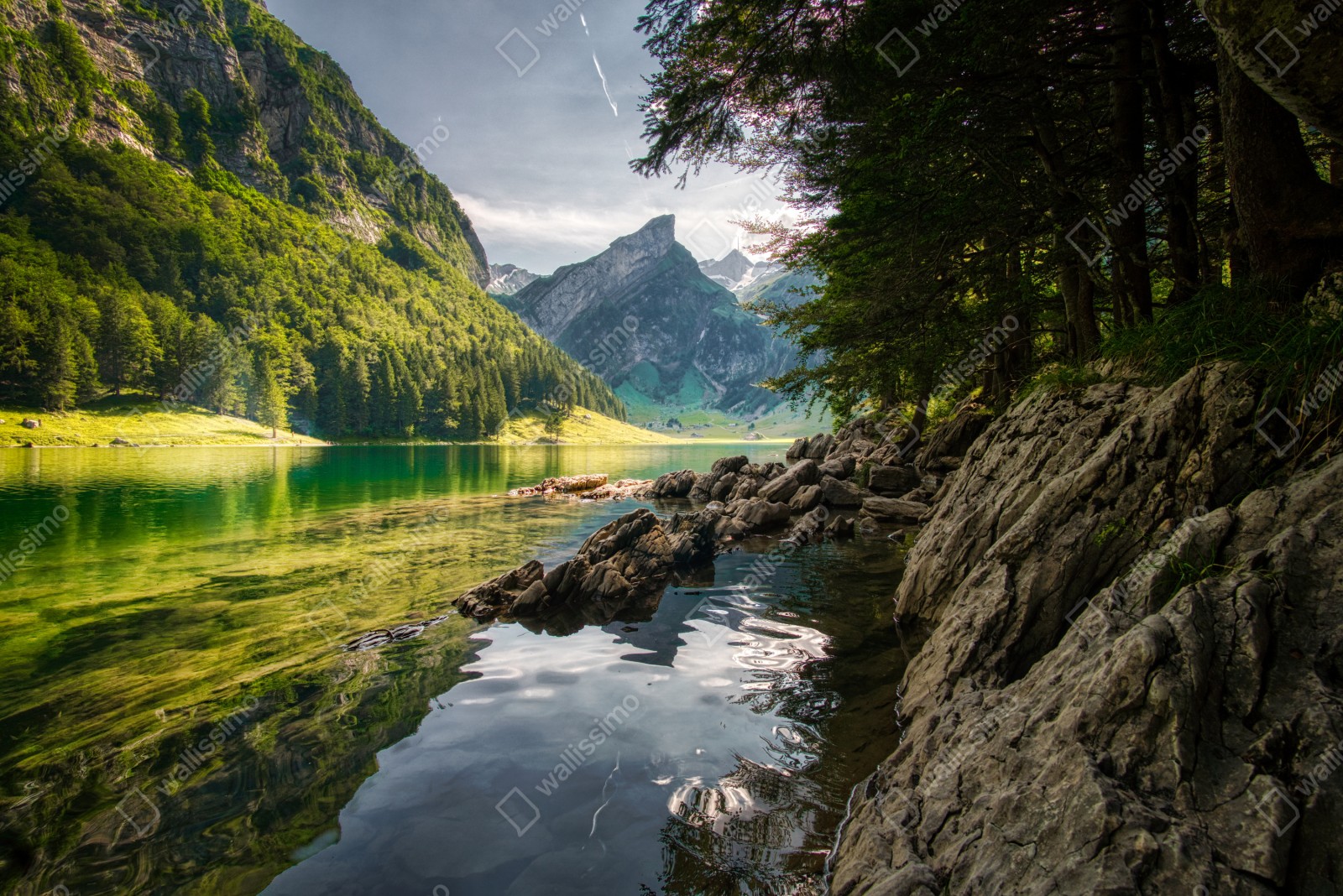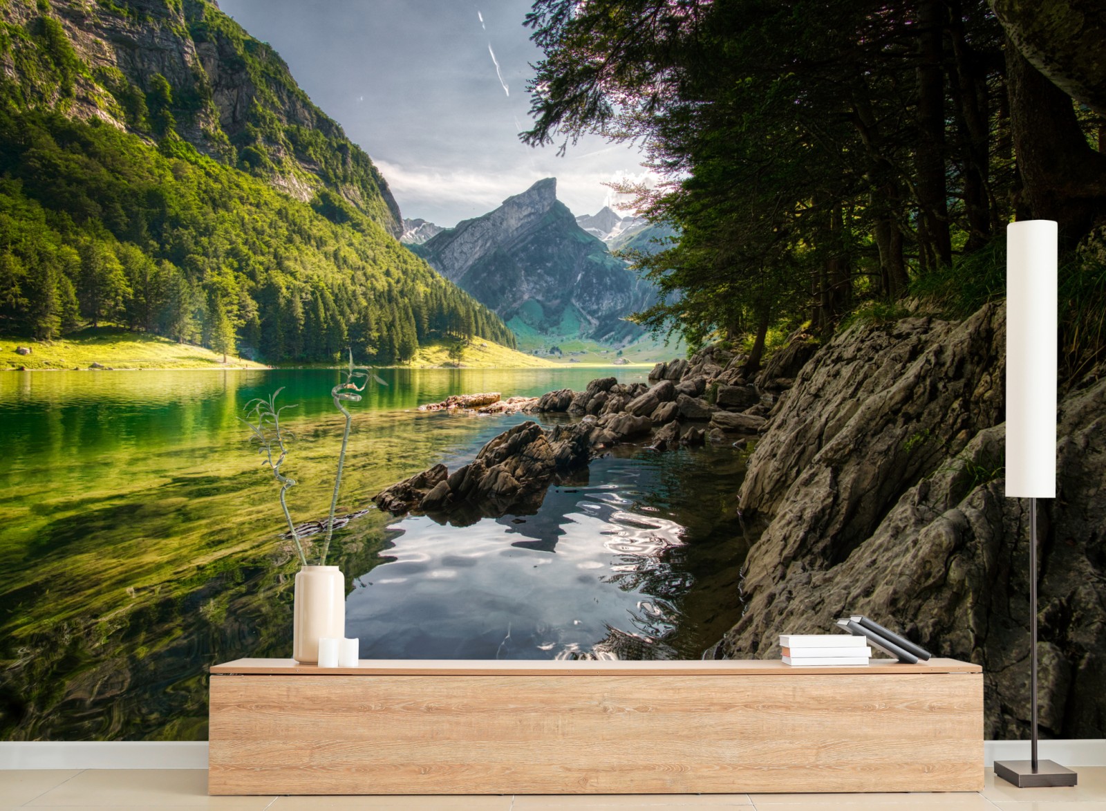 Poczuj spokój przy górskim jeziorze o zielonych wodach i malowniczych odbiciach otaczającego lasu.