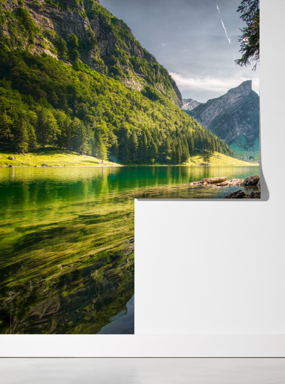 Fototapeta Spokojne górskie jezioro z odbiciami lasu