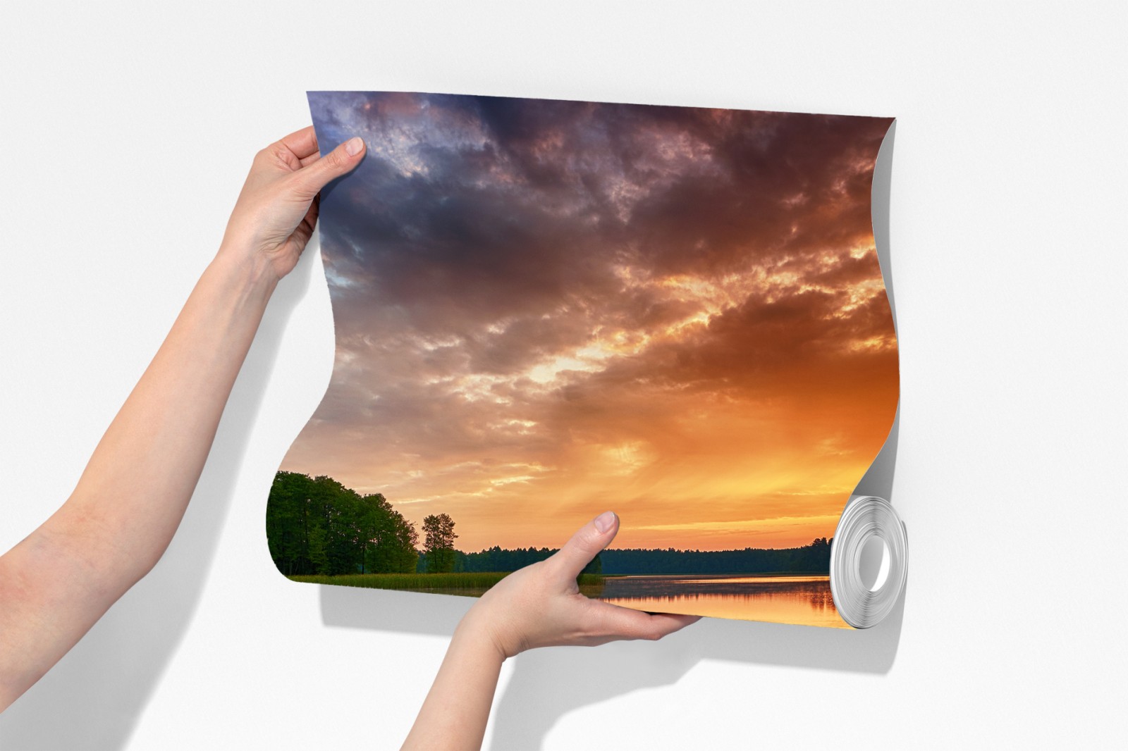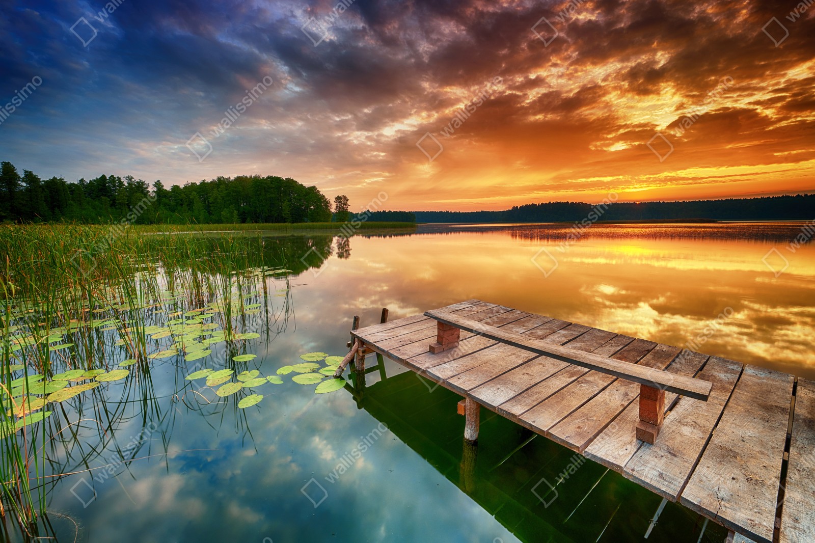 Przenieś spokój poranka do domu dzięki złotemu wschodowi słońca nad spokojnym jeziorem, idealnemu do ocieplenia wnętrza.