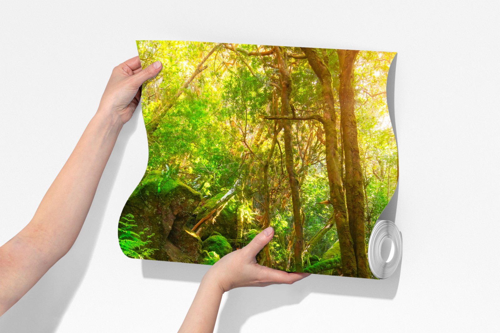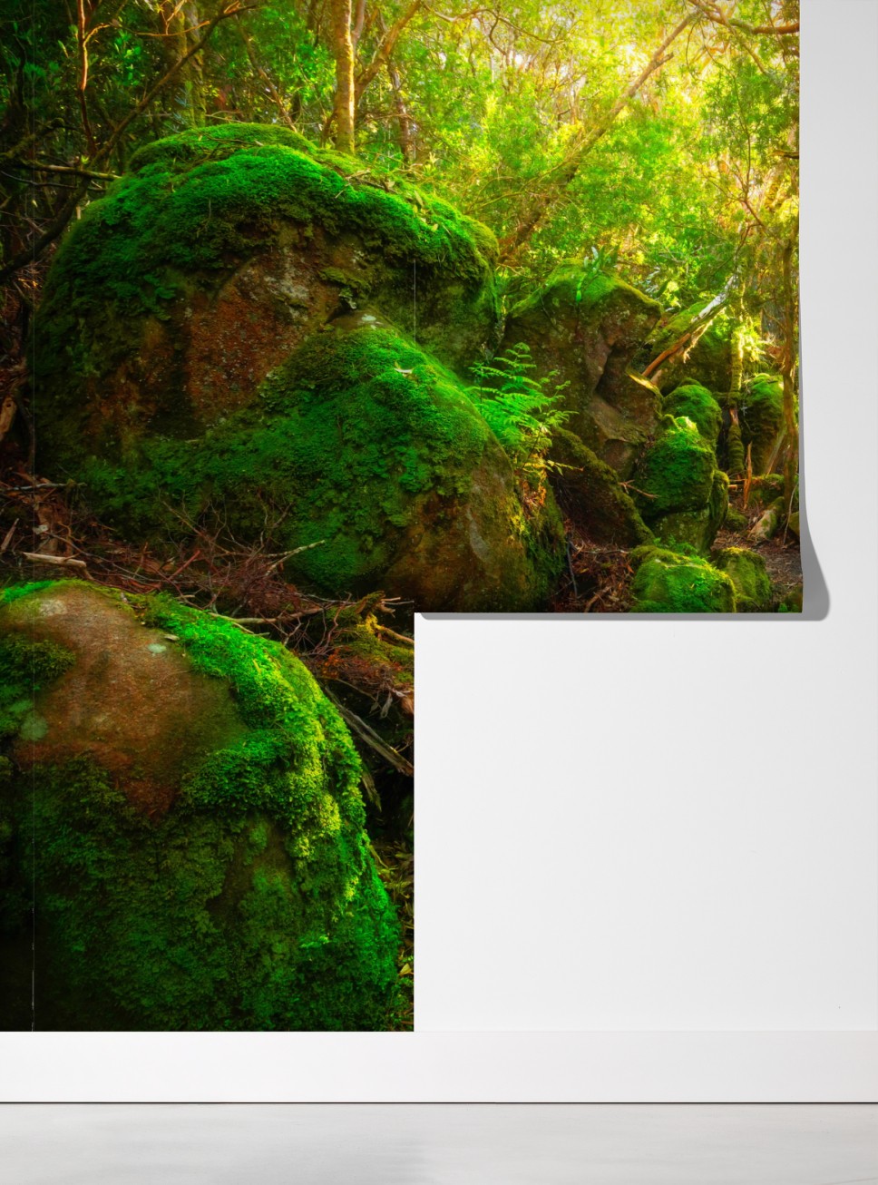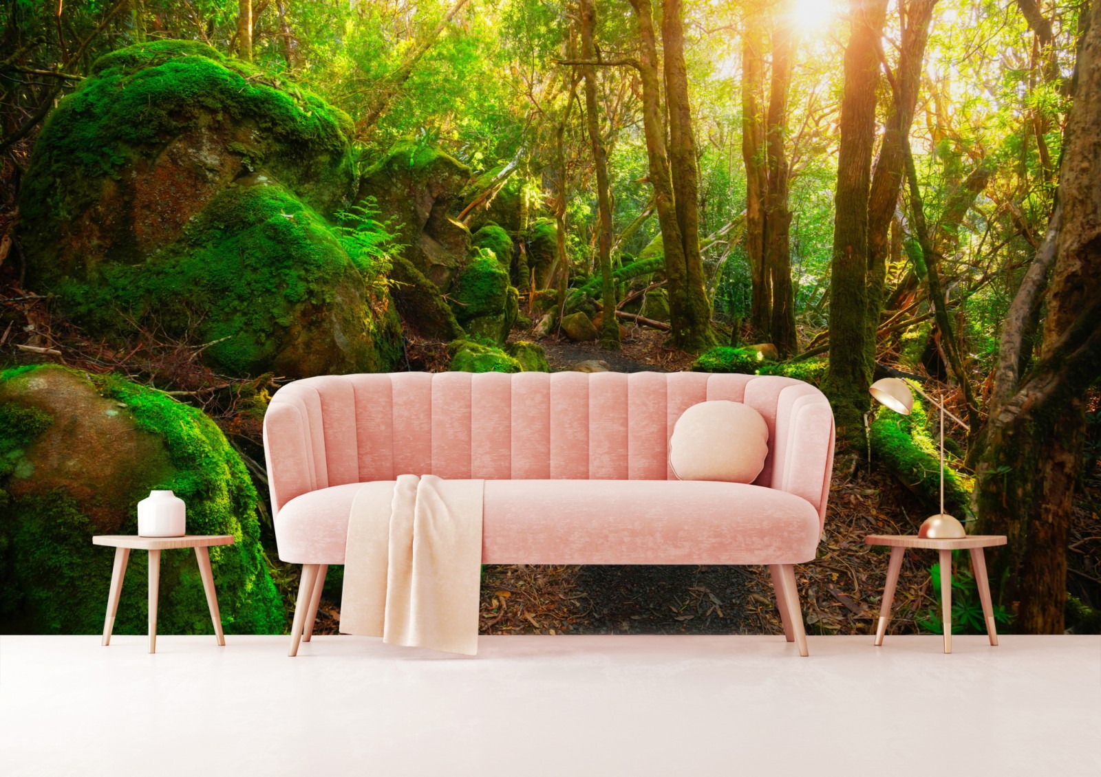 Wprowadź spokój i świeżość tasmańskiego lasu deszczowego do wnętrza dzięki tej klimatycznej scenie ścieżki o złocistym świetle.