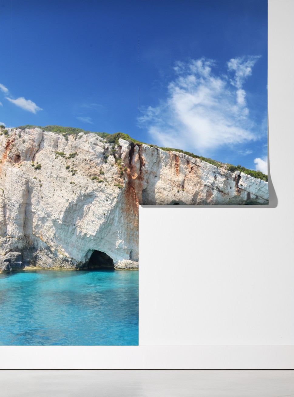 Wprowadź spokojne turkusowe wody i dramatyczne wapienne klify Zakynthos do swojego wnętrza dzięki temu żywemu zdjęciu wybrzeża.