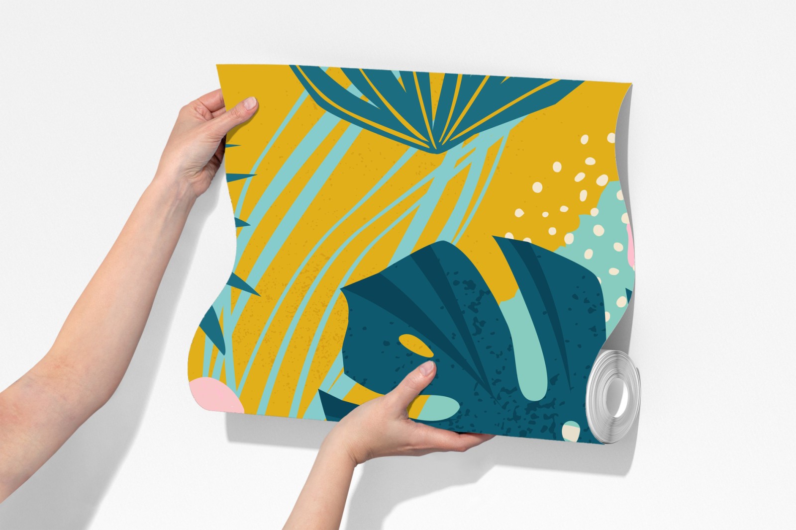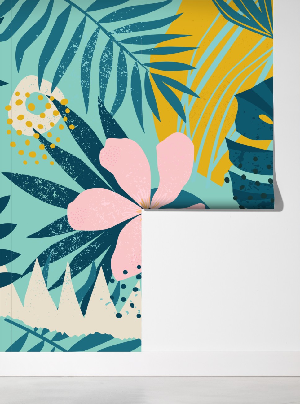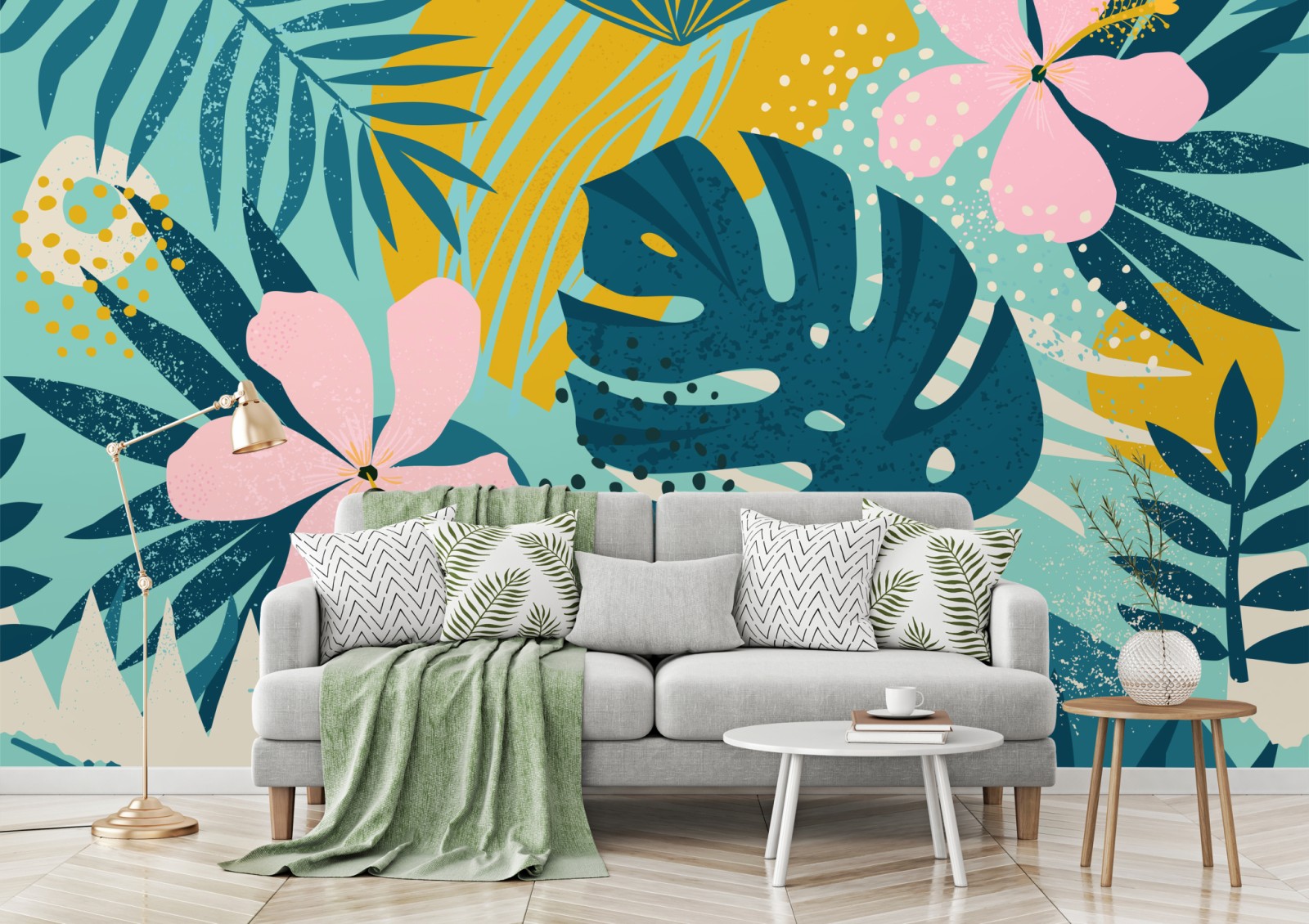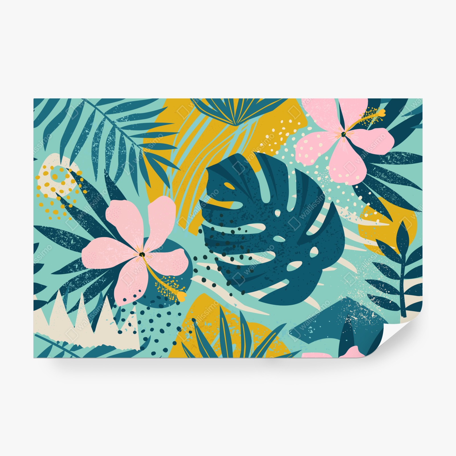 Wprowadź tropikalną energię do wnętrza dzięki tej kolorowej ilustracji botanicznej z wyrazistymi liśćmi monstera i delikatnymi różowymi kwiatami.